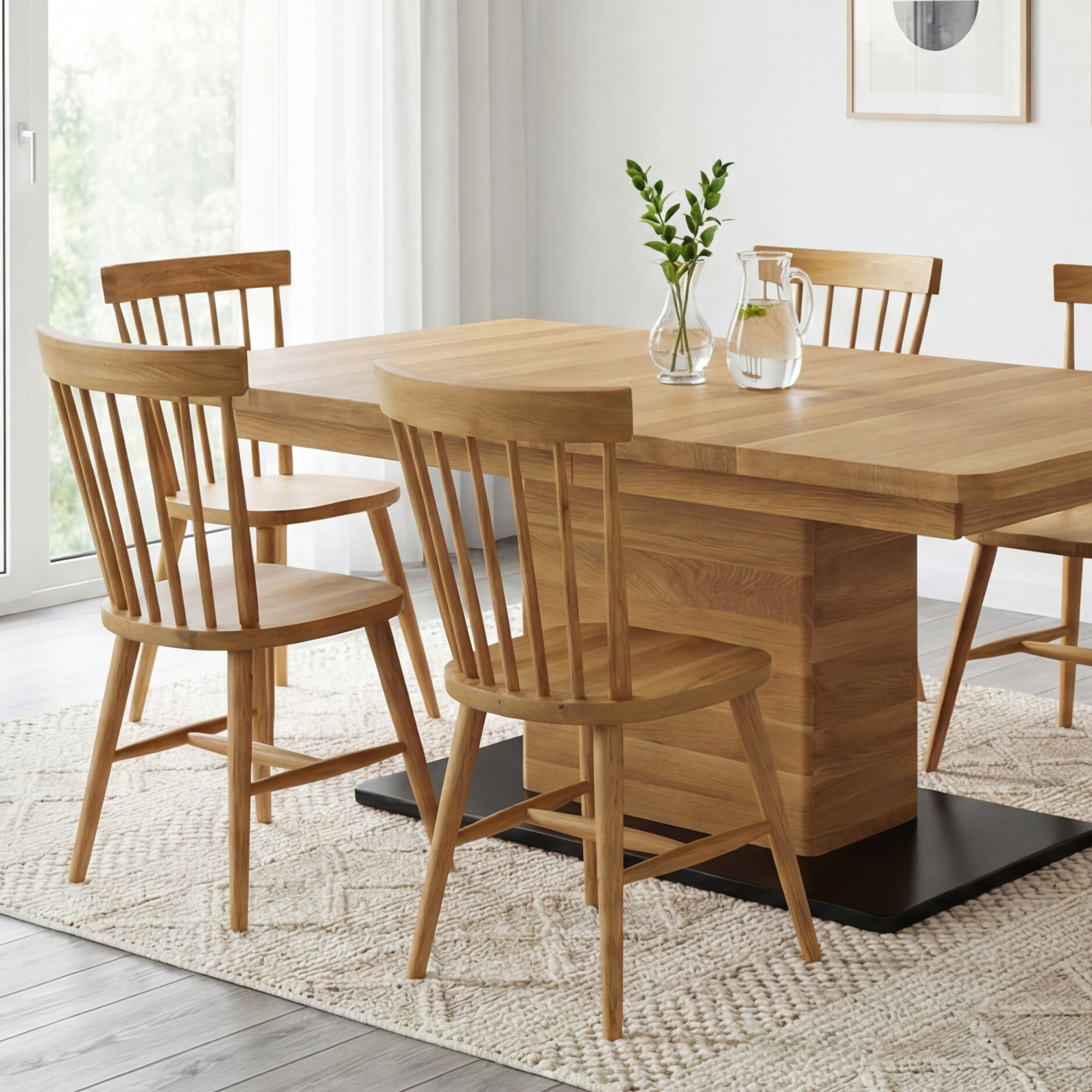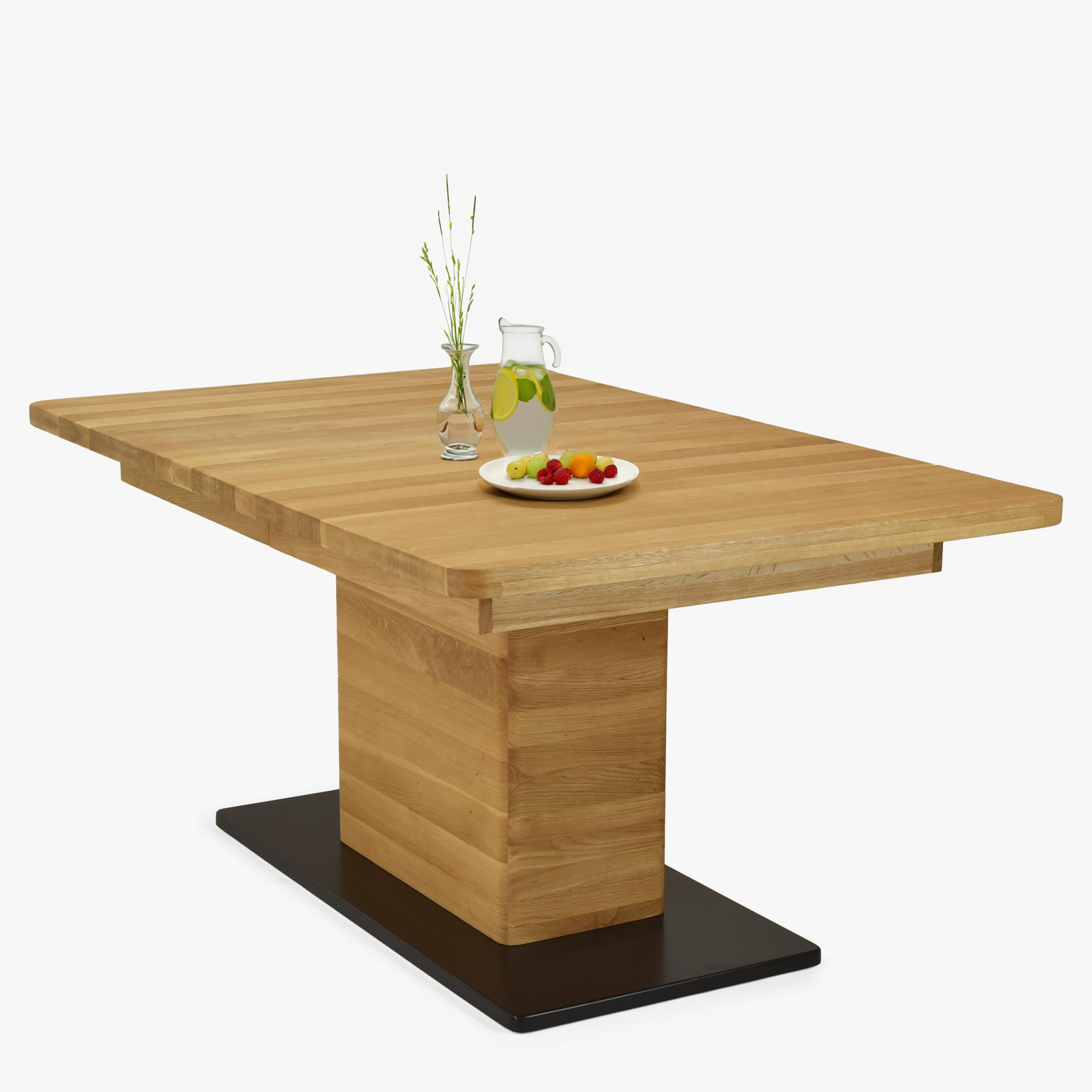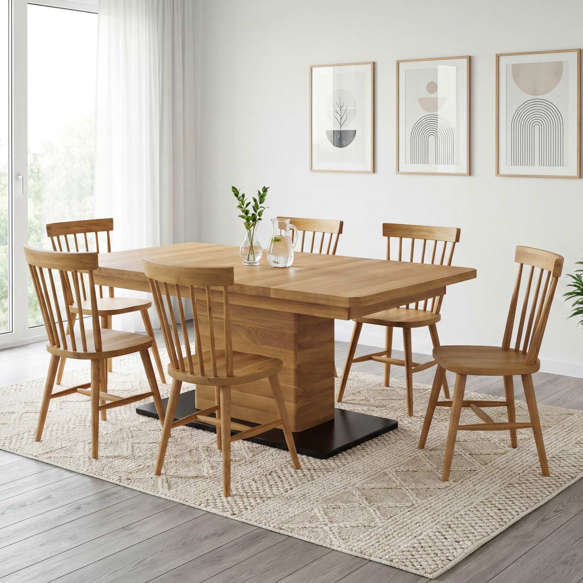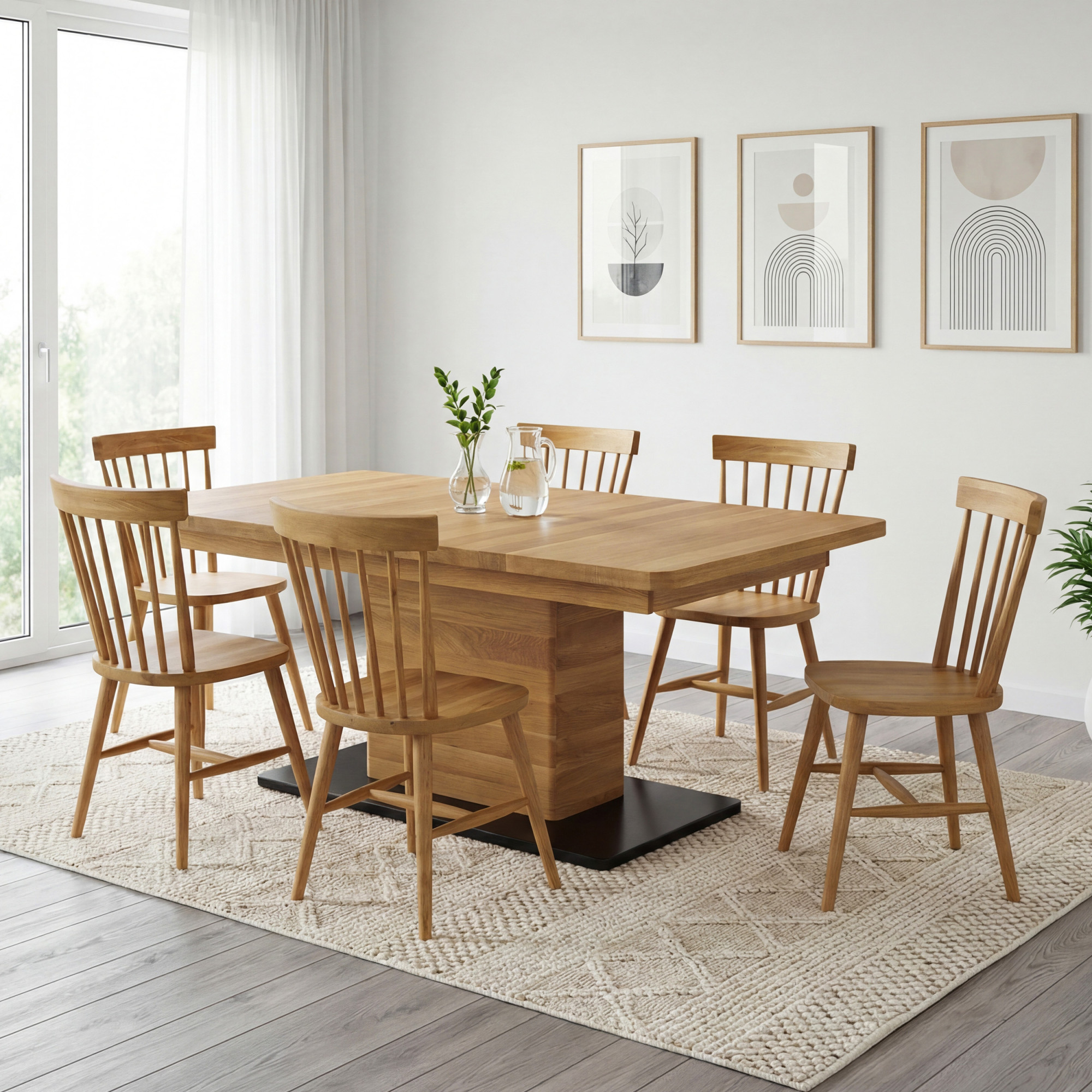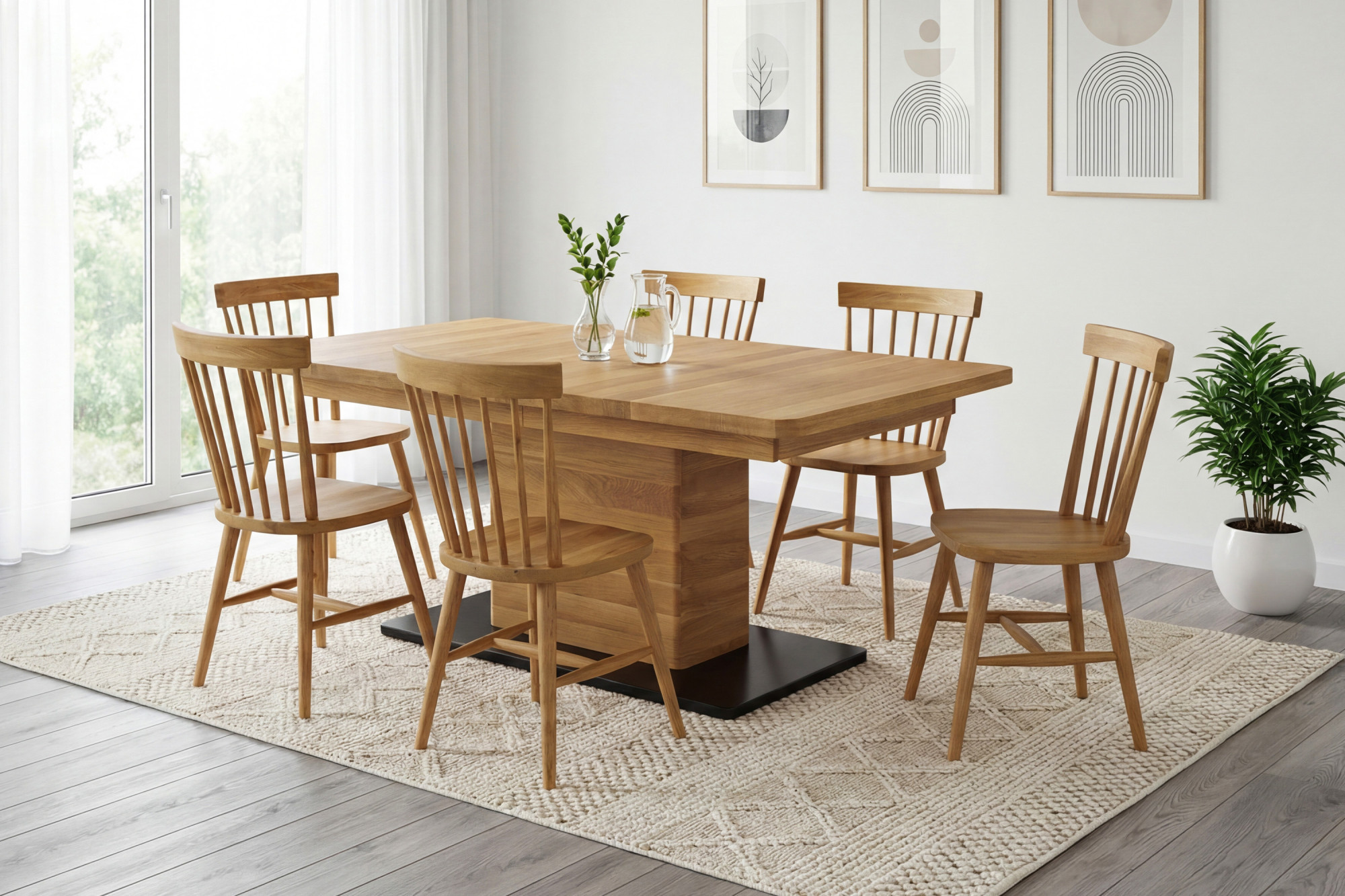 Der Tisch ist aus hochwertigem Eichenholz gefertigt, das mit dänischem Naturöl Woca behandelt wurde, was seine lange Haltbarkeit und Widerstandsfähigkeit gewährleistet. Das Hauptmerkmal dieses Tisches ist sein zentraler Fuß, der auf einem stabilen schwarzen Sockel sitzt. Diese Lösung ermöglicht nicht nur maximalen Sitzkomfort, sondern verleiht dem Tisch auch ein modernes, minimalistisches Aussehen.
