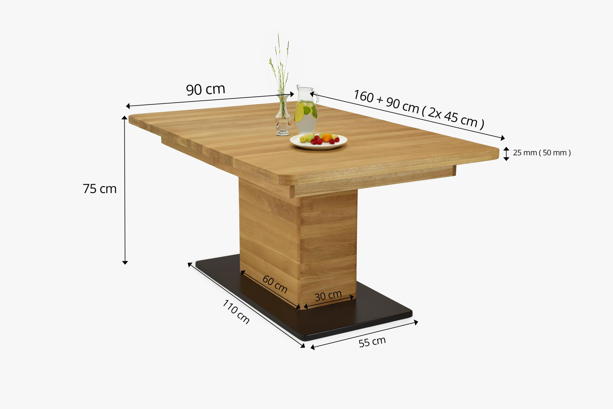 Der Tisch bietet eine Ausziehfunktion, die Sie vor allem bei Familientreffen oder Gästen zu schätzen wissen. Die Grundgröße des Tisches beträgt 160 x 90 cm, was ideal für den täglichen Gebrauch ist. Nach dem Ausziehen, wenn ein oder zwei Einsätze hinzugefügt werden, kann der Tisch eine Länge von 205 cm oder 250 cm erreichen und bietet somit Platz für bis zu 10 Personen. Der Ausziehmechanismus ist sorgfältig in der mittleren Tischplatte verborgen, sodass die Ästhetik nicht gestört wird und er unauffällig bleibt, wenn er nicht benötigt wird. Die Tischhöhe beträgt 75 cm und die Platte hat eine Stärke von 25 mm, wobei die Optik der Tischkante durch eine Bearbeitung mit bis zu 50 mm besonders massiv erscheint.