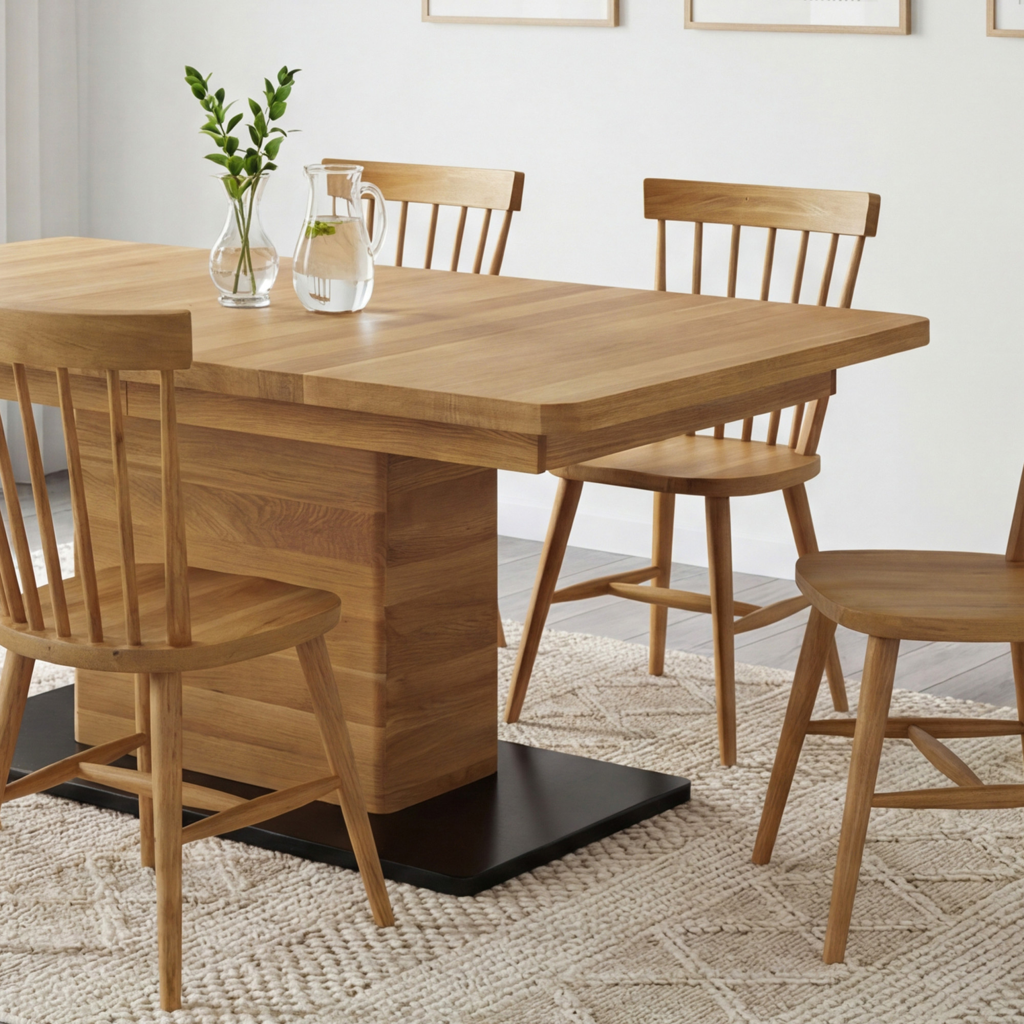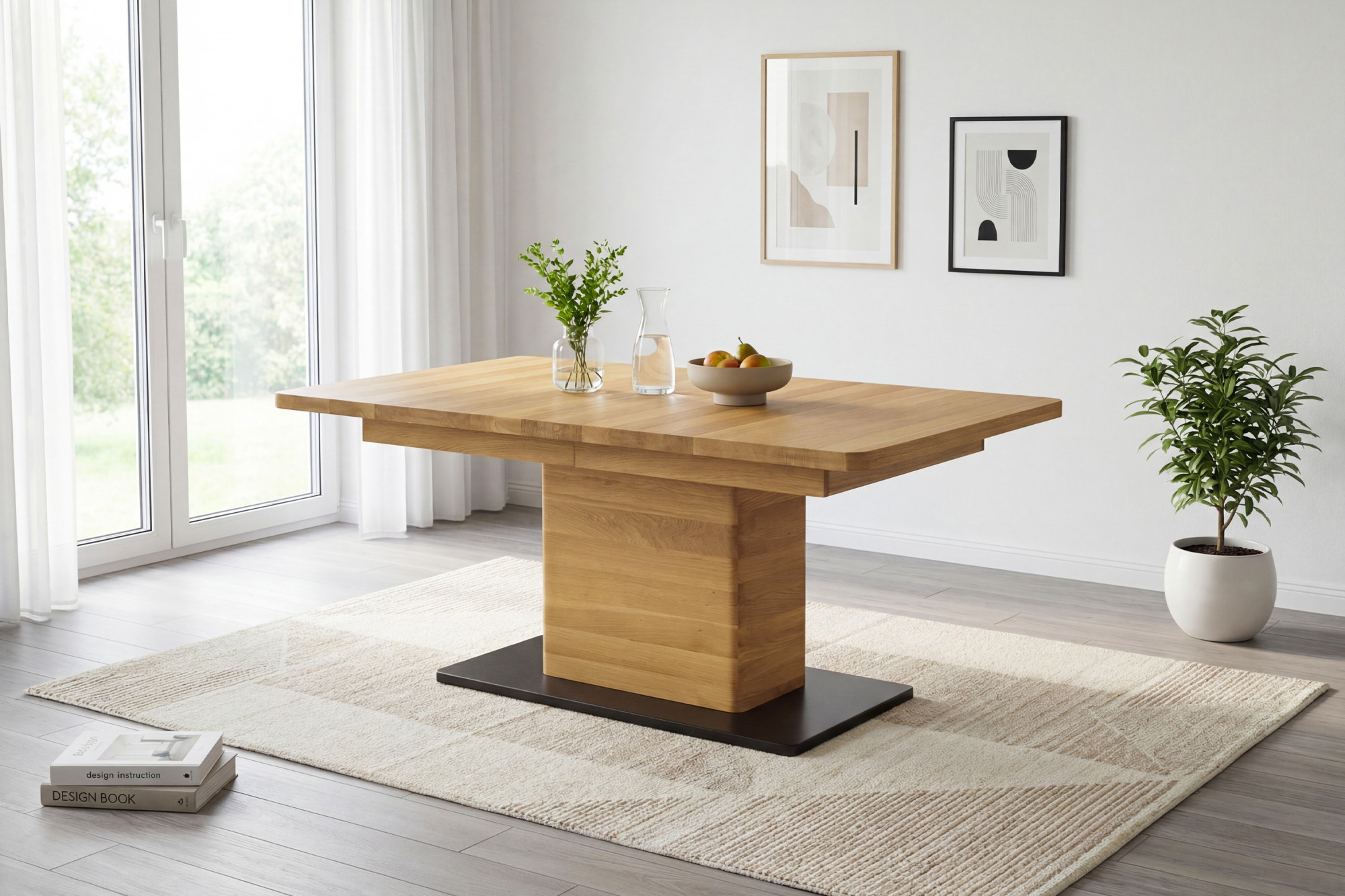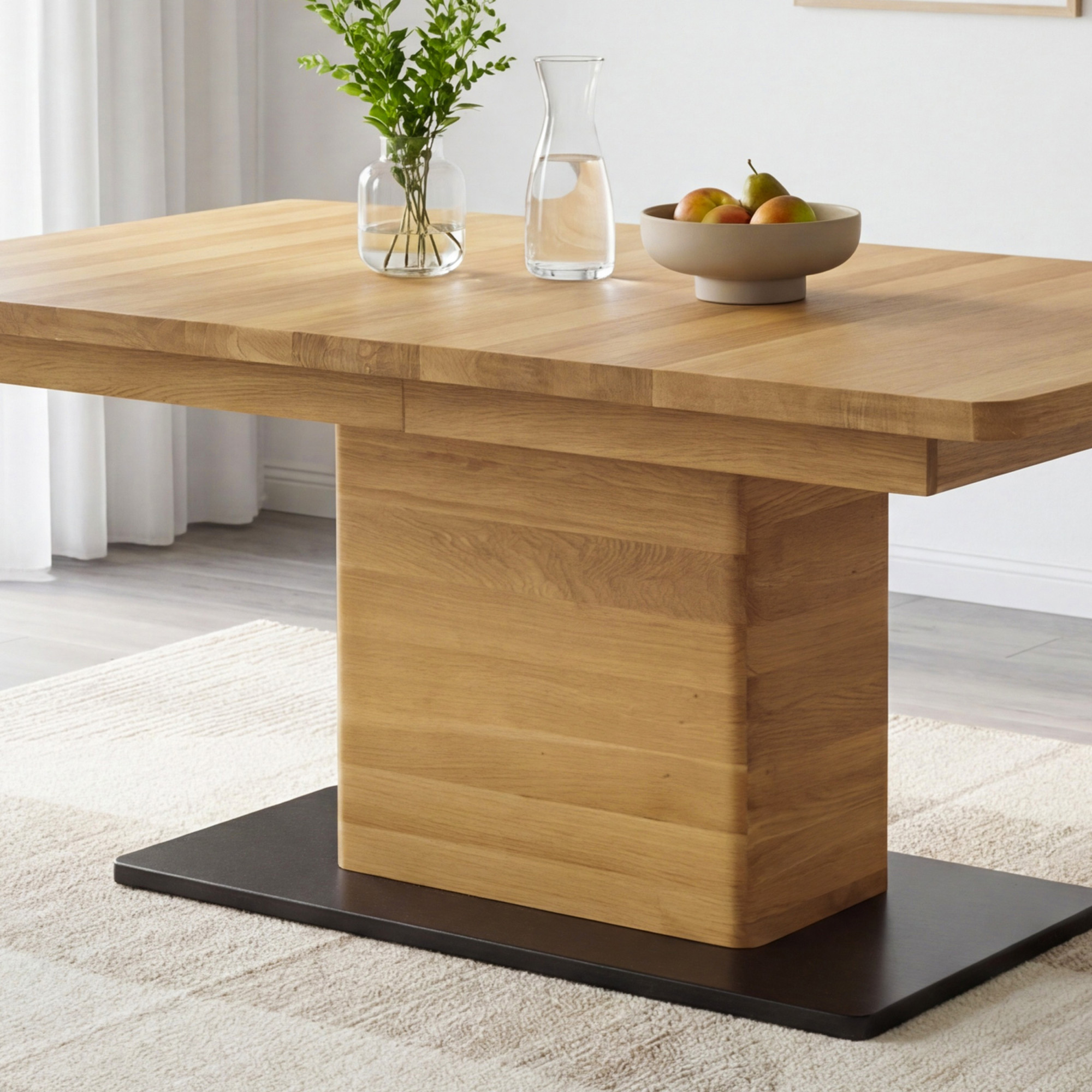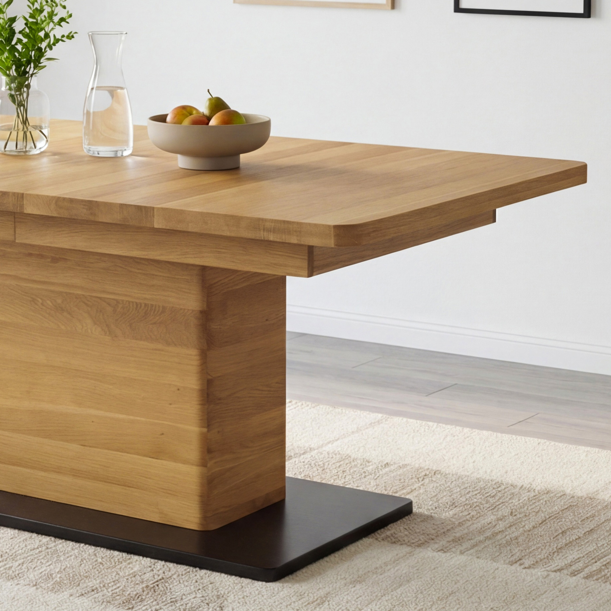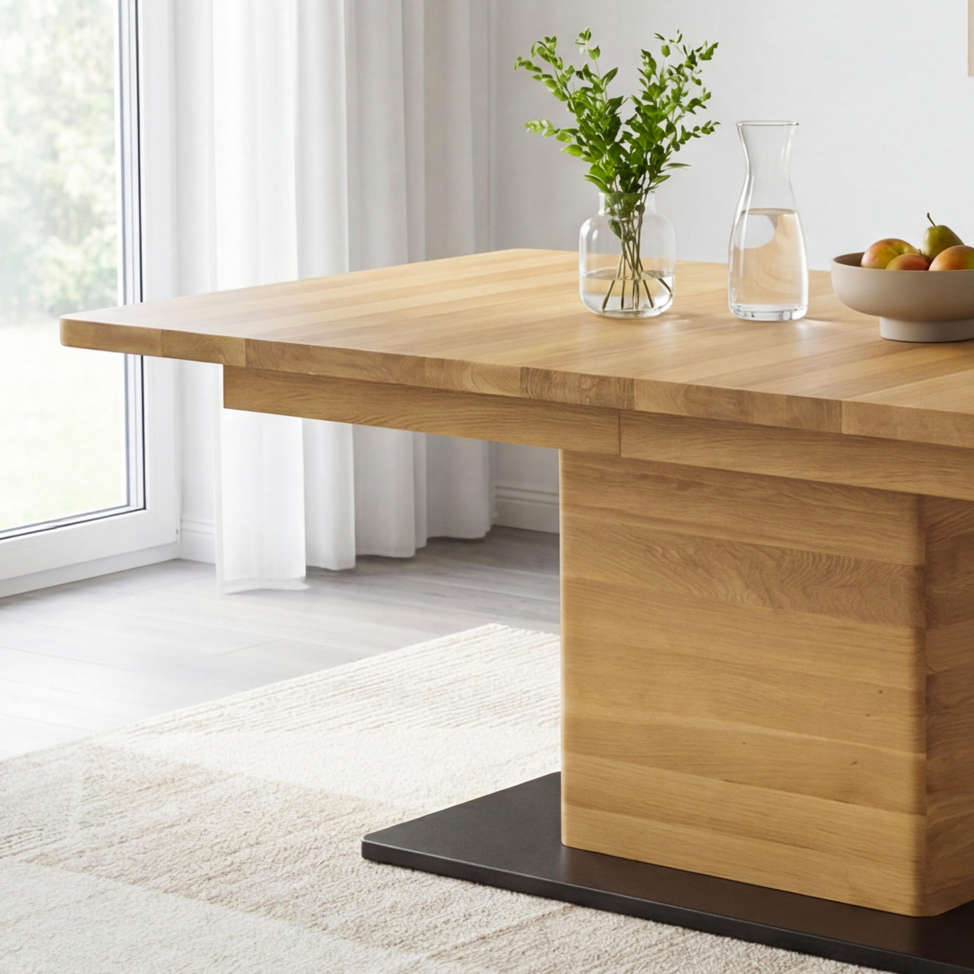 - Schwarzer Sockel – gibt dem Tisch Stabilität und einen eleganten Kontrast zum Eichenholz.