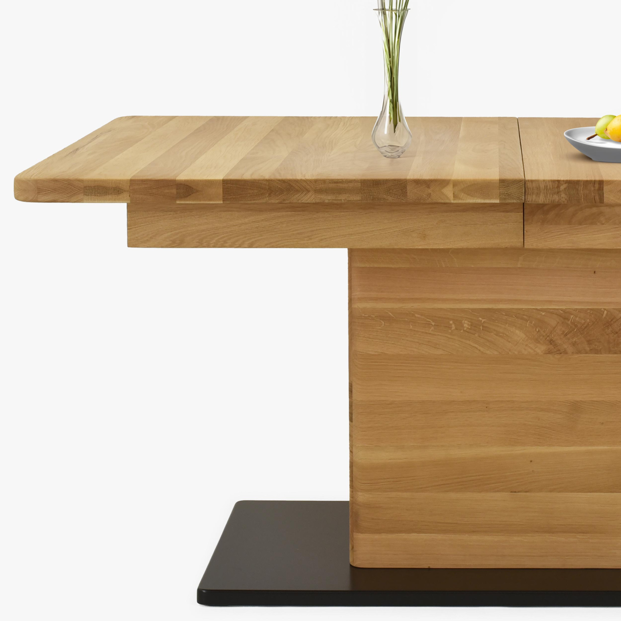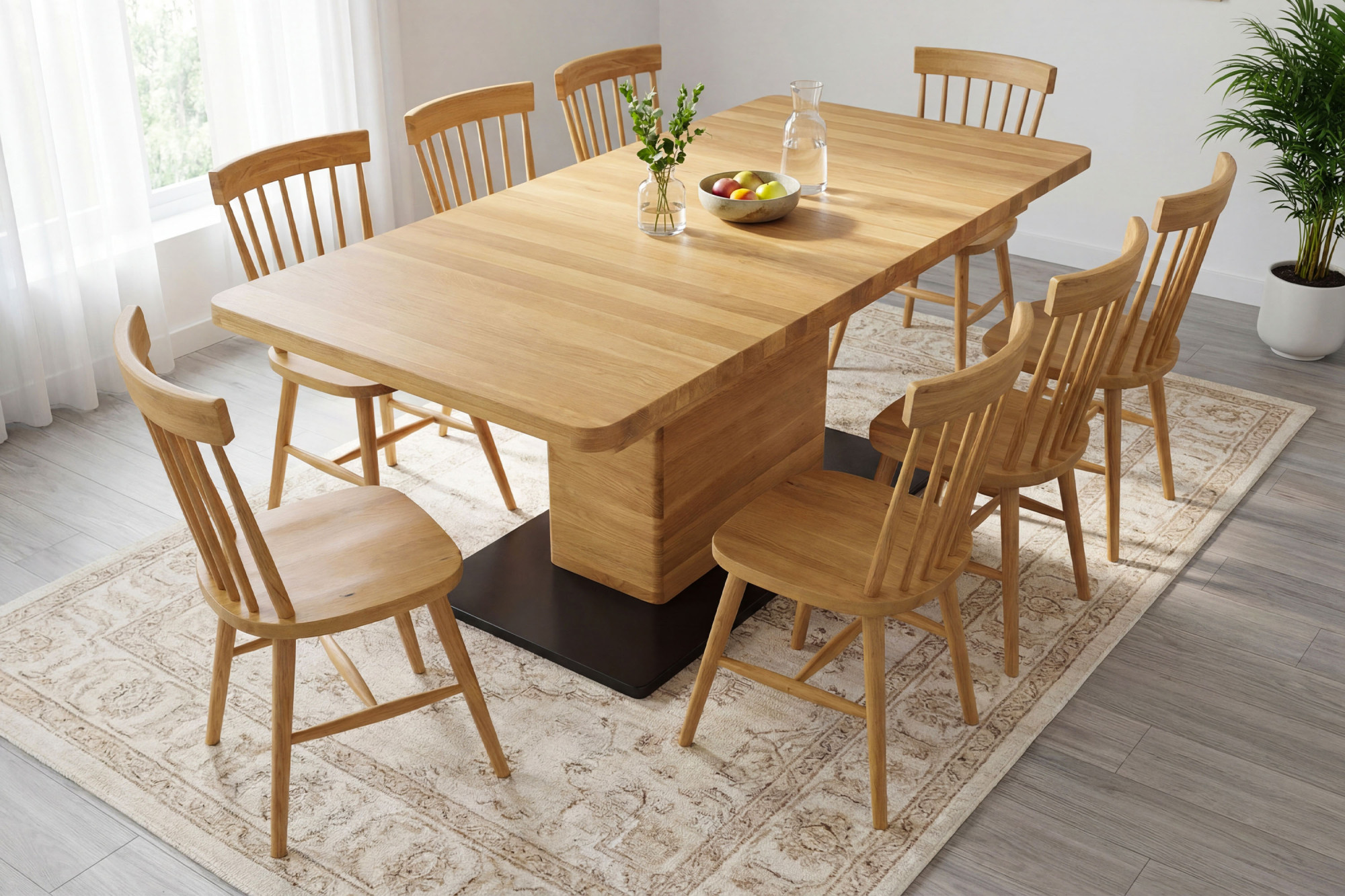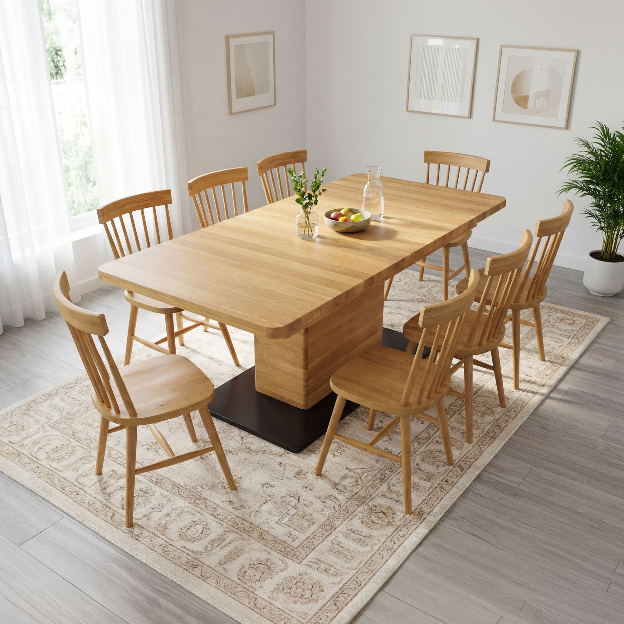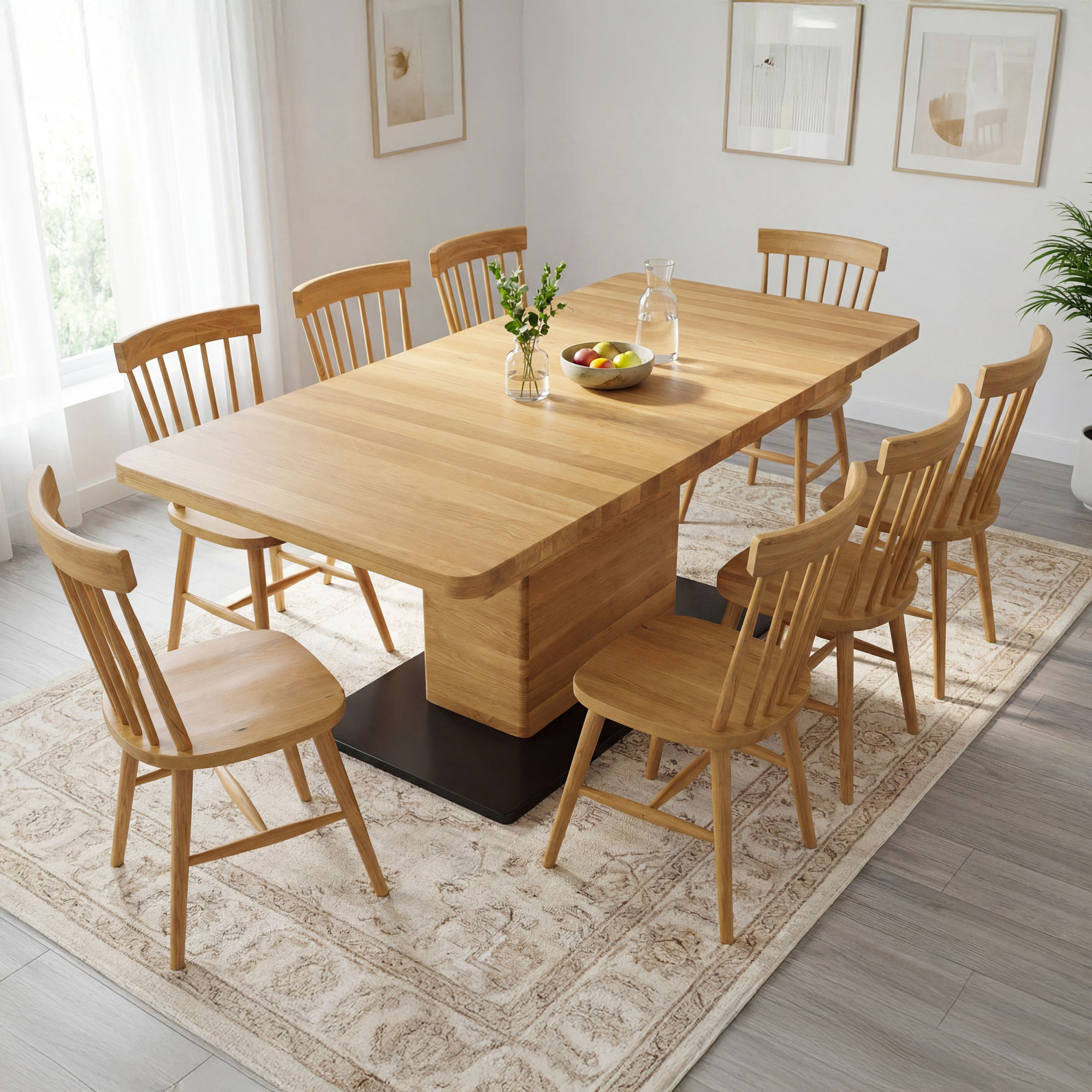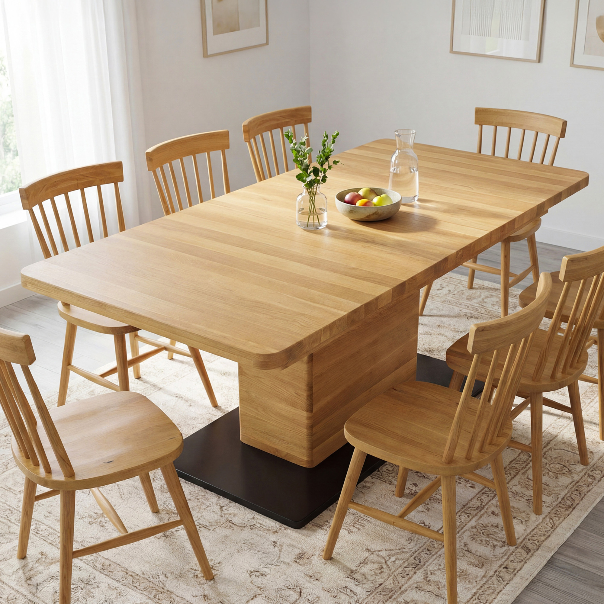 - Schwarzer Sockel – gibt dem Tisch Stabilität und einen eleganten Kontrast zum Eichenholz.