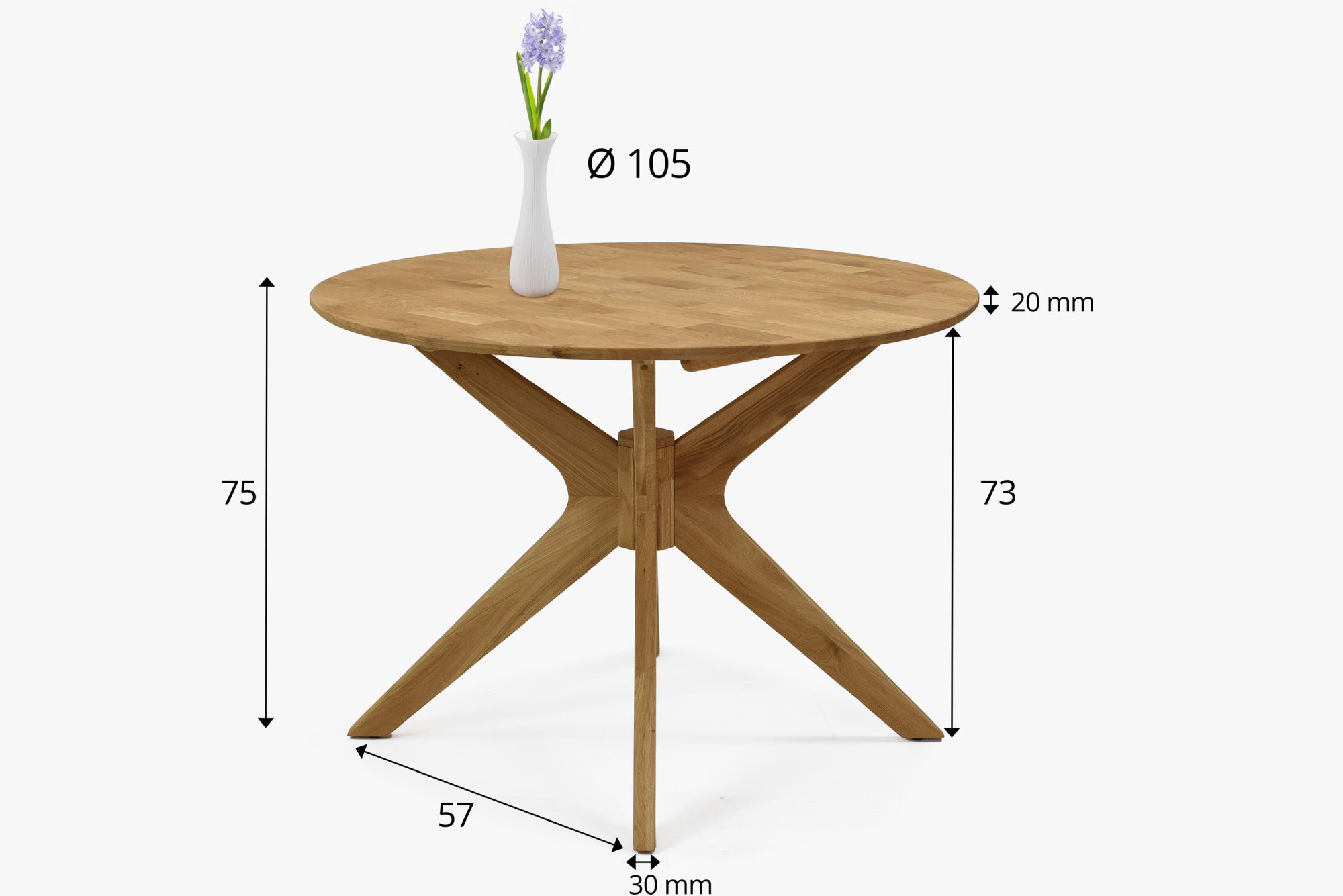 Die Tischbeine sind in überkreuzter Form angeordnet, die auf den ersten Blick beeindruckt und gleichzeitig hohe Stabilität gewährleistet. Der Tisch wird zerlegt mit sehr einfacher Montage geliefert, sodass Sie ihn in wenigen Minuten auch ohne Vorkenntnisse zusammenbauen können. Dank des Parkettmusters (Fingerzinken-Verbindung) auf der Platte wirkt das Möbel modern und luftig, behält aber gleichzeitig das klassische Aussehen von Massivholz. Mit diesem runden Holztisch schaffen Sie eine angenehme Atmosphäre in Ihrem Zuhause und lassen ihn sich leicht mit weiteren Stücken aus Eichenholz kombinieren.