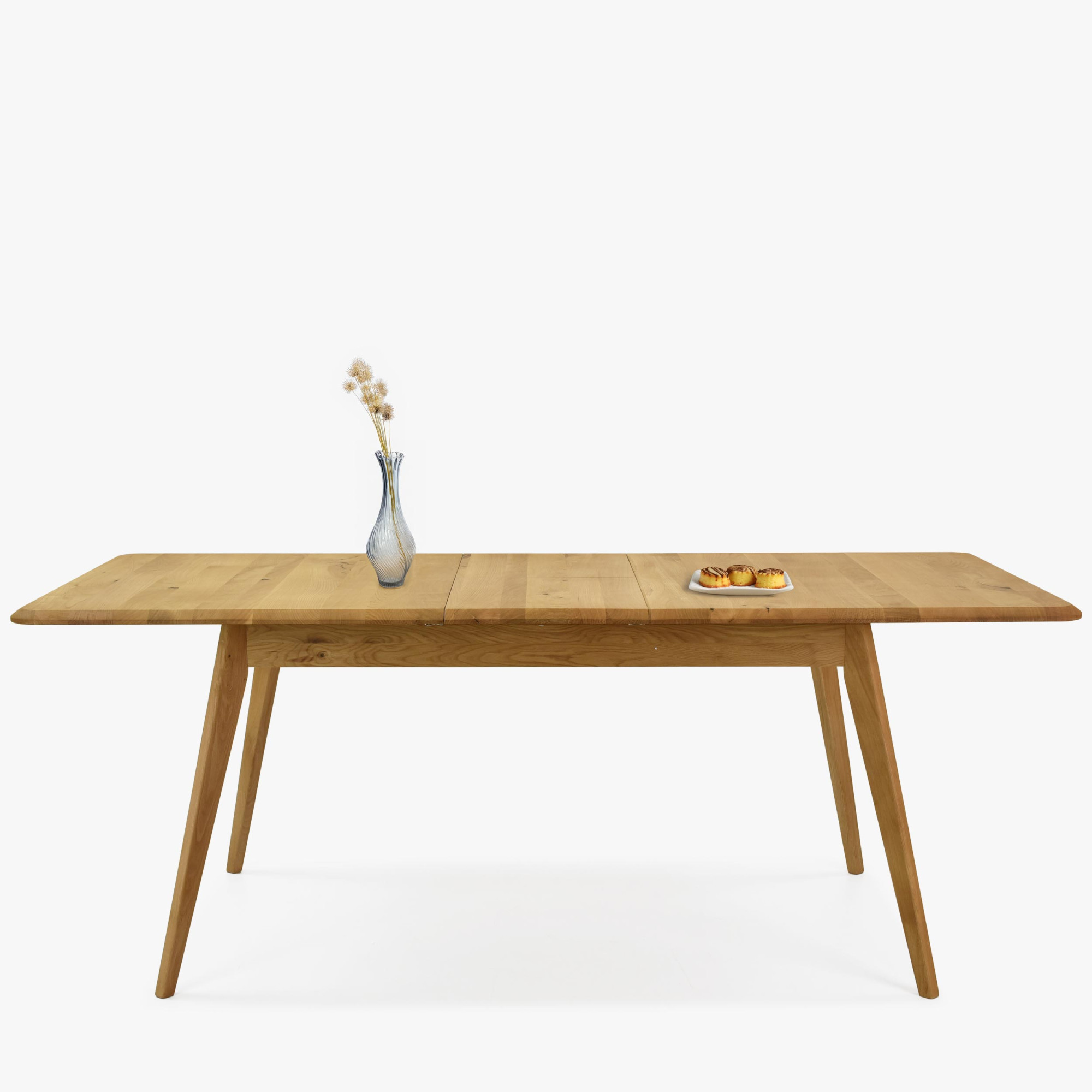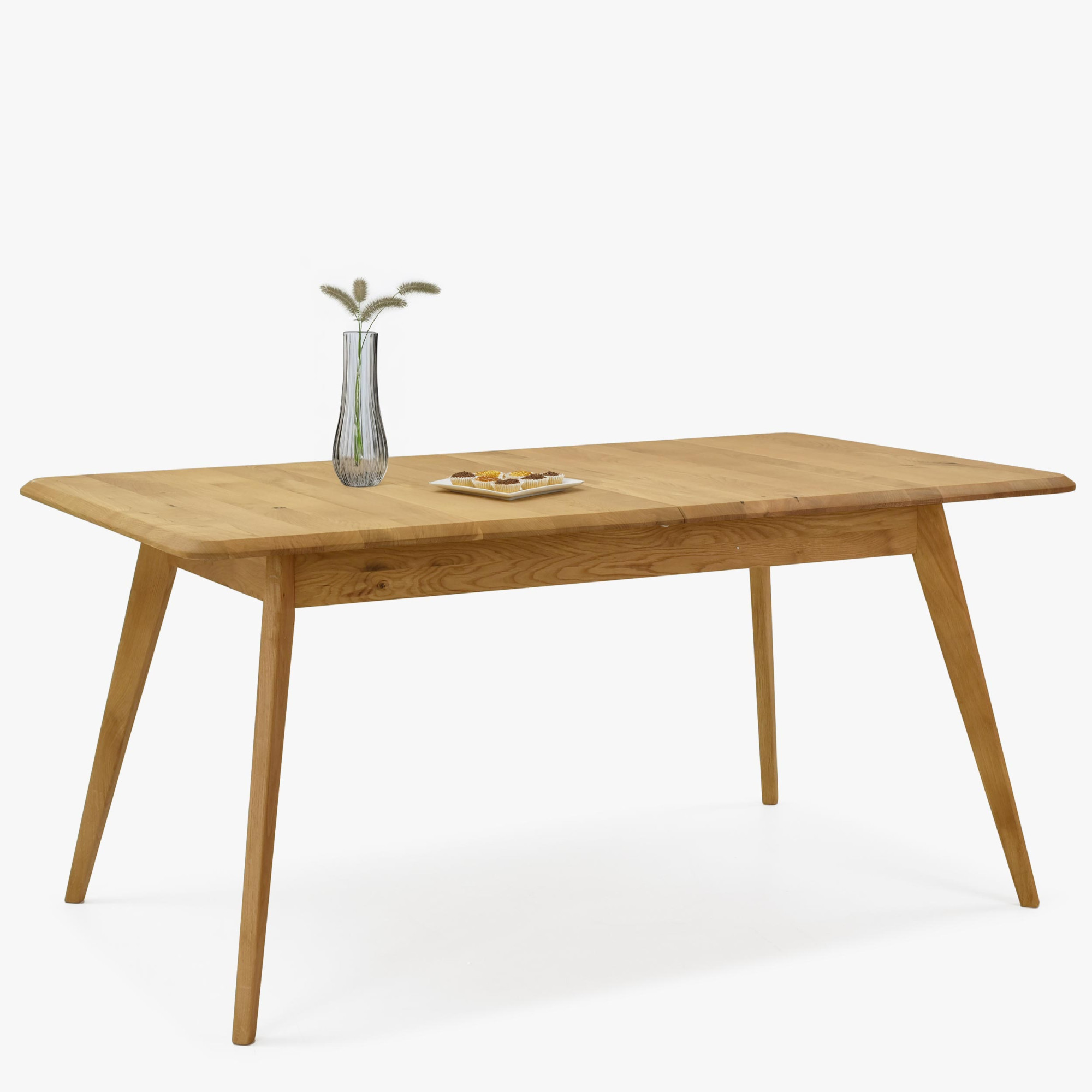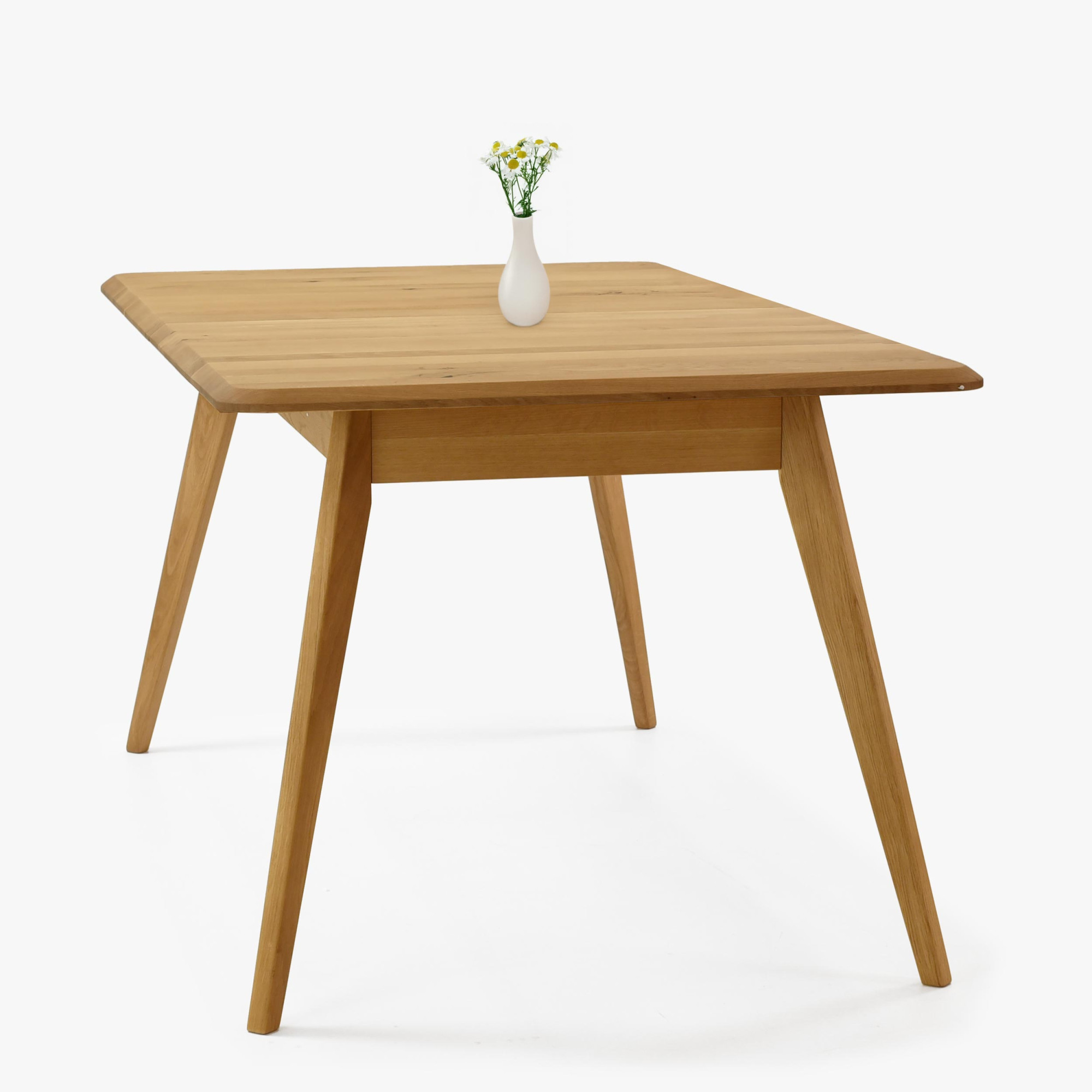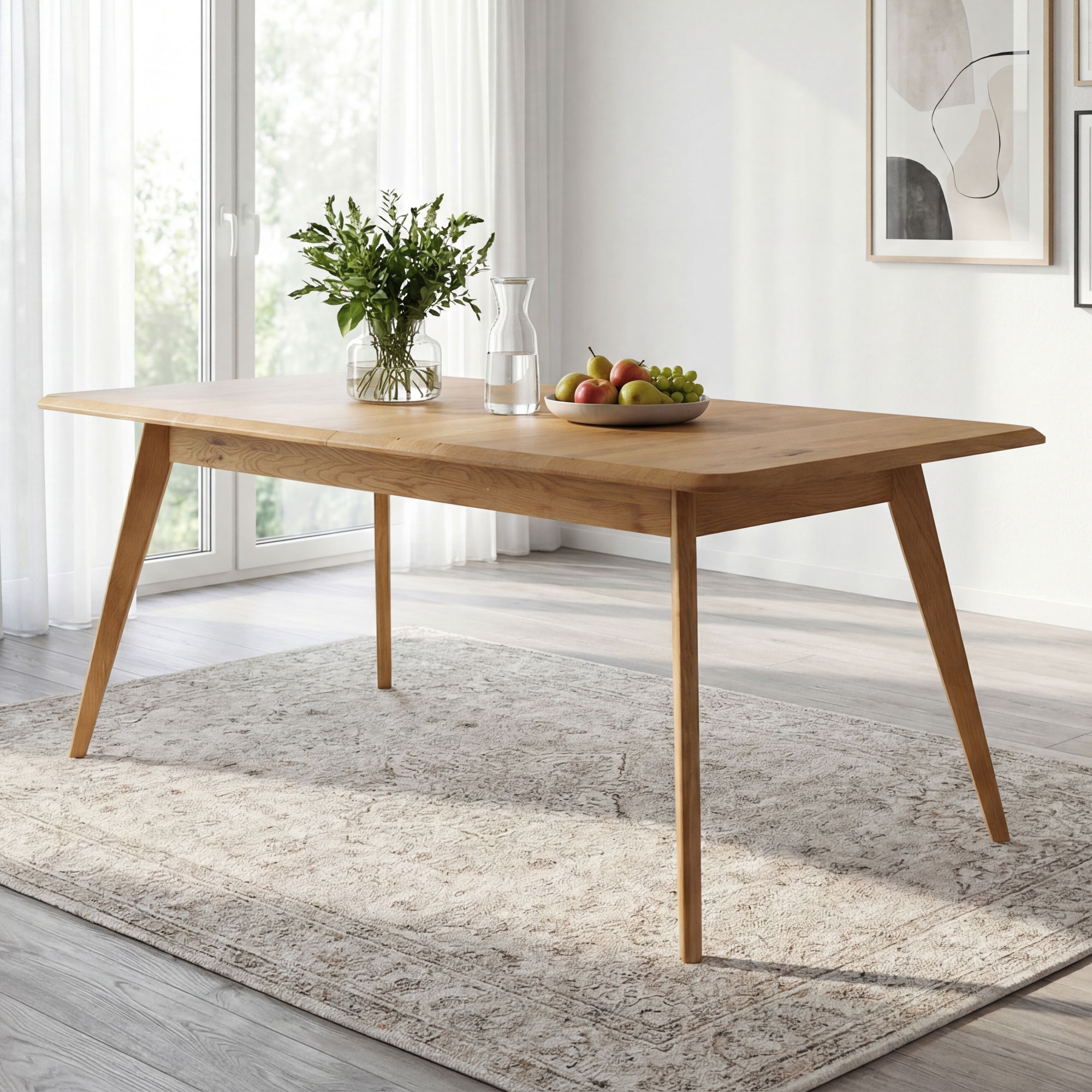 Massiver Eichen-Ausziehtisch Bratislava ist die ideale Wahl für Haushalte, die hochwertige Möbel aus Naturmaterial suchen. Hergestellt aus natürlichem Eichenholz mit FSC-Zertifizierung, garantiert der Tisch eine ökologische Herkunft und lange Lebensdauer. Sein Farbton Natur-Eiche und die Oberflächenbehandlung mit dänischem Woca-Öl unterstreichen die natürliche Schönheit des Holzes. Das moderne Design zeichnet sich durch leicht abgeschrägte Kanten und schräge Beine aus, die Leichtigkeit und Luftigkeit verleihen. Der einzigartige Stil dieses Tisches lässt sich problemlos mit weiteren Möbelstücken aus Eichenholz kombinieren und schafft so ein harmonisches Interieur.