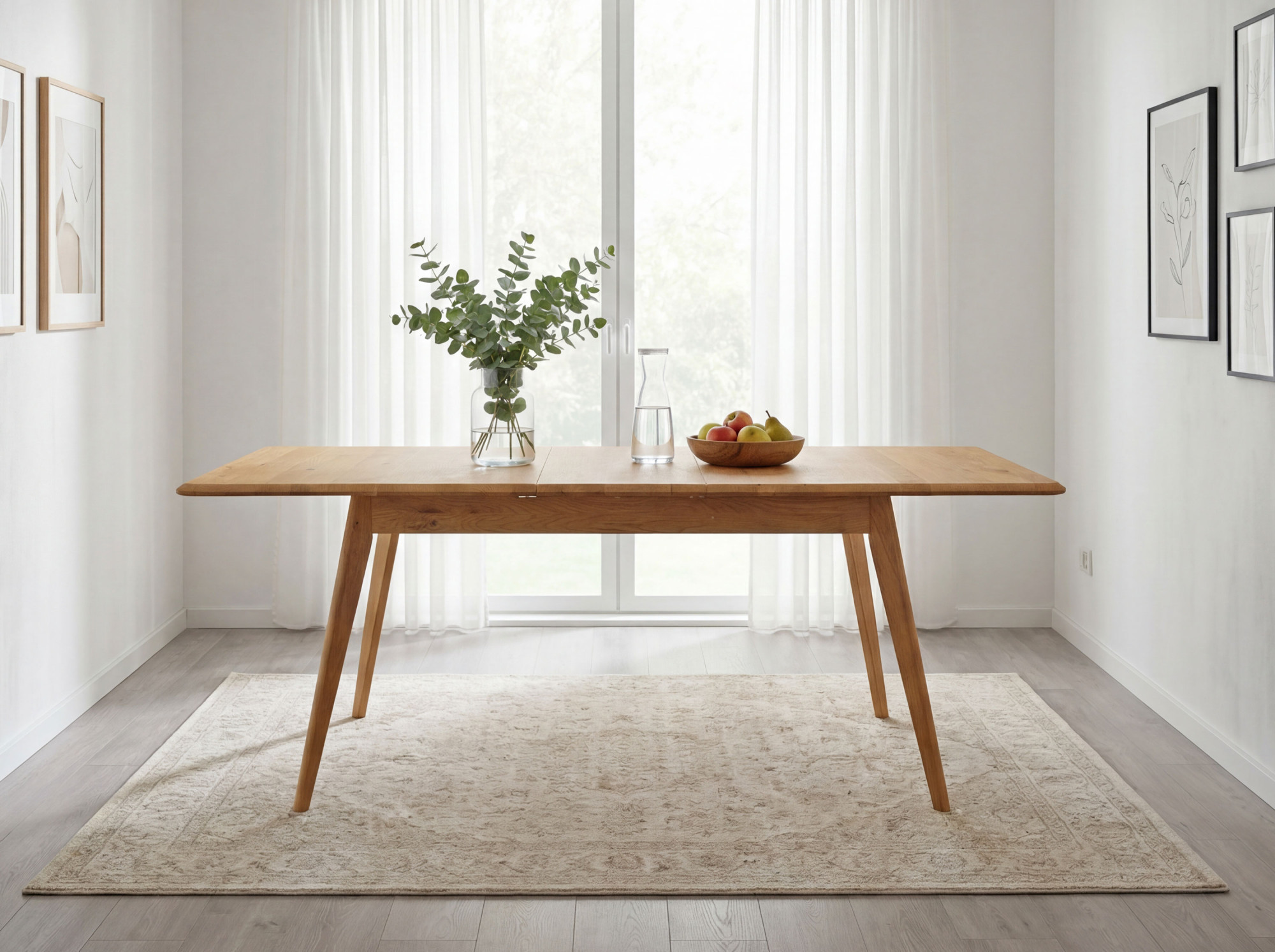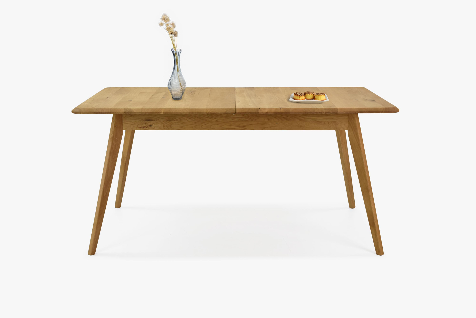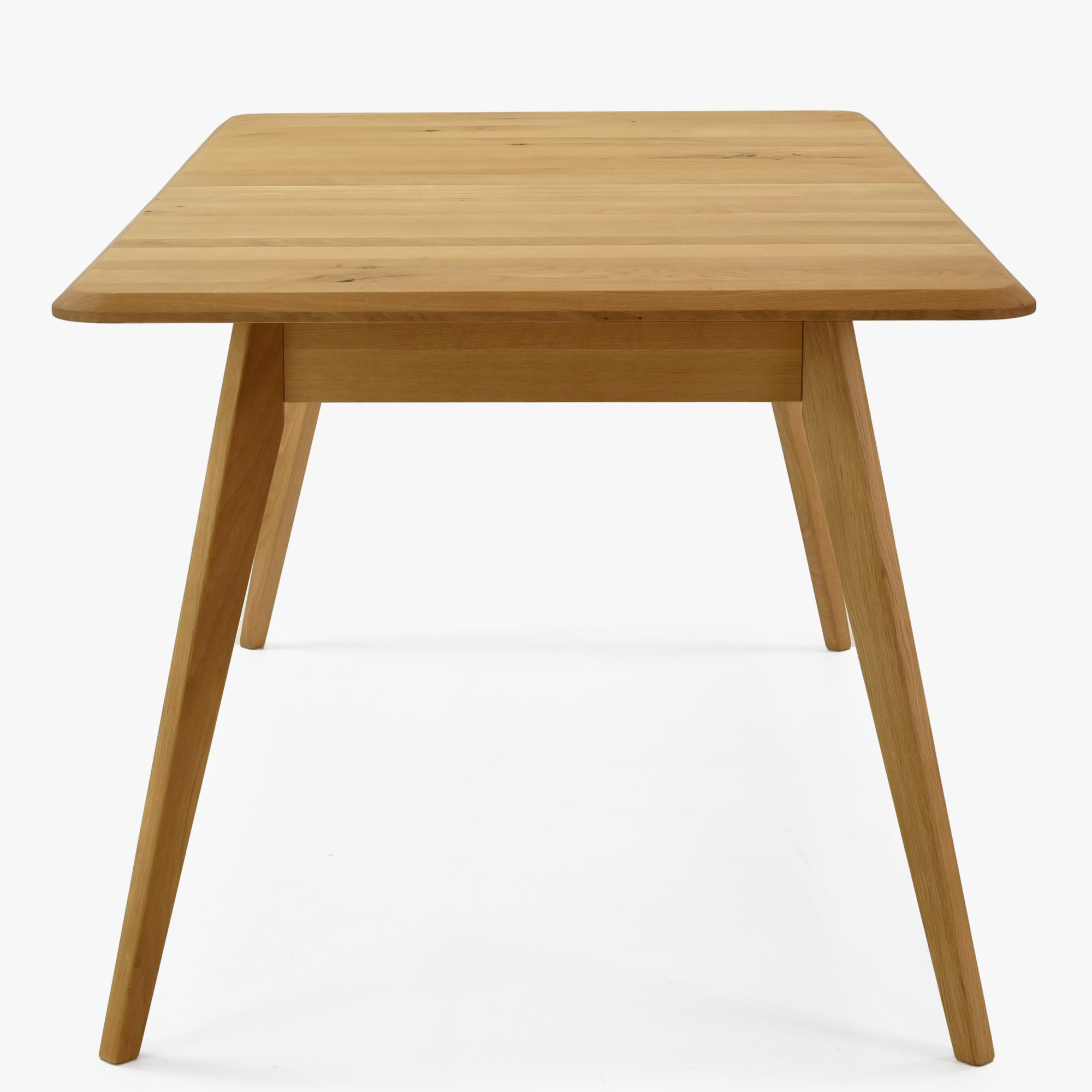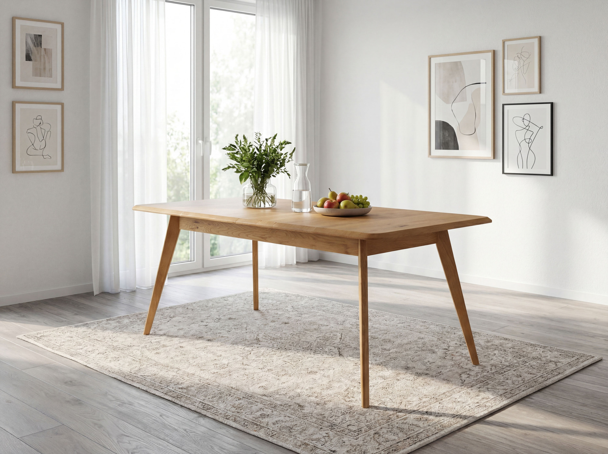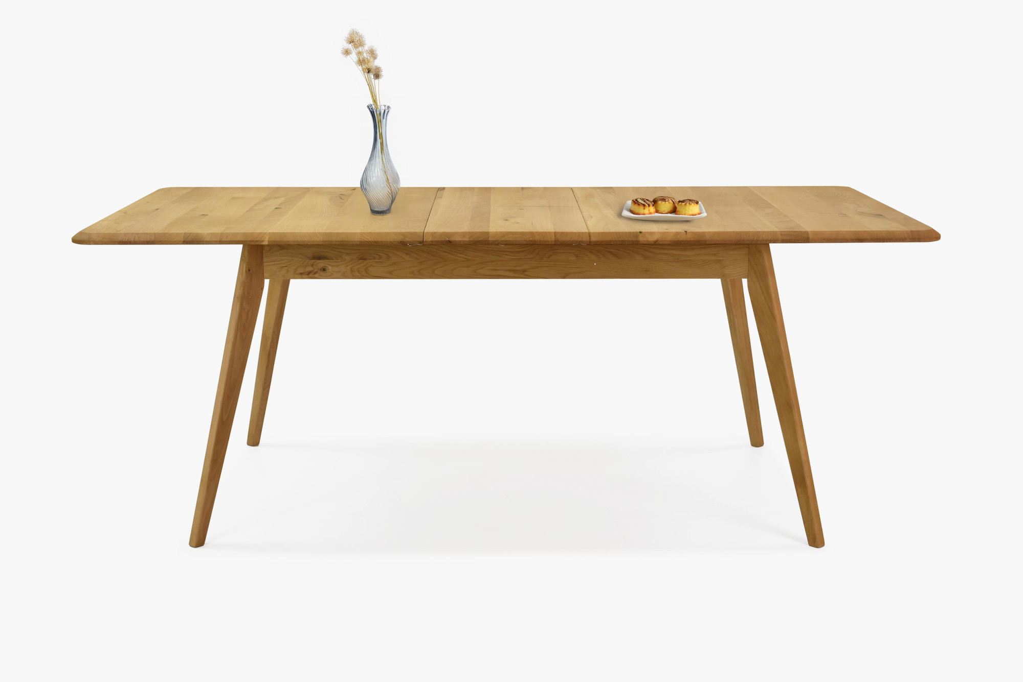 Massiver Eichen-Ausziehtisch Bratislava ist die ideale Wahl für Haushalte, die hochwertige Möbel aus Naturmaterial suchen. Hergestellt aus natürlichem Eichenholz mit FSC-Zertifizierung, garantiert der Tisch eine ökologische Herkunft und lange Lebensdauer. Sein Farbton Natur-Eiche und die Oberflächenbehandlung mit dänischem Woca-Öl unterstreichen die natürliche Schönheit des Holzes. Das moderne Design zeichnet sich durch leicht abgeschrägte Kanten und schräge Beine aus, die Leichtigkeit und Luftigkeit verleihen. Der einzigartige Stil dieses Tisches lässt sich problemlos mit weiteren Möbelstücken aus Eichenholz kombinieren und schafft so ein harmonisches Interieur.