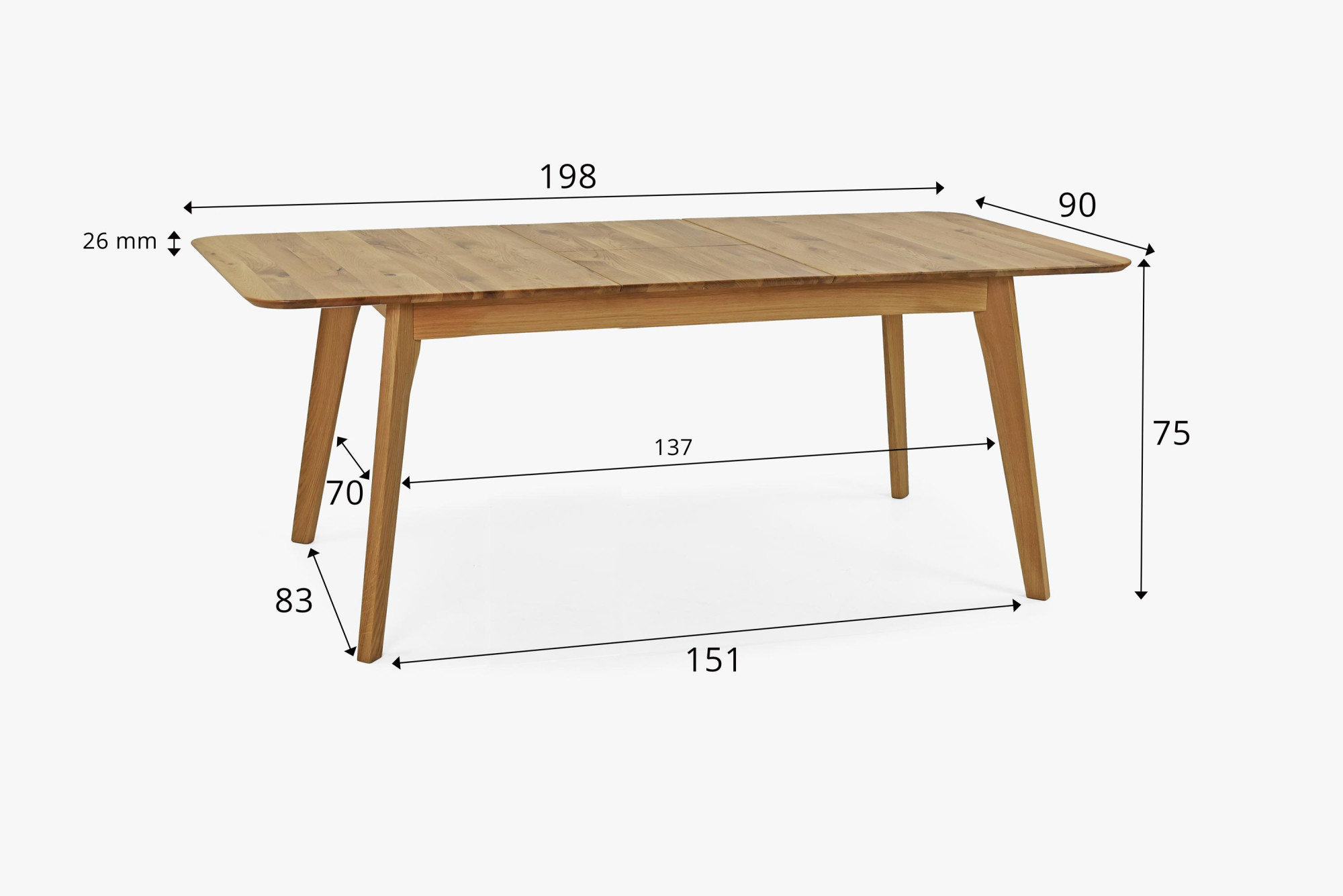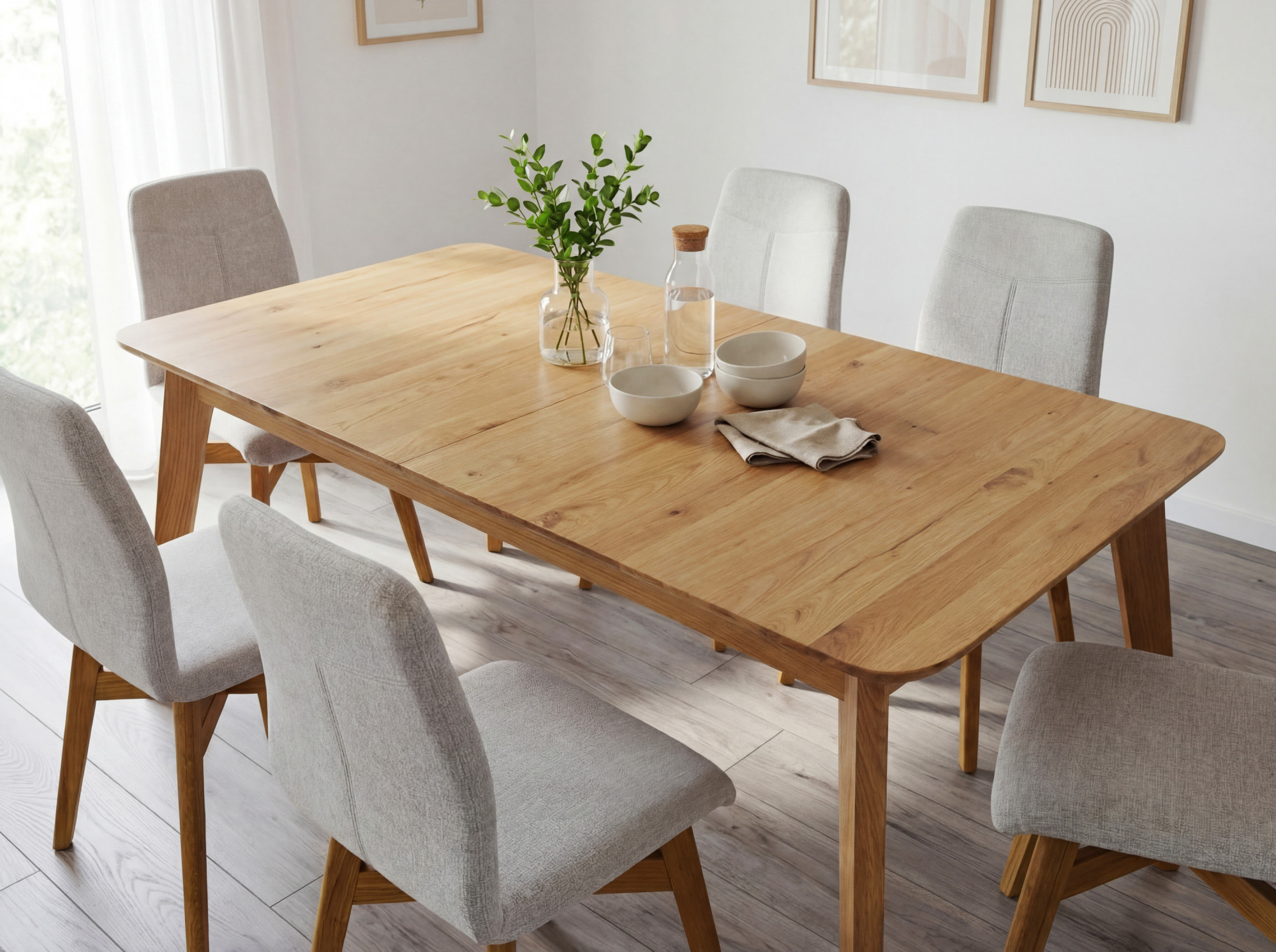 Ein großer Vorteil dieses Tisches ist die maximale Stabilität auch im ausgezogenen Zustand – beim Ausziehen bewegt sich nur die Tischplatte, während die massiven Eichenholzbeine fest an ihrem Platz bleiben. Die Beine sind strategisch an den Tischenden platziert, wodurch ausreichend Platz für bequemes Sitzen von allen Seiten gewährleistet ist. Die gesamte Konstruktion ist robust und vollmassiv, weshalb der Tisch auch dem anspruchsvollen täglichen Gebrauch standhält. Der matt lackierte Schutz ist resistent gegenüber üblichen Verschmutzungen und die Pflege der Oberfläche ist sehr einfach – einfach mit einem weichen Tuch abwischen. Dieser Tisch passt hervorragend sowohl in moderne als auch in traditionelle Einrichtungen und lässt sich problemlos mit weiterem Eichenholzmöbel kombinieren.