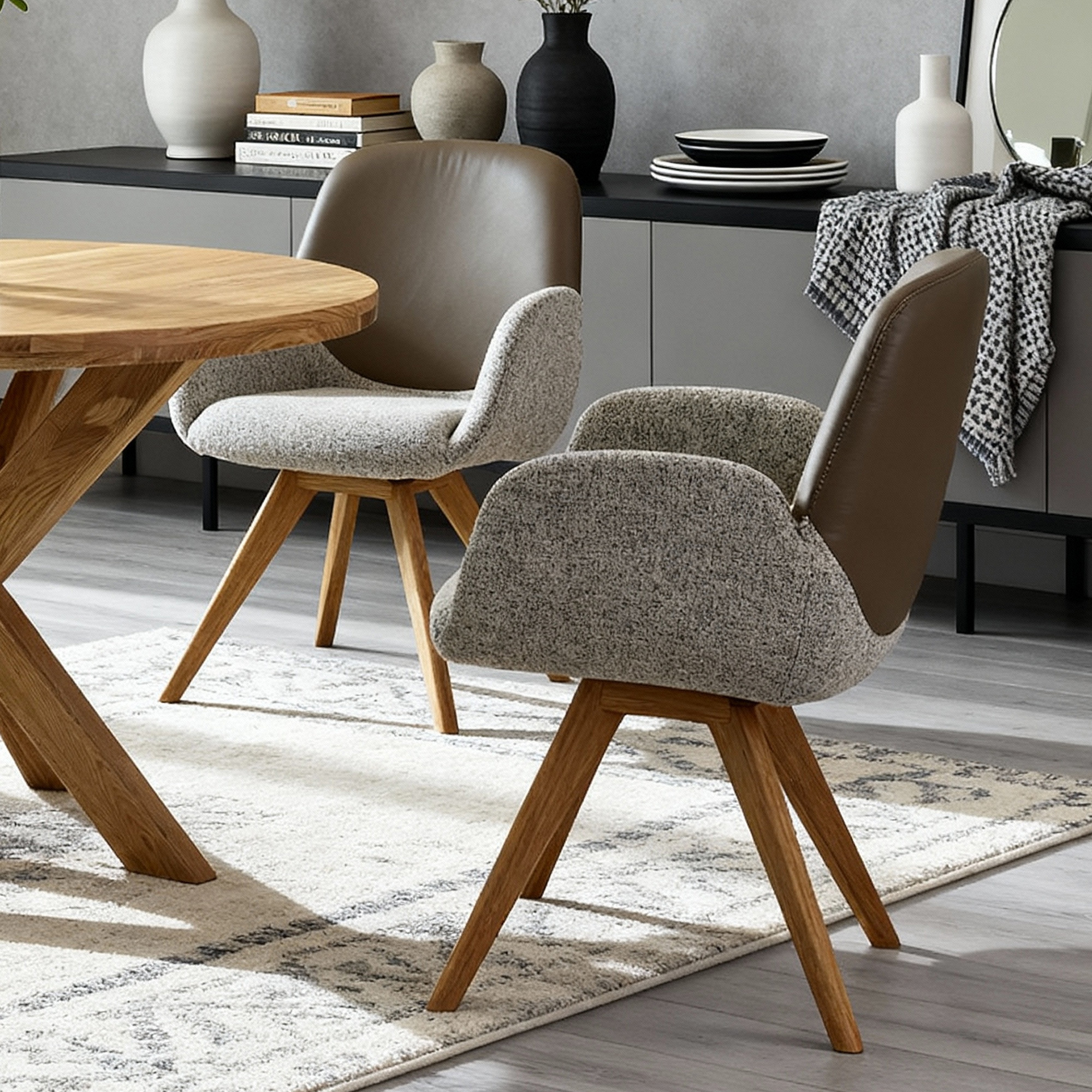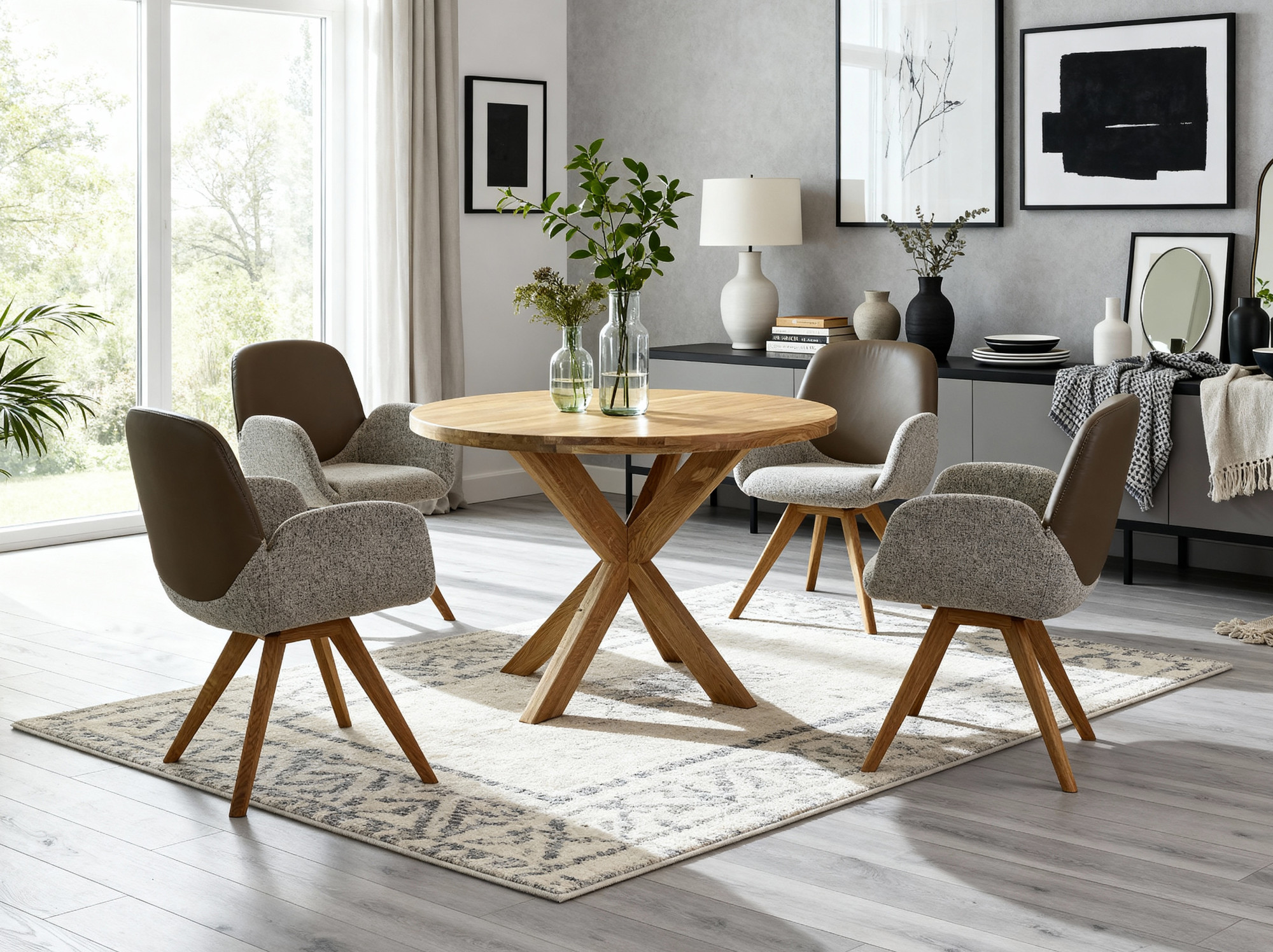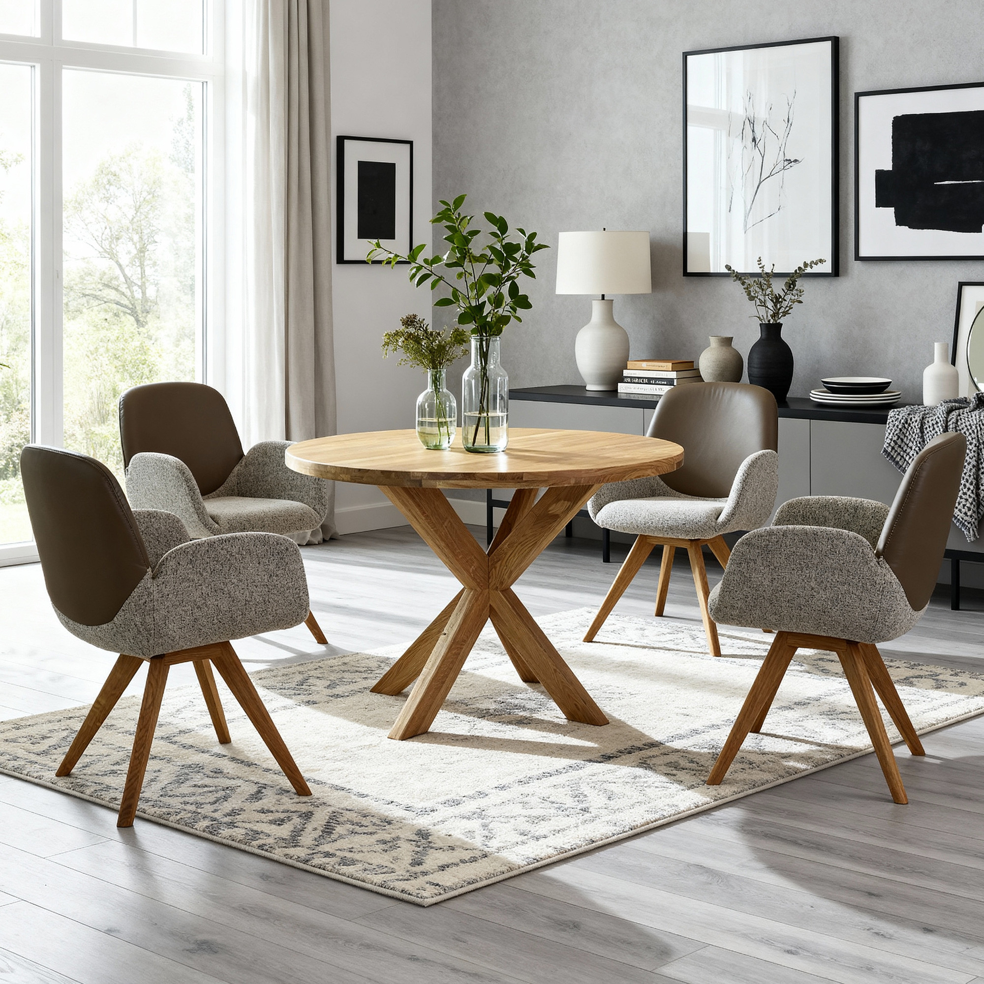 * Auf dem Bild runder Eichenholztisch mit 100 cm Durchmesser und drehbarer Eichenstuhl Modell Epic