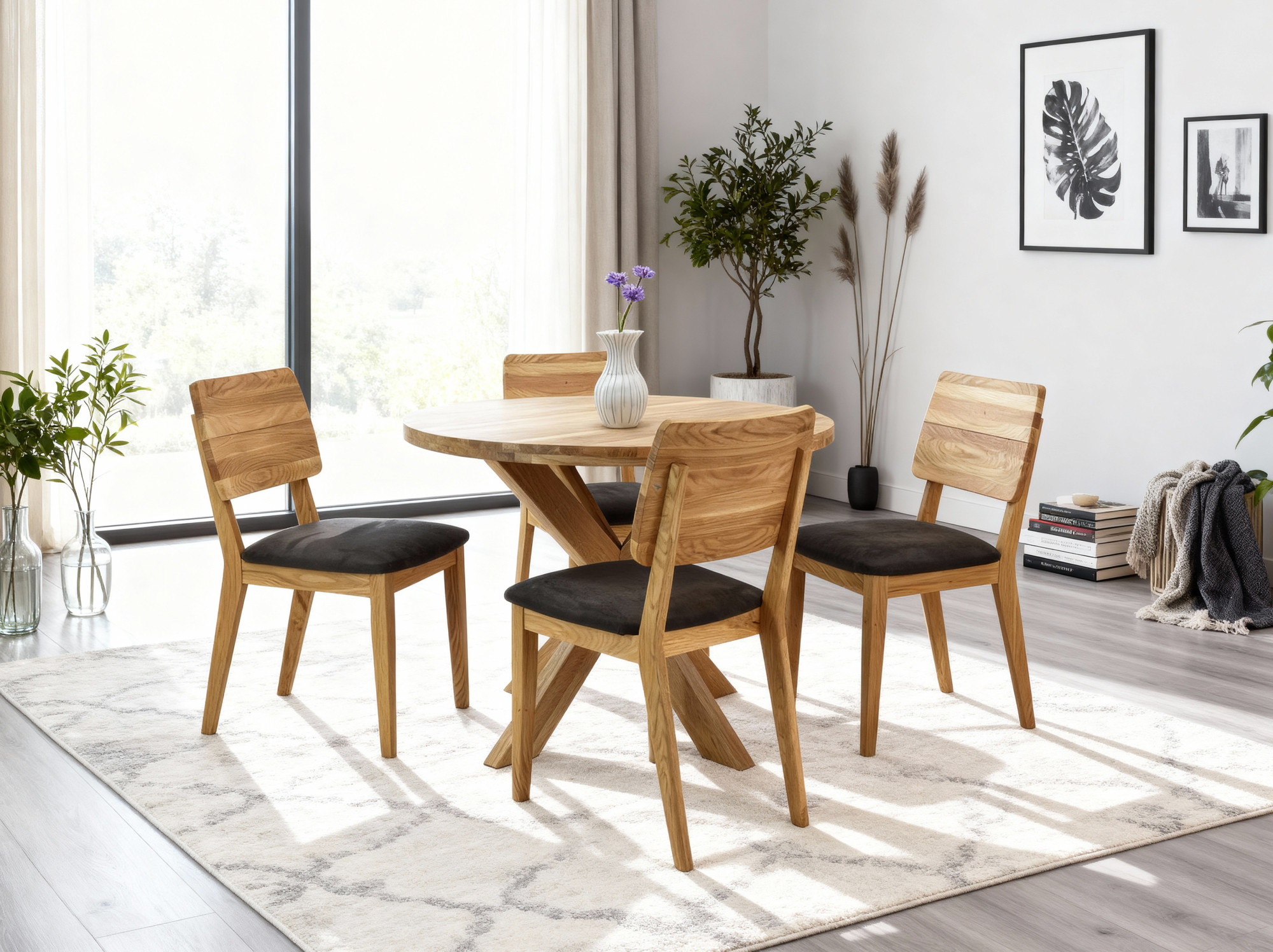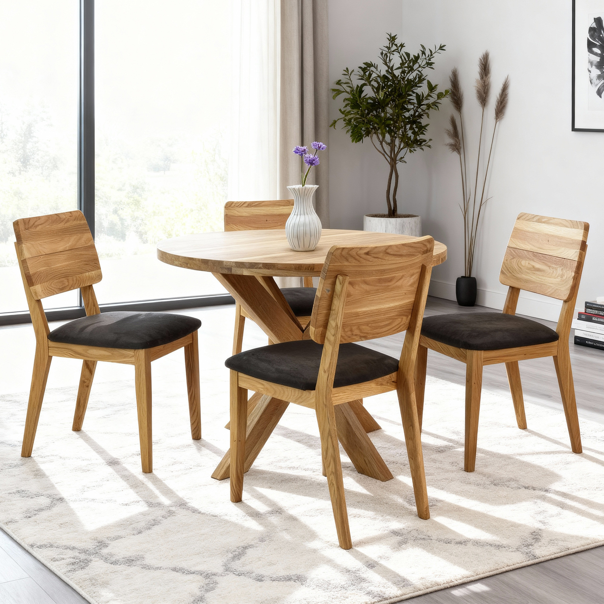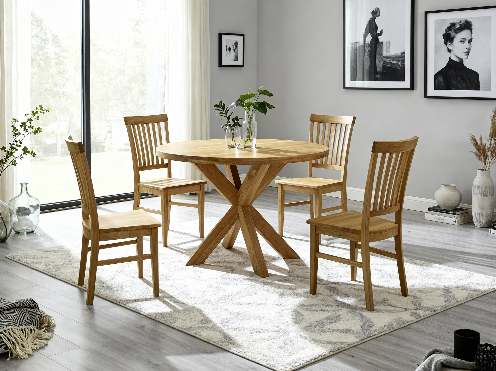 * Auf dem Bild runder Eichenholztisch mit 100 cm Durchmesser und der Eichen- Massivholz Esszimmerstuhl Rain