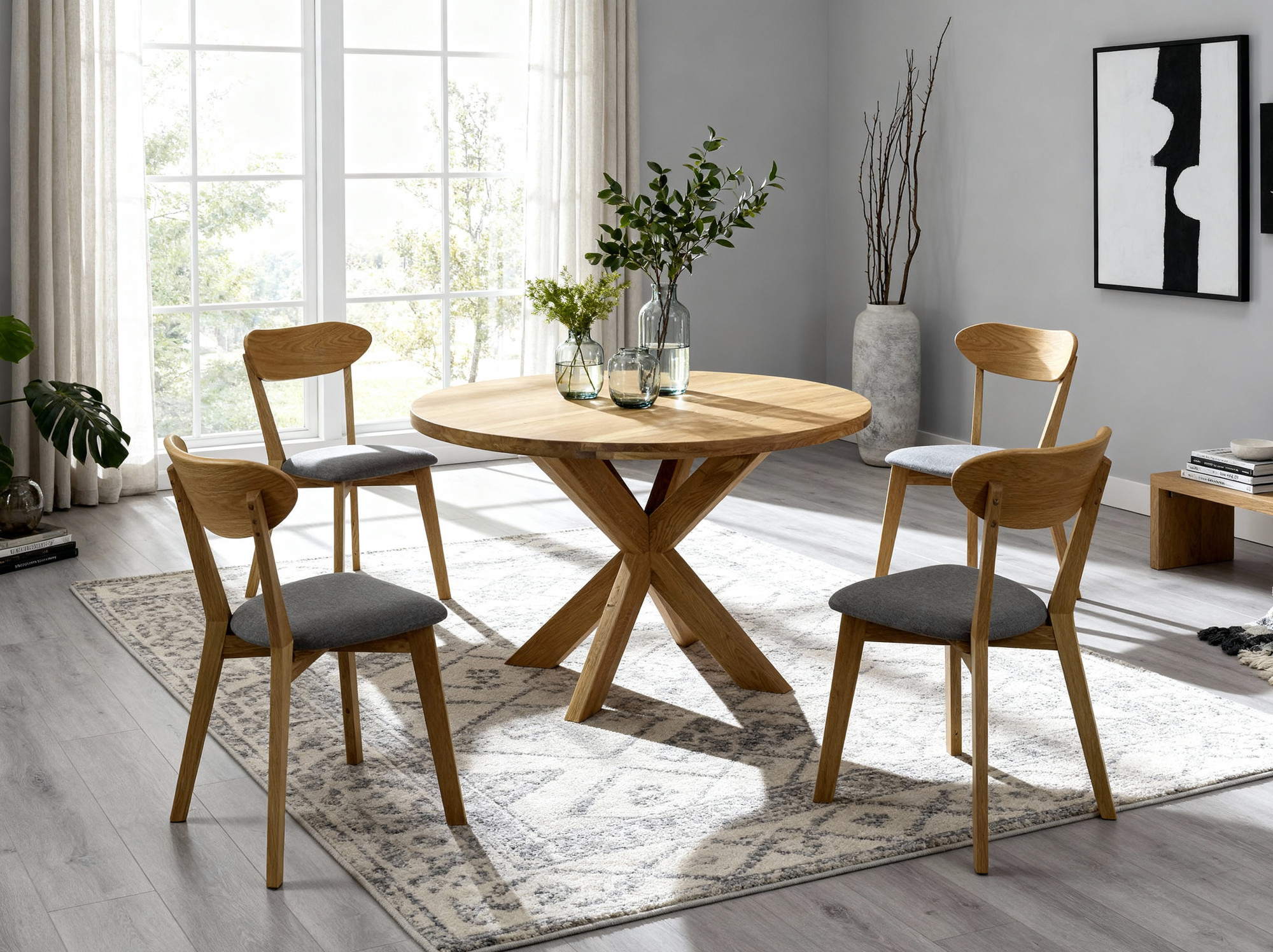Eichenholz mit FSC-Zertifikat garantiert Umweltfreundlichkeit und nachhaltige Forstwirtschaft. Dieser runde Holztisch mit gekreuzten Beinen lässt sich problemlos mit weiteren Eichenprodukten kombinieren und schafft so ein harmonisches Interieur voller angenehmer Atmosphäre. Nicht nur genießen Sie die natürliche Schönheit des Holzes, sondern investieren auch in Qualität, die viele Jahre hält. Dank der universellen Maße eignet sich der Tisch auch für kleinere Räume, ohne an Funktionalität und Eleganz einzubüßen. Wenn Sie Möbel suchen, die modernes Design mit Tradition verbinden und die Umwelt schonen, ist dieses Modell die klare Wahl.
