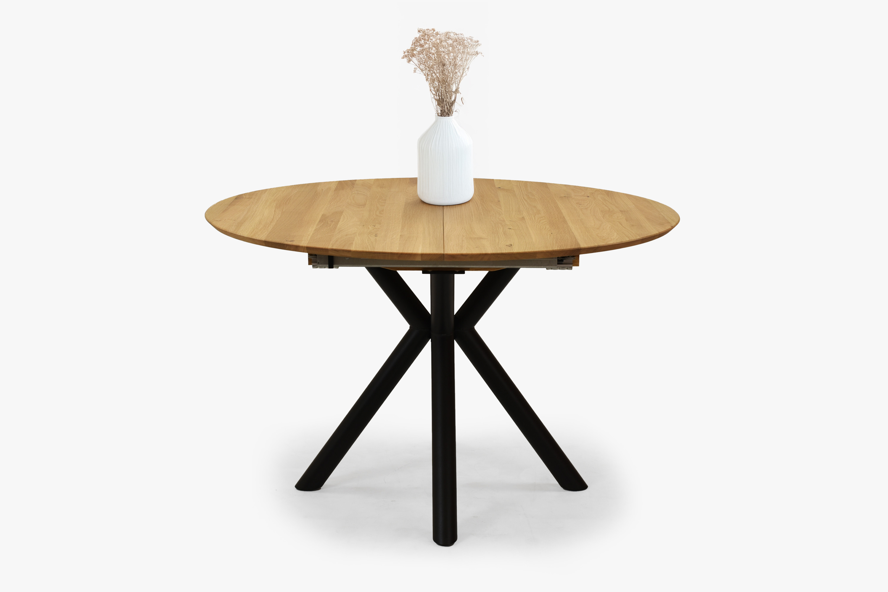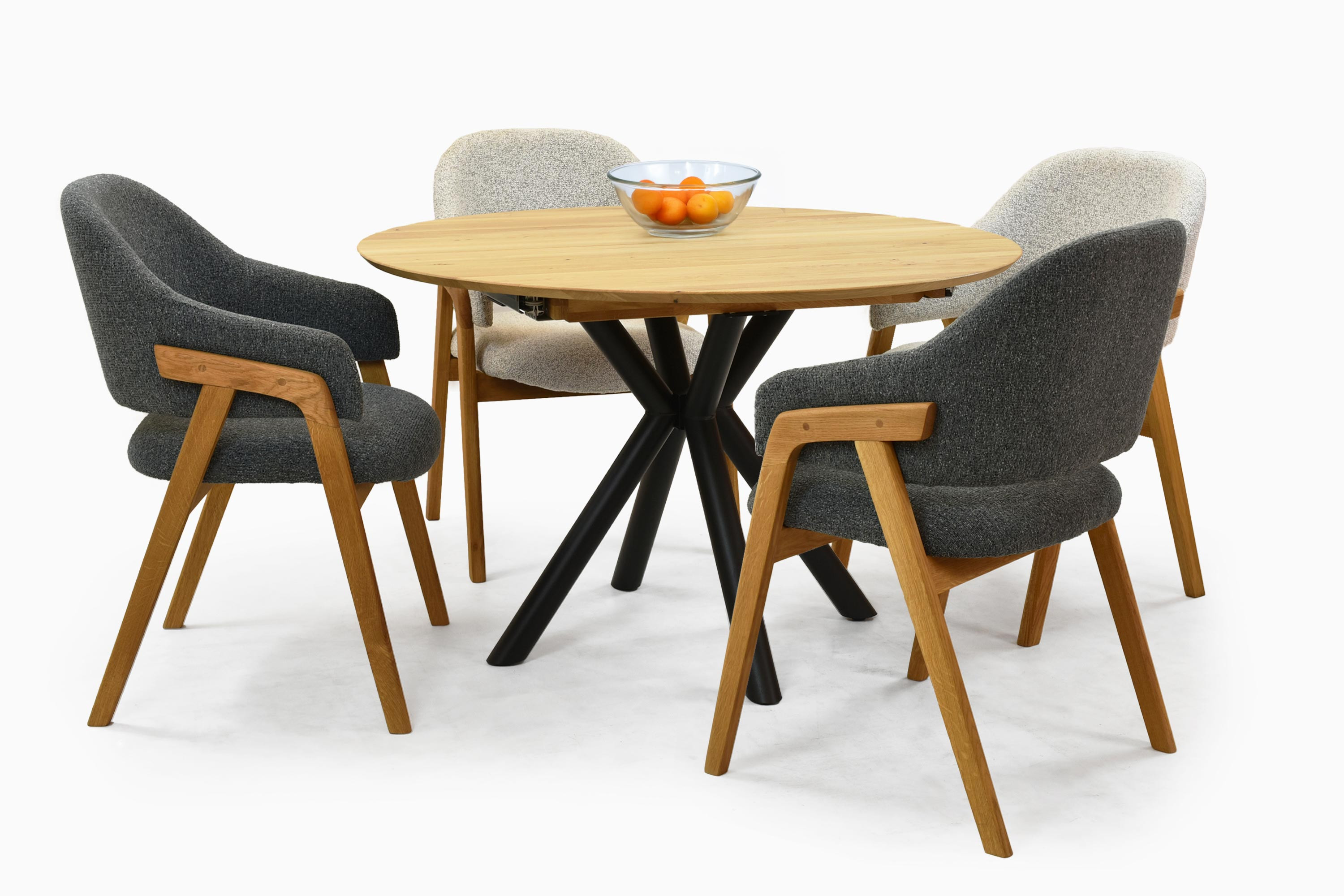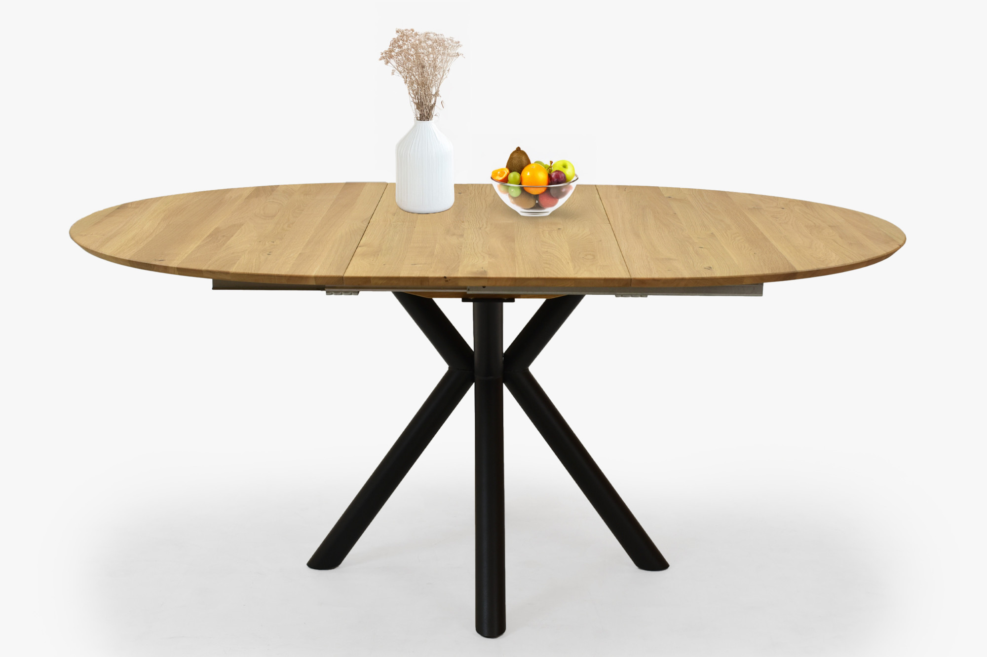 Der runde ausziehbare Tisch Karol ist eine meisterhafte Verbindung traditioneller Handwerkskunst und moderner Funktionalität. Die Platte mit einem Durchmesser von 120 cm aus massiver Eiche verleiht dem Interieur Wärme und authentischen Charakter, während der versteckte Schmetterlingsmechanismus den Tisch innerhalb weniger Sekunden in einen ovalen Tisch mit einer Länge von 170 cm verwandelt – ideal, wenn sich eine große Familie oder Freunde versammeln. Robuste schwarze Metallbeine mit elegantem Kreuzgestell bringen einen luftigen industriellen Akzent und garantieren Stabilität auch bei maximaler Ausziehung, ohne dabei Sitzkomfort einzuschränken.