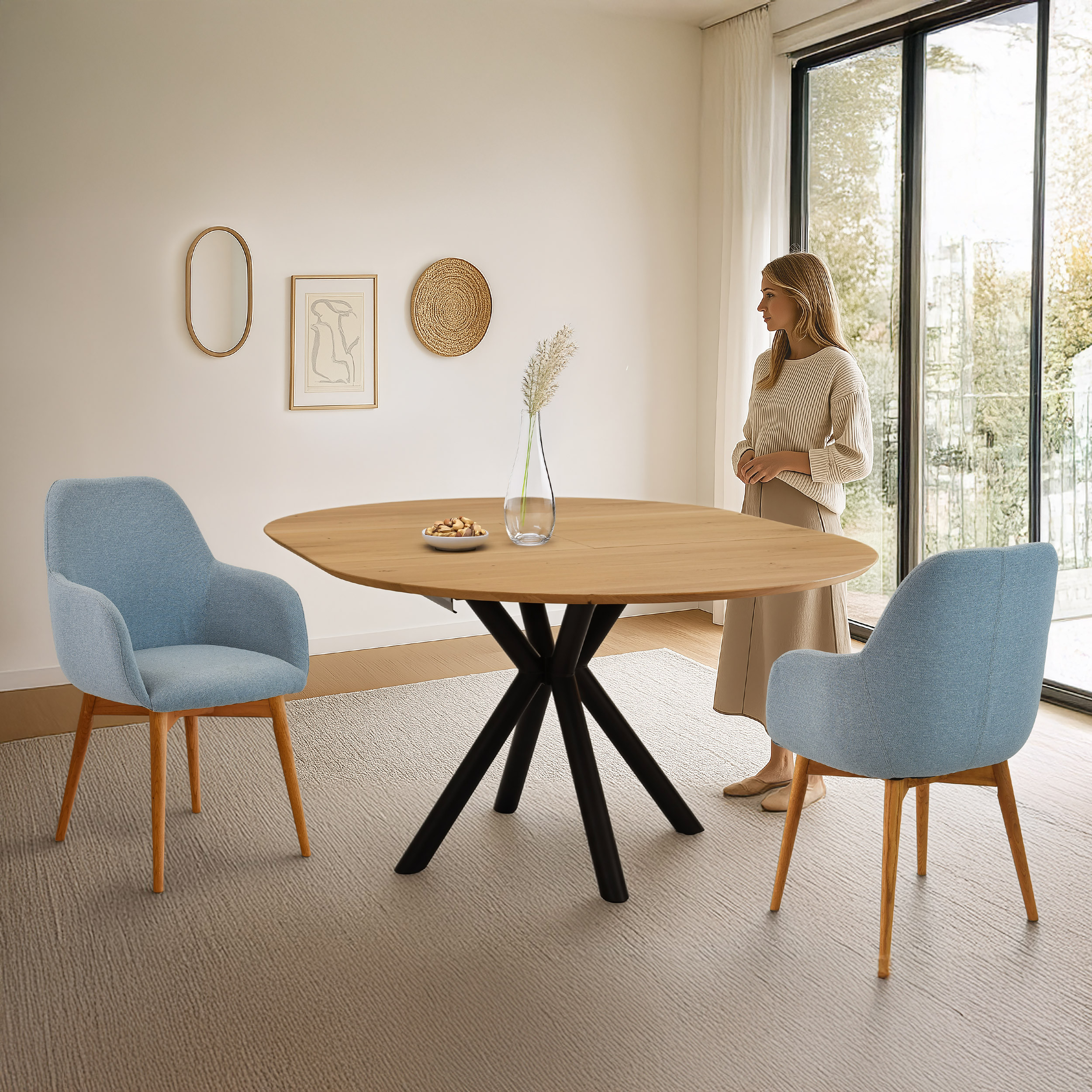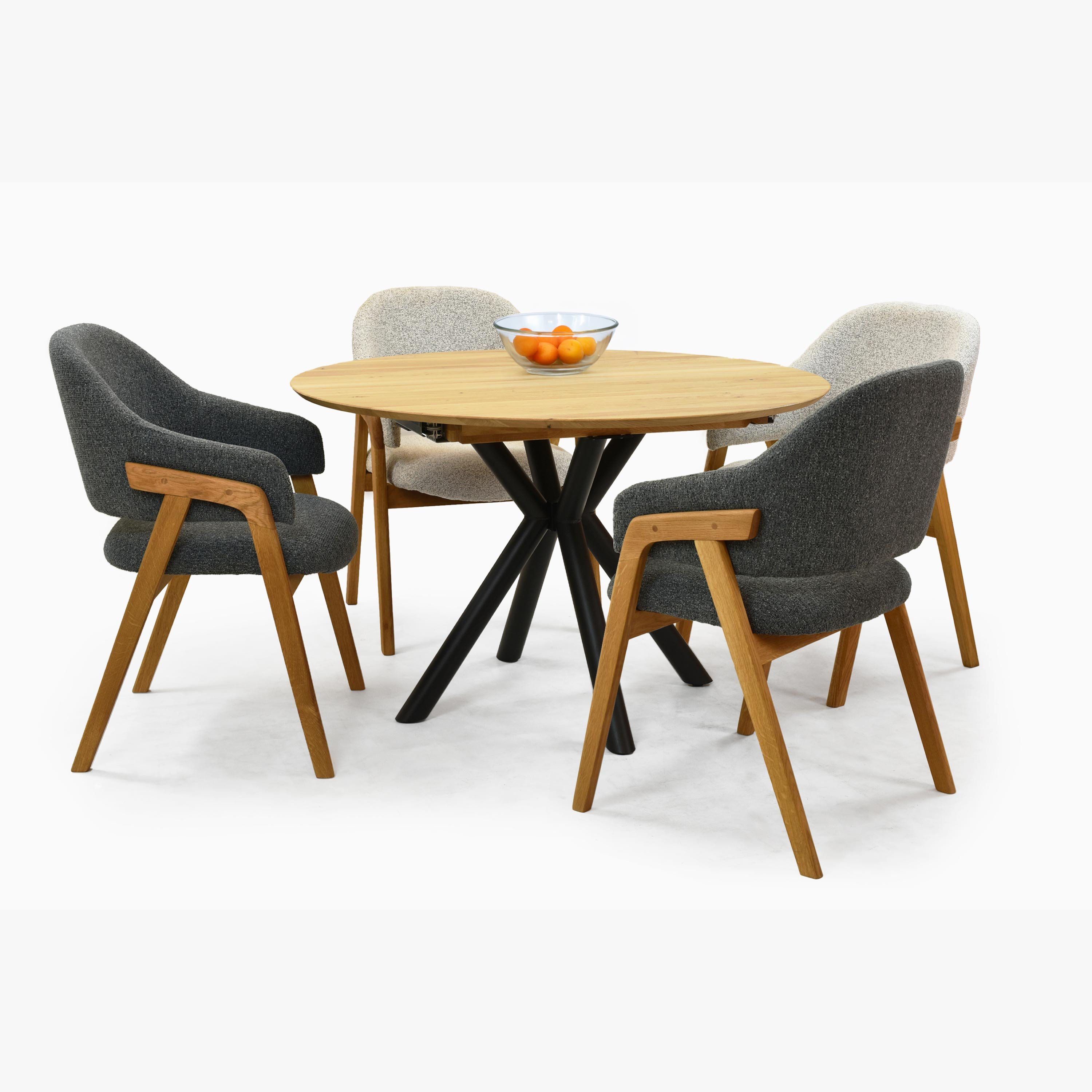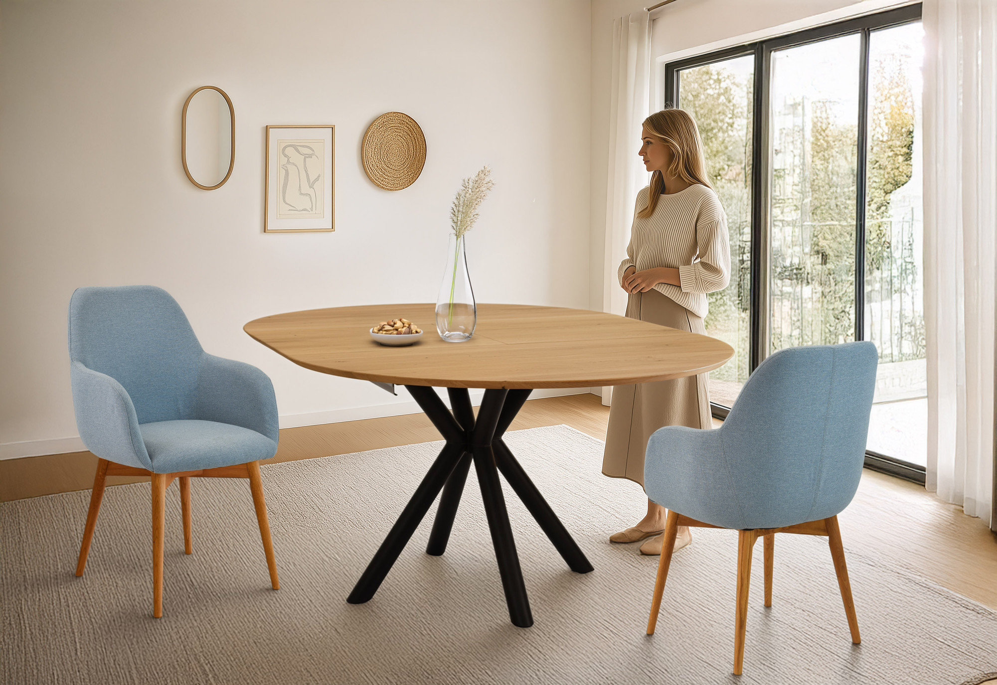Der runde ausziehbare Tisch Karol ist eine meisterhafte Verbindung traditioneller Handwerkskunst und moderner Funktionalität. Die Platte mit einem Durchmesser von 120 cm aus massiver Eiche verleiht dem Interieur Wärme und authentischen Charakter, während der versteckte Schmetterlingsmechanismus den Tisch innerhalb weniger Sekunden in einen ovalen Tisch mit einer Länge von 170 cm verwandelt – ideal, wenn sich eine große Familie oder Freunde versammeln. Robuste schwarze Metallbeine mit elegantem Kreuzgestell bringen einen luftigen industriellen Akzent und garantieren Stabilität auch bei maximaler Ausziehung, ohne dabei Sitzkomfort einzuschränken.