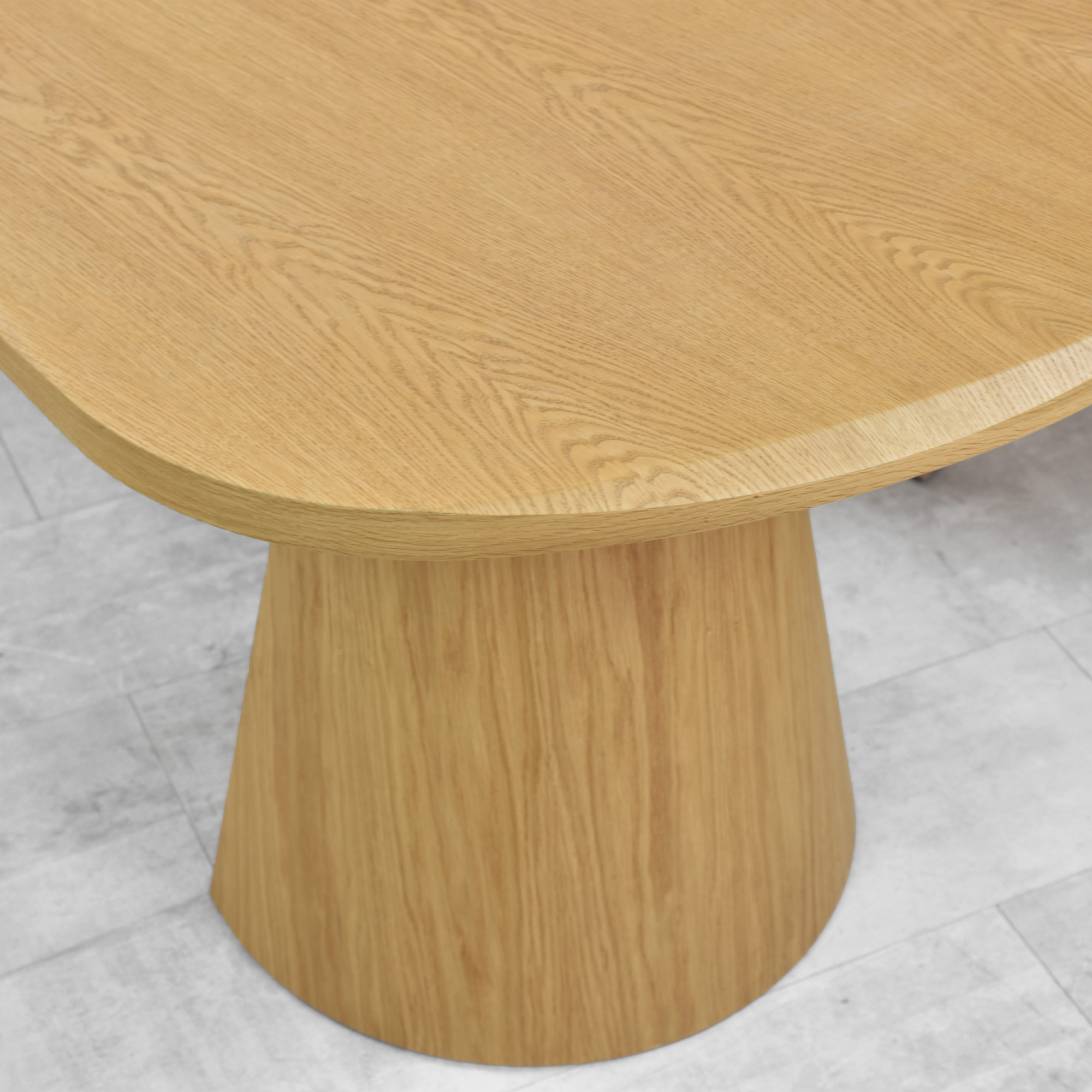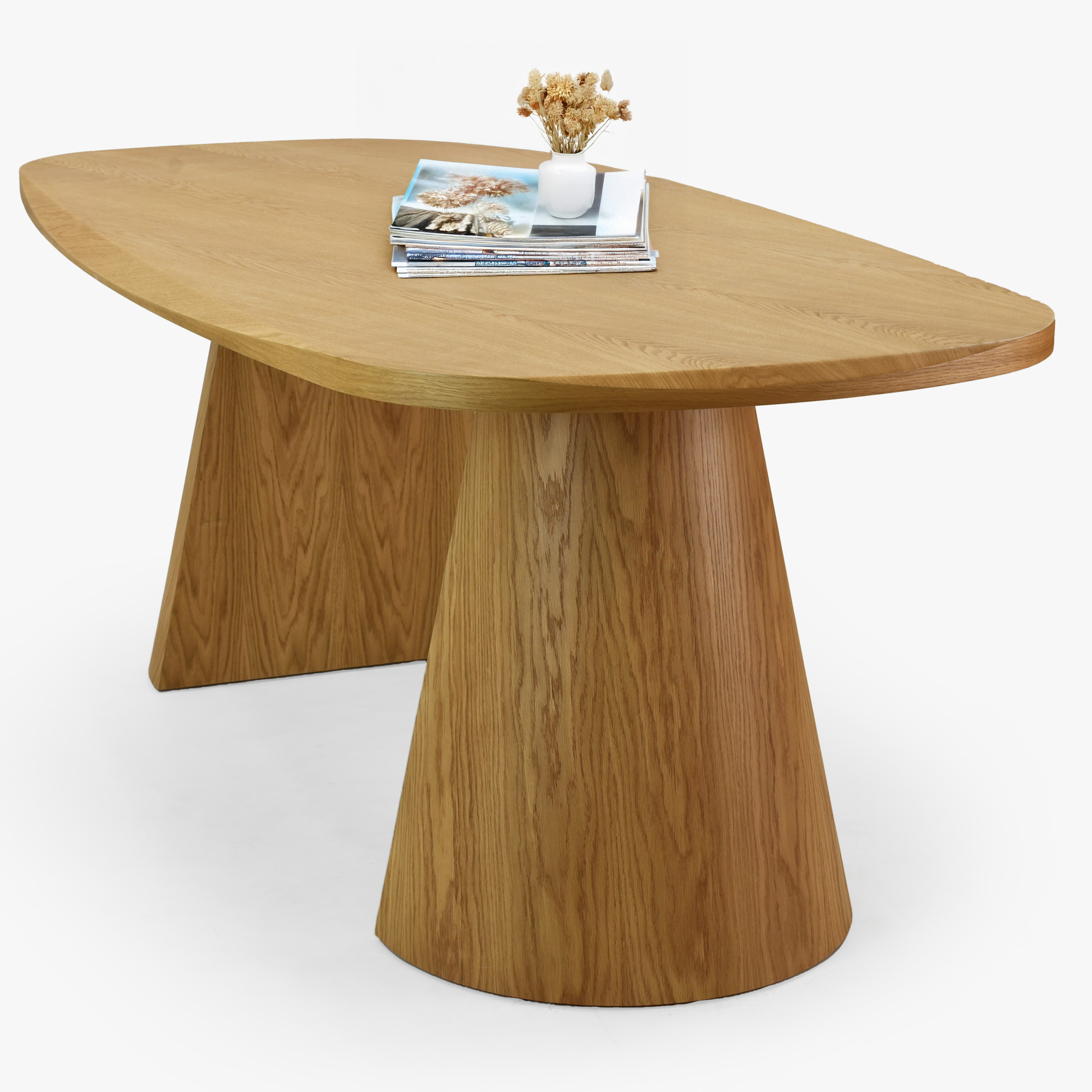 Design-Tisch Eiche 200 × 100 cm ist eine Hommage an traditionelles Handwerk und modernes Design. Seine organisch abgerundete Platte aus sorgfältig ausgewähltem Eichenfurnier bringt Wärme und eine einzigartige Holzmaserung in den Innenraum, während das Paar konisch zulaufender Beine der Gesamtoptik standhafte Stabilität verleiht. Der natürliche Farbton Eiche natur ist mit einem hoch widerstandsfähigen, schadstofffreien ökologischen Lack geschützt, sodass Sie weder vor verschütteten Säften noch vor Kinderspielen Angst haben müssen. Dank der klaren Formensprache kommt der Tisch sowohl in minimalistischen als auch rustikalen Esszimmern hervorragend zur Geltung und unterstreicht den Charakter jedes Raumes.