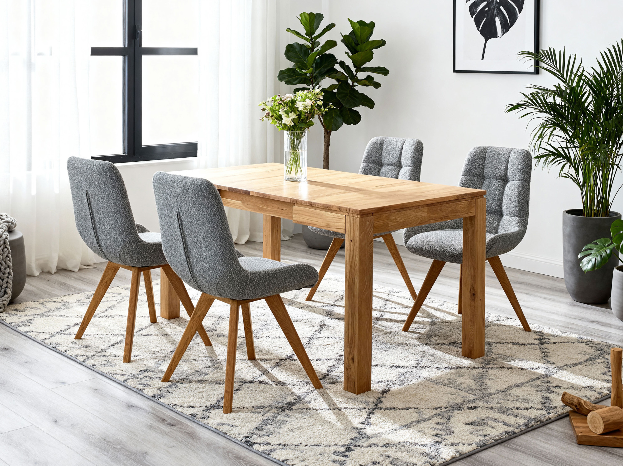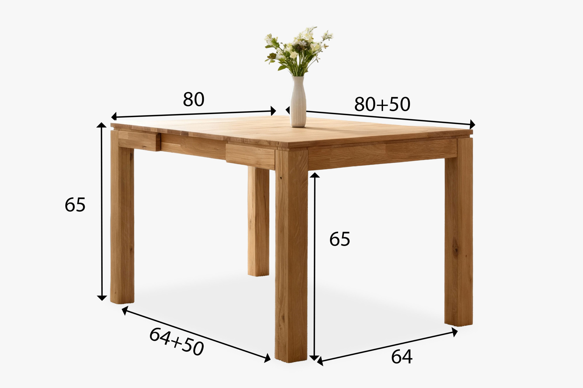 Dieser Esstisch aus Eichenholz ist für alle gedacht, die in der Küche oder im Esszimmer mit Platzmangel zu kämpfen haben. Die Grundfläche des Tisches beträgt 80 x 80 cm, was ideal für kleinere Räume ist. Dank seiner Ausziehfunktion kann der Tisch leicht auf 130 x 80 cm vergrößert werden, was ausreichend Platz für 4–6 Personen bietet. Ein Vorteil dieses Tisches ist seine vollmassive Ausführung, die hohe Widerstandsfähigkeit und eine lange Lebensdauer gewährleistet. Der Ausziehmechanismus ist clever direkt im Tisch versteckt, was zu seinem eleganten Aussehen beiträgt.