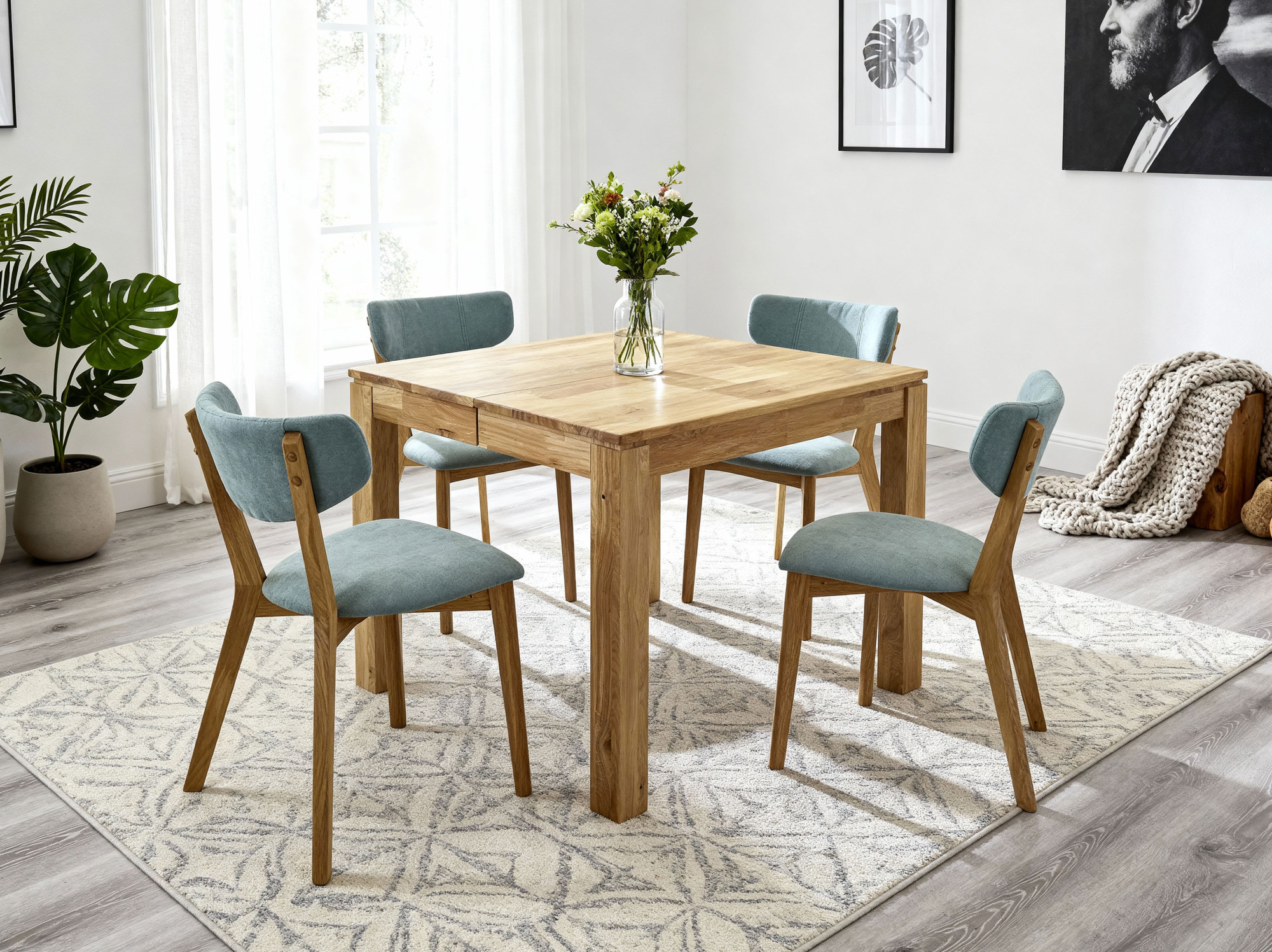 * Auf dem Bild quadratischer Eiche Ausziehtisch 80 x 80 cm und der Esszimmer- Stuhl Amisa in minzfarbenem Polster