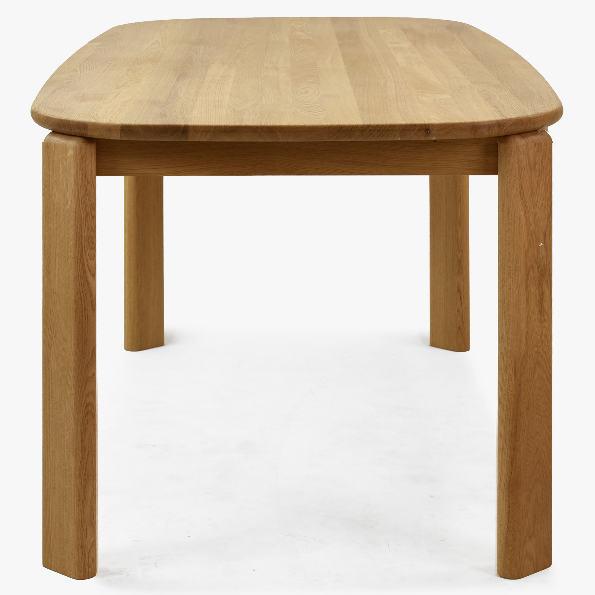 Der Eichen-Esstisch Modell Robi zeichnet sich durch eine oval-runde Form aus, die ausreichend Platz zum Essen bietet und gleichzeitig nicht massiv wirkt. Die 20 mm starke Tischplatte besteht aus ausgewähltem Eichenholz mit FSC-Zertifikat, das Umweltverträglichkeit und Langlebigkeit garantiert. Die Oberfläche ist mit dem italienischen Öl Borma Wachs in der Farbe Eiche Natur behandelt, welches die natürliche Maserung hervorhebt und vor Feuchtigkeit sowie Abnutzung schützt. Der Tisch hat abgerundete Kanten, was besonders Familien mit Kindern zugutekommt.