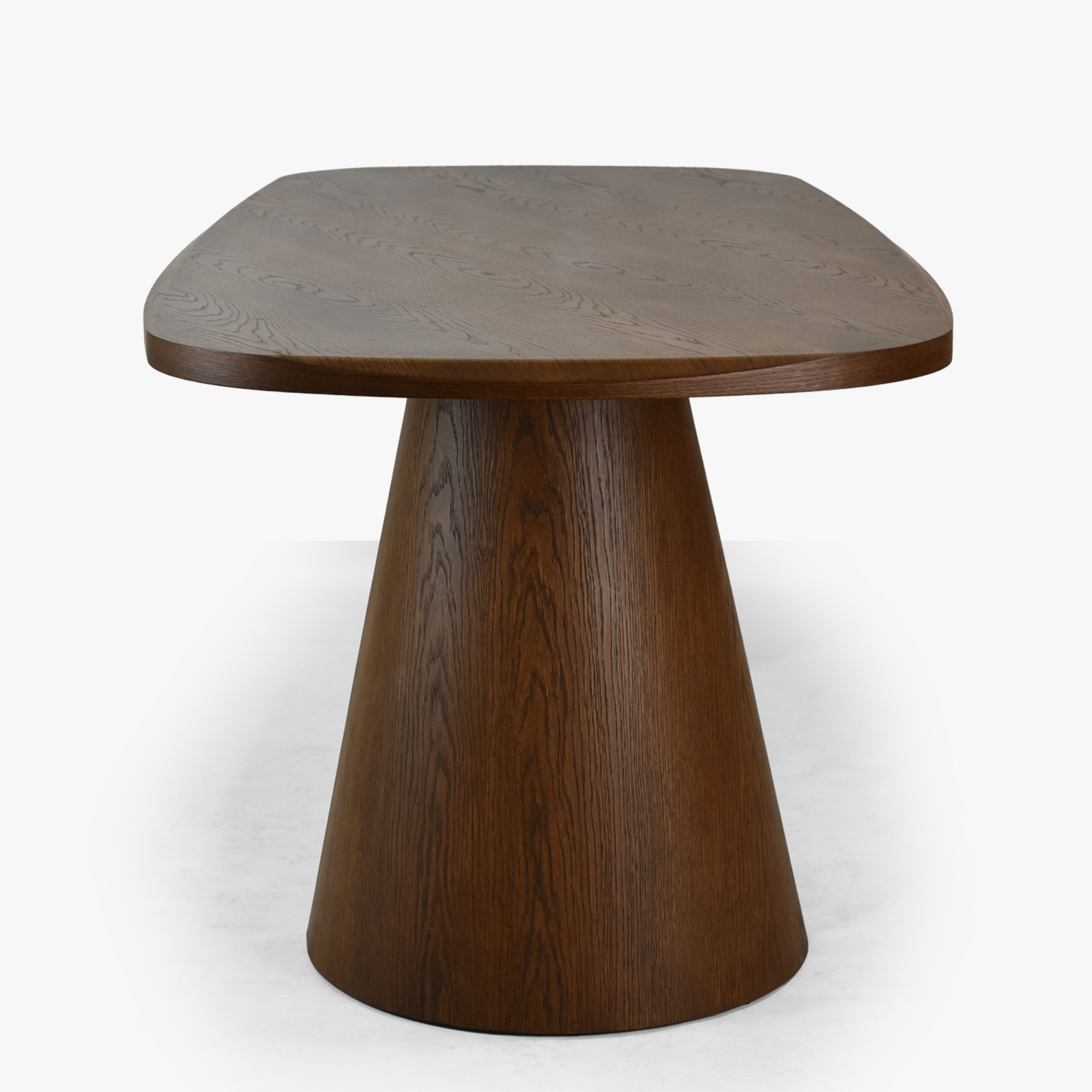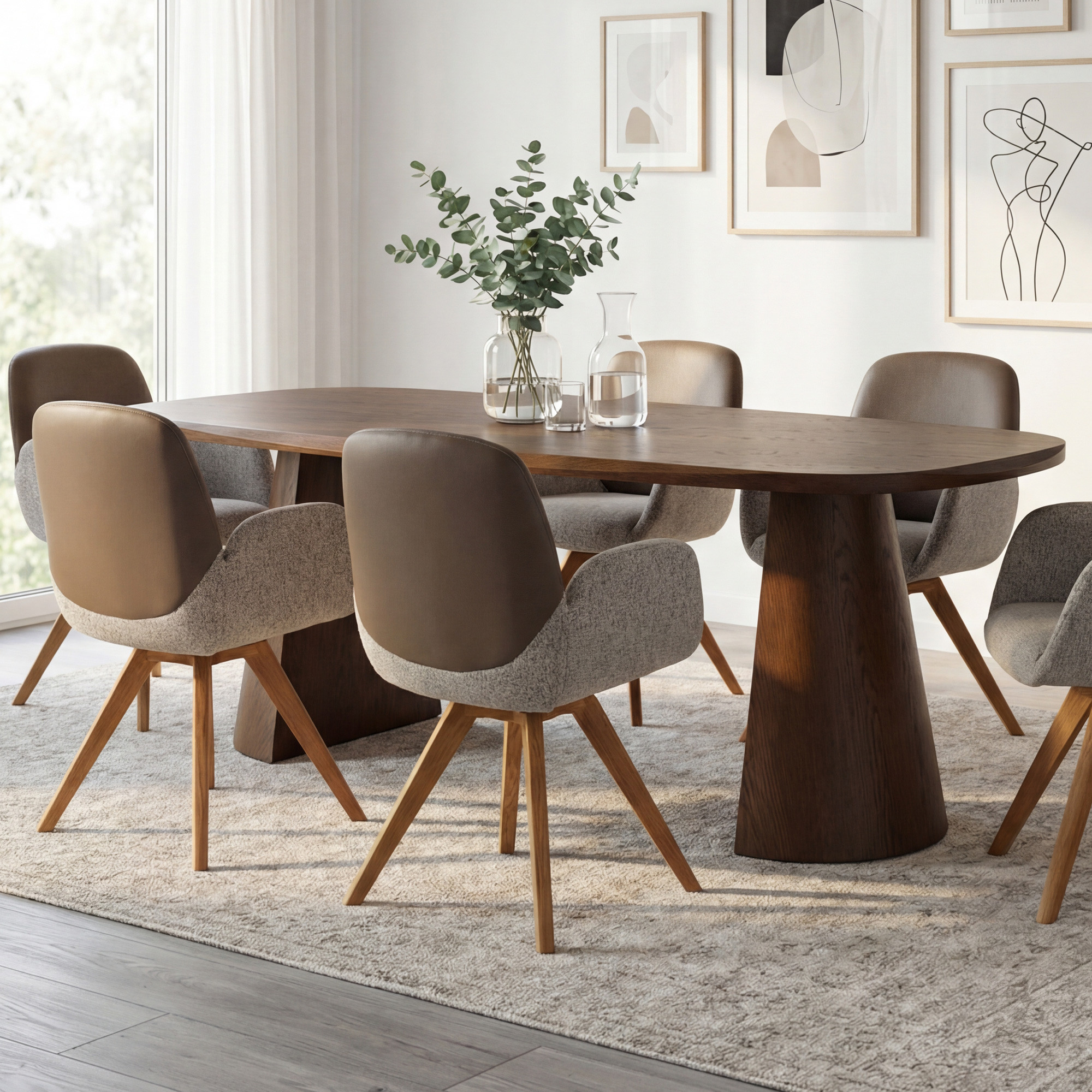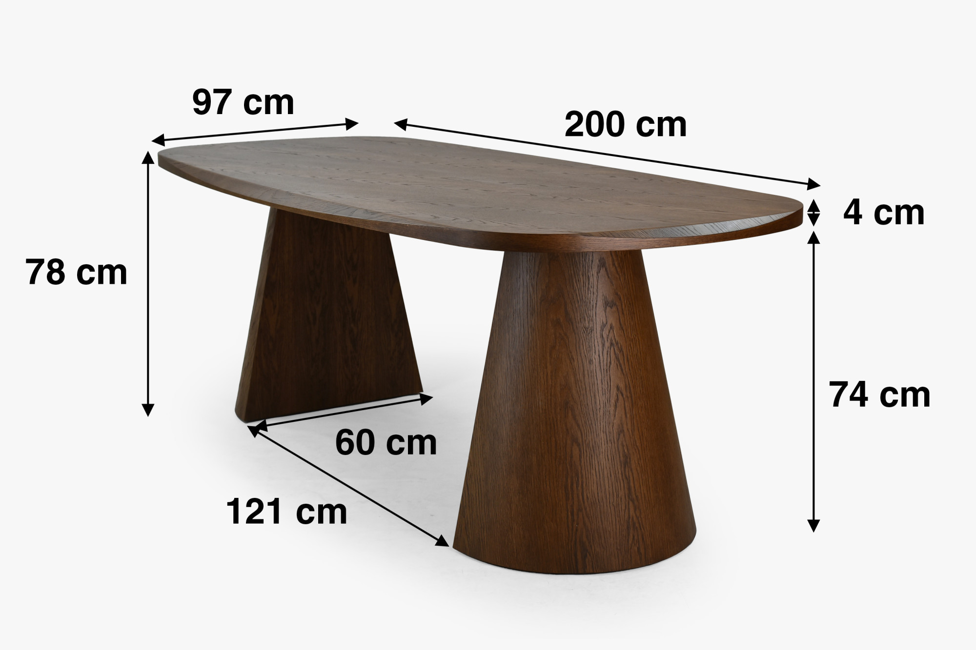 Wir präsentieren Ihnen einen außergewöhnlichen Esstisch mit elegant abgerundeter Form, der zum Herzstück Ihres Esszimmers wird. Dieser Design-Tisch in Nussbaumfarbe mit einer Länge von 200 cm beeindruckt auf den ersten Blick durch seine außergewöhnlich massive Platte mit 4 cm Stärke und einzigartige Beine in zwei unterschiedlichen geometrischen Formen – kegelförmig und pyramidenförmig verleihen dem Tisch einen originellen und modernen Charakter. Abgerundete Kanten rund um die Tischplatte sorgen für Sicherheit und ein angenehmes Erscheinungsbild.