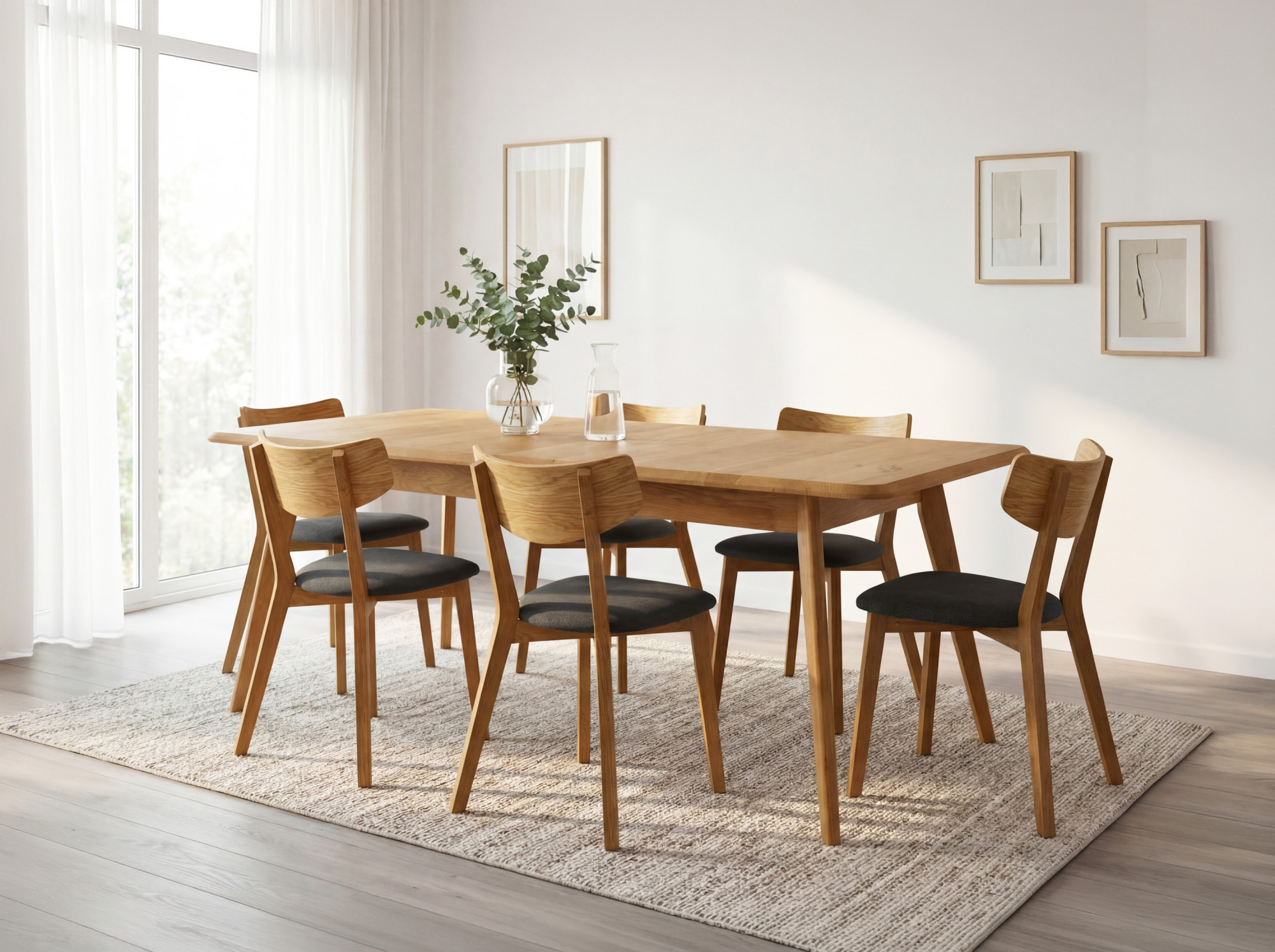 * im Bild Eichentisch Bratislava 180 x 90 und Esstischstuhl Jonathan in hellem Stoff.