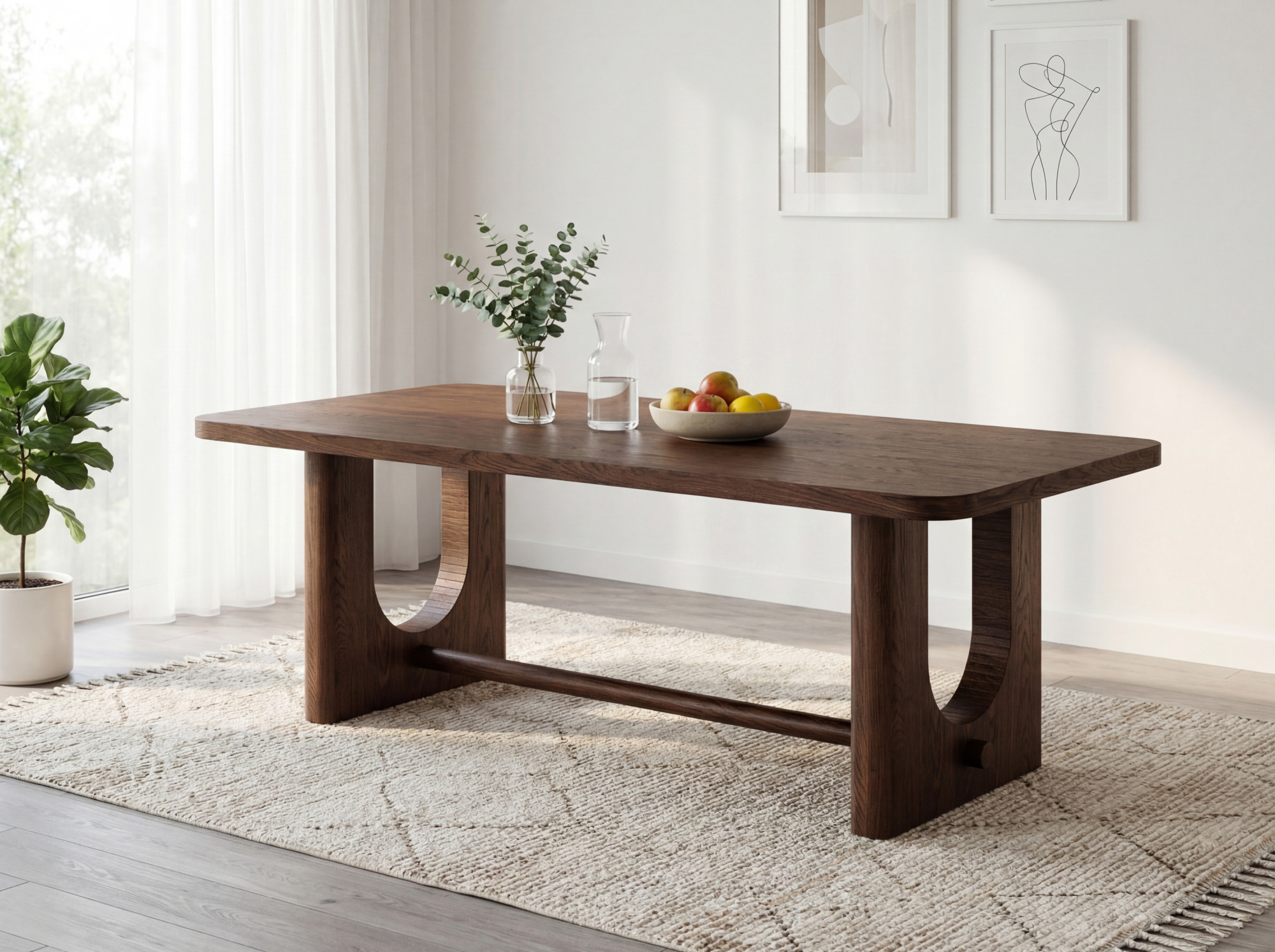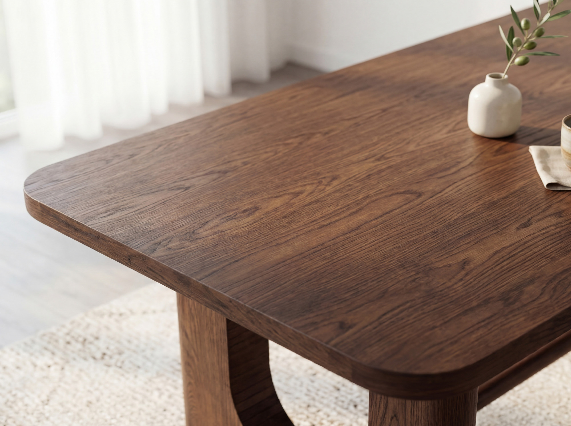 Der Esstisch Richmond ist aus premium Eichenfurnier mit einer tragenden Konstruktion aus MDF gefertigt, was außergewöhnliche Stabilität und lange Lebensdauer garantiert. Die Oberfläche ist mit mattem Lack in Nussbaumton behandelt, der das Möbelstück effektiv schützt und die natürliche Holzstruktur schön hervorhebt. Mit den Maßen 220 × 100 cm und einer Höhe von 78 cm bietet der Tisch ausreichend Platz für bequemes Essen von 6–8 Personen. Die Breite von 100 cm ermöglicht eine komfortable Eindeckung auf beiden Seiten des Tisches.