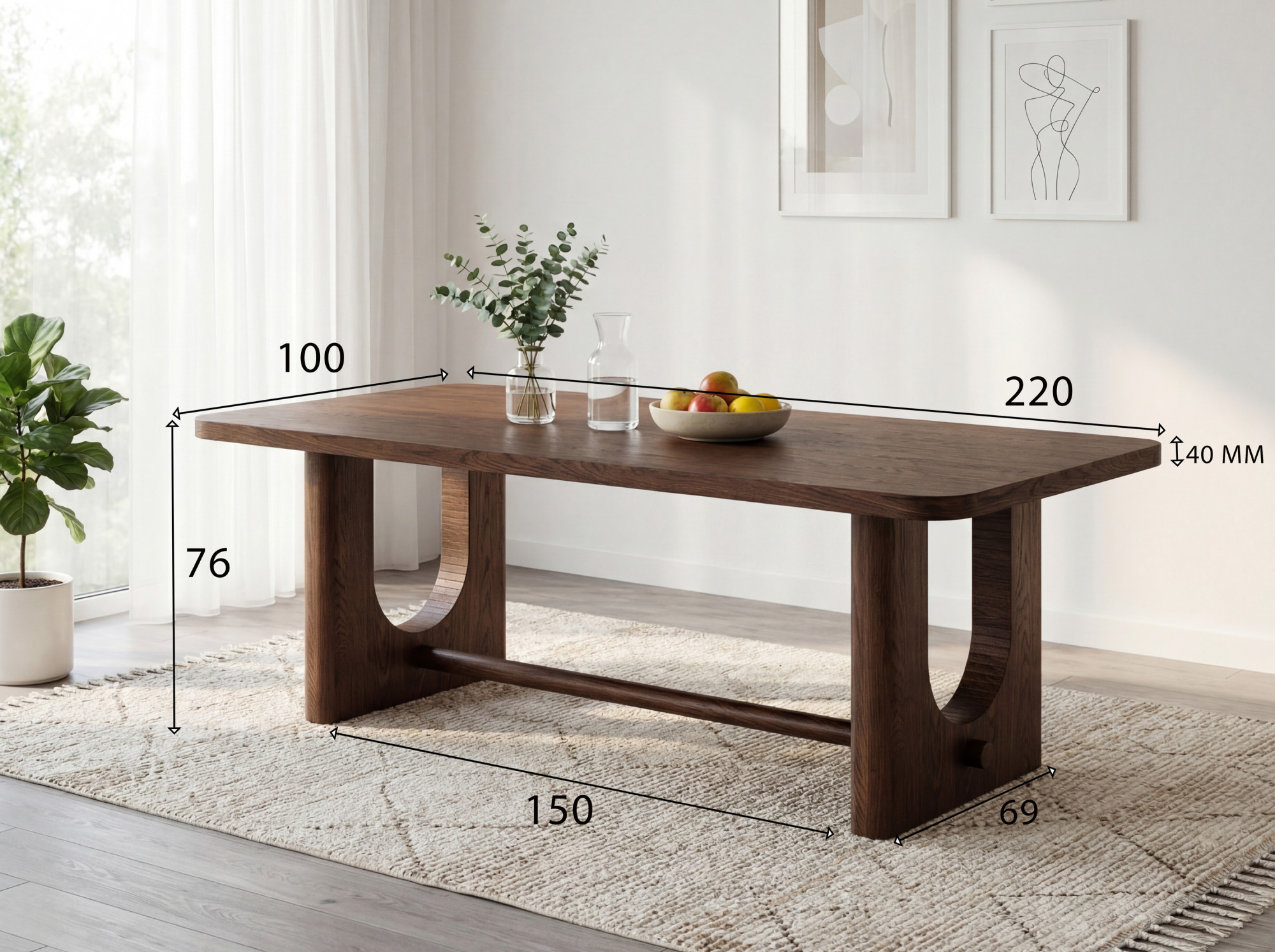 Ja, der Tisch ist mit zwei massiven Füßen mit breiter Basis ausgestattet, die maximale Stabilität auch bei der längeren Platte von 220 cm gewährleisten. - Wie pflege ich die Tischoberfläche?