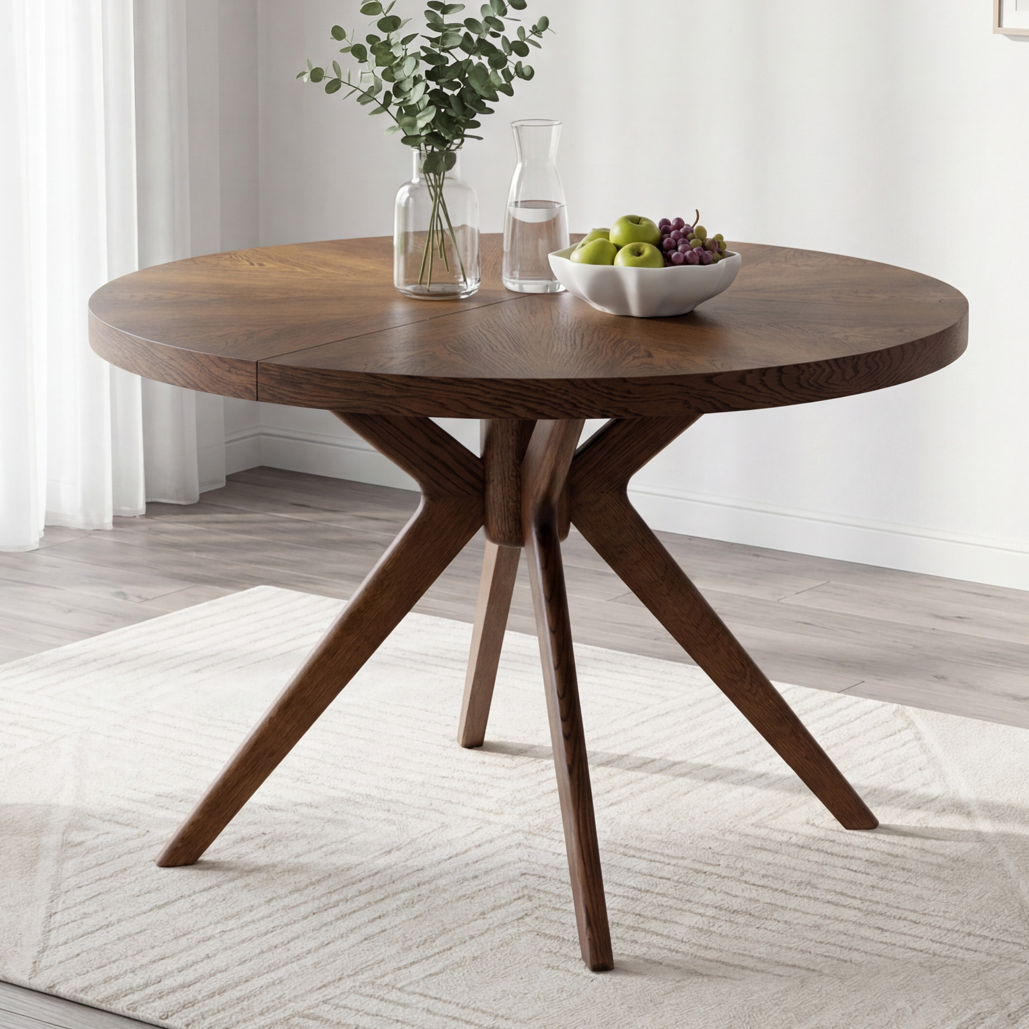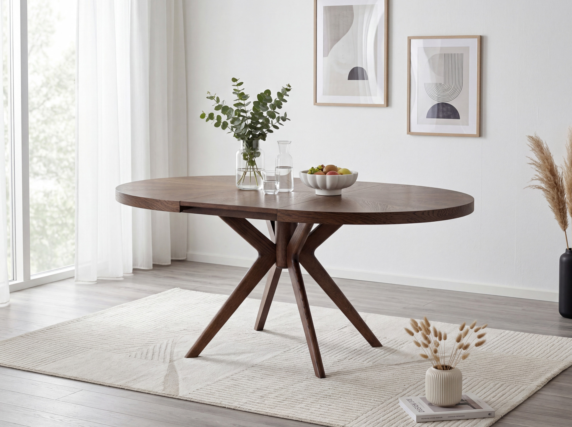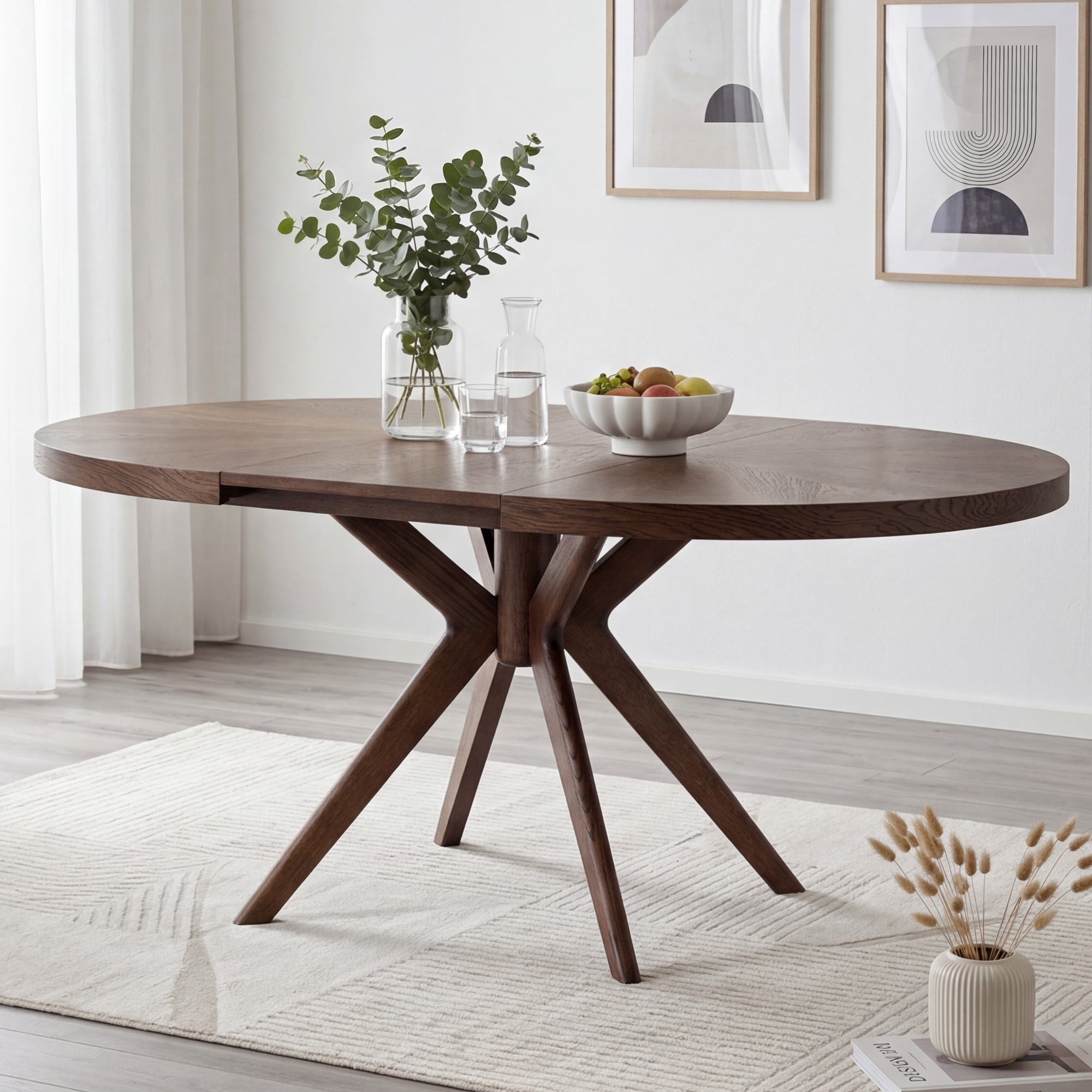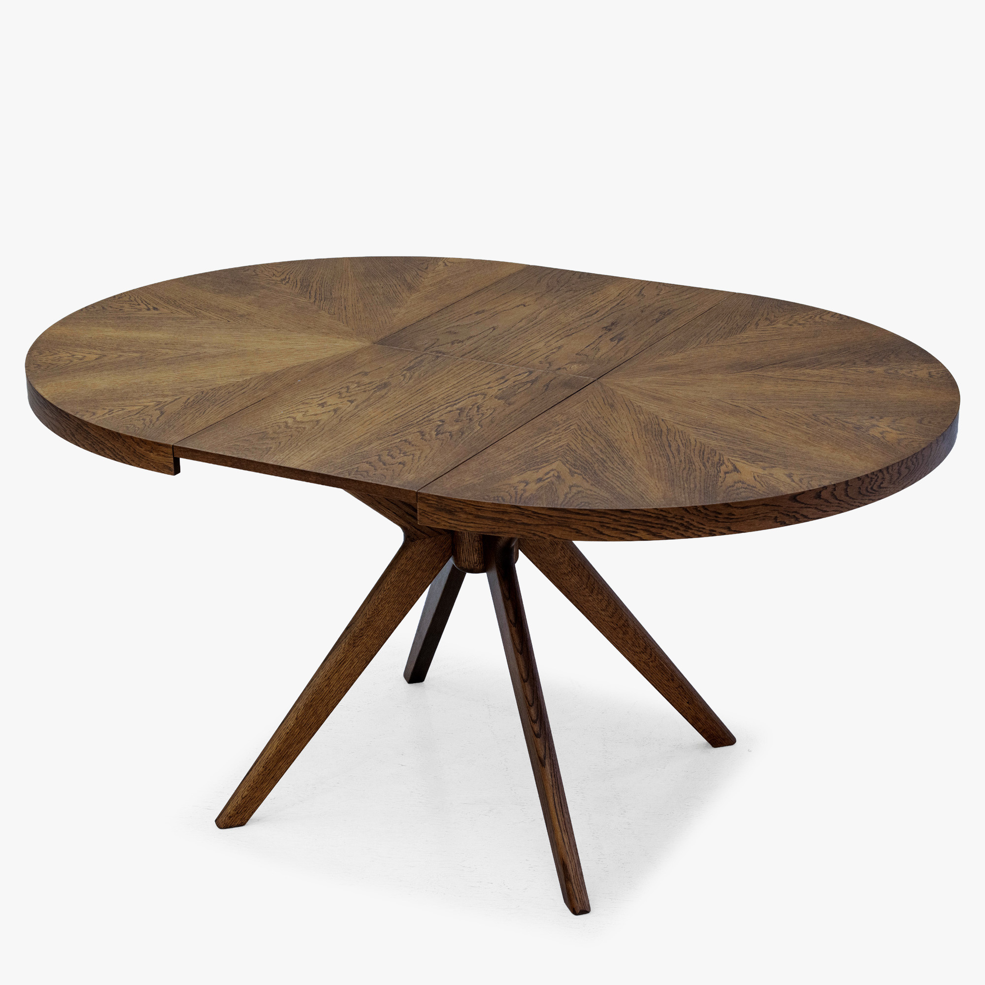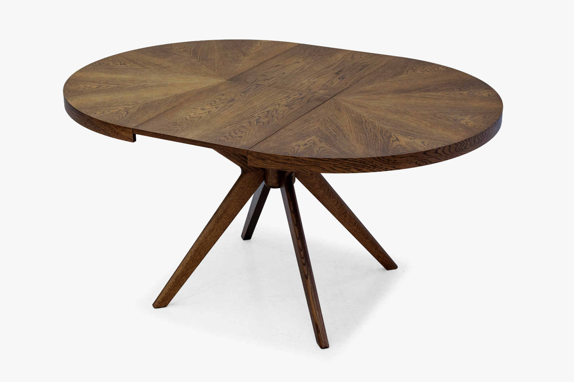 Der Gesamteindruck des Tisches wird durch massive Eichentischbeine mit einem effektvollen, designorientierten Ausfächerungs-Design unterstrichen, die dem Möbelstück einen dynamischen und modernen Charakter verleihen. Die Stabilität wird durch eine Mittelverbindung gewährleistet, von der aus die Beine strahlenförmig nach außen verlaufen. Die Oberfläche des gesamten Tisches ist mit mattem Lack behandelt, der das Holz wirkungsvoll vor täglicher Abnutzung schützt und zugleich die natürliche Struktur sowie den warmen Nussbaumton hervorhebt. Die Tischhöhe beträgt 75 cm, was der standardmäßigen Esstischhöhe entspricht und bequemes Sitzen am Tisch garantiert. Dieses Stück passt hervorragend zu modernen und klassischen Einrichtungen und wird zum Blickfang in Ihrem Esszimmer.