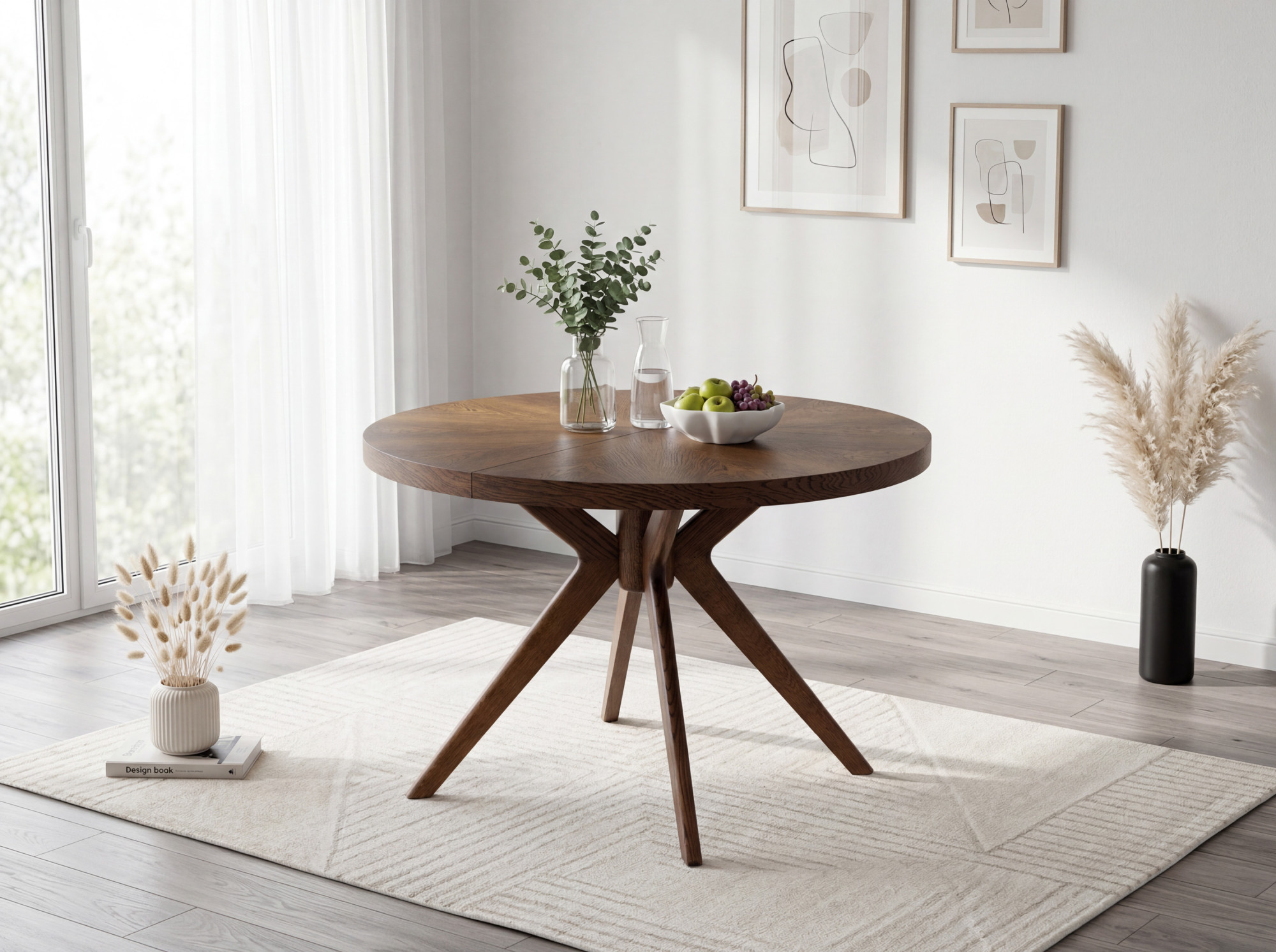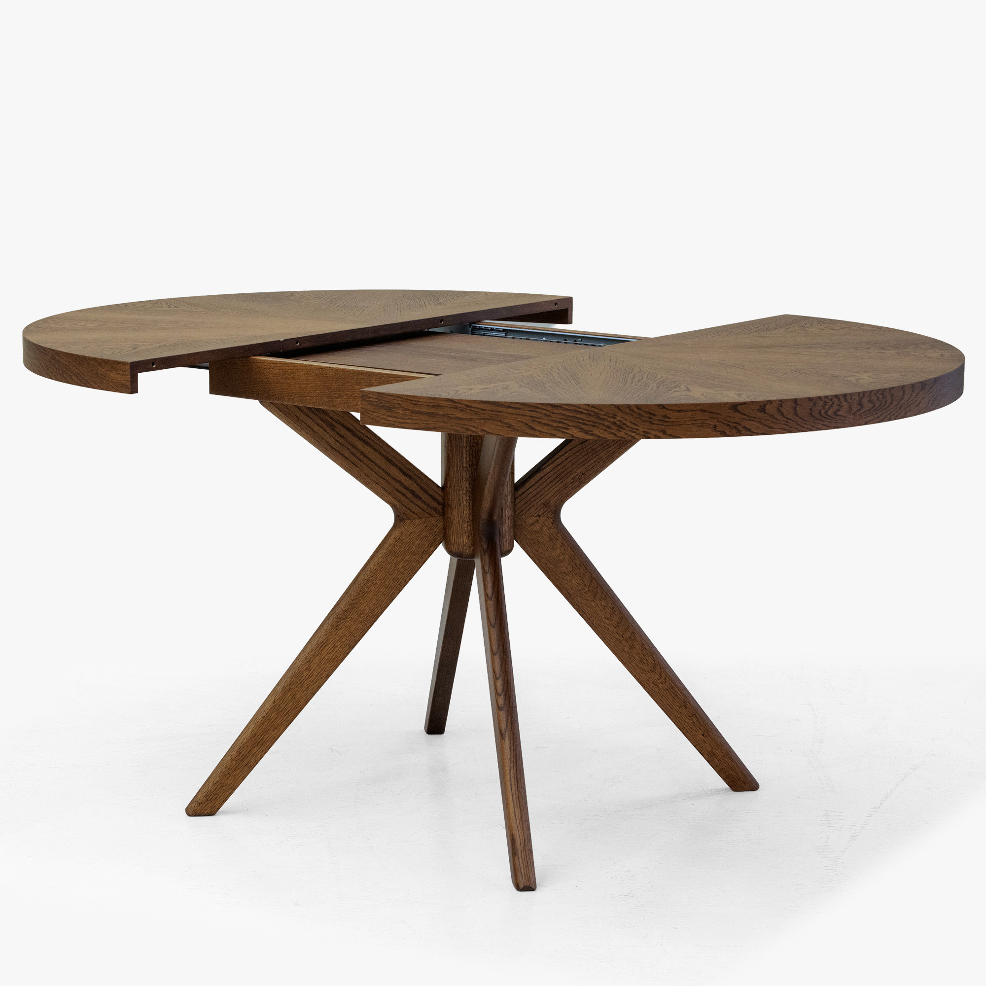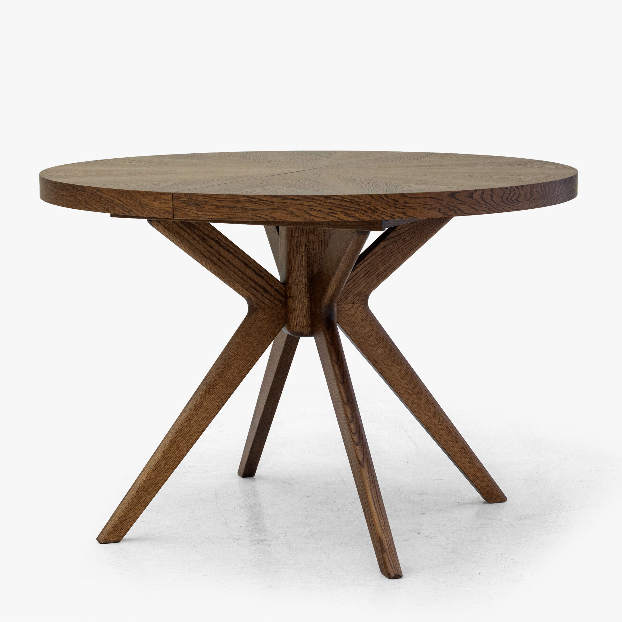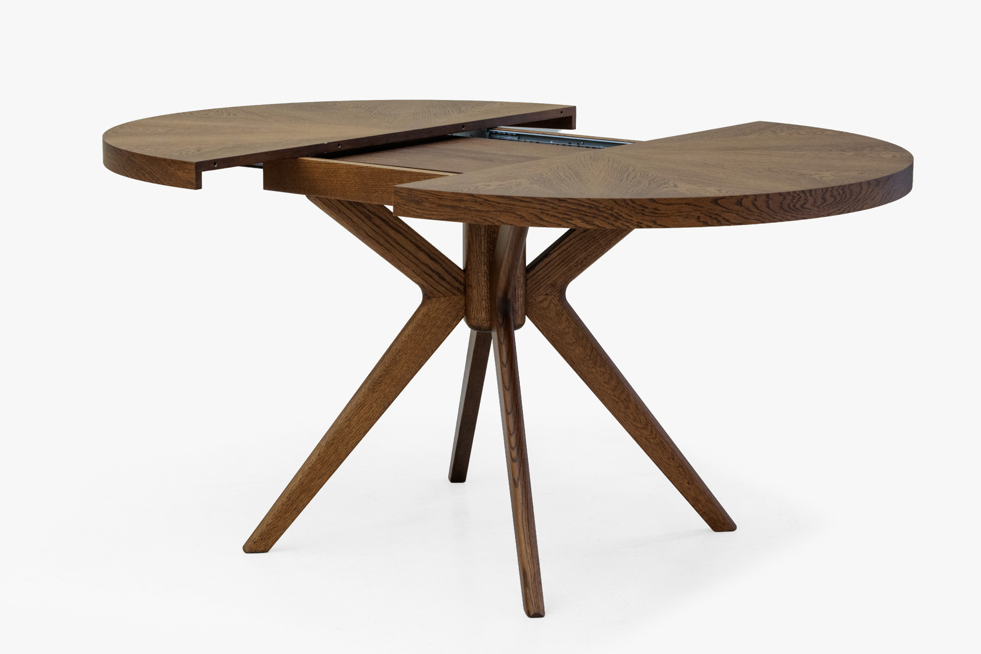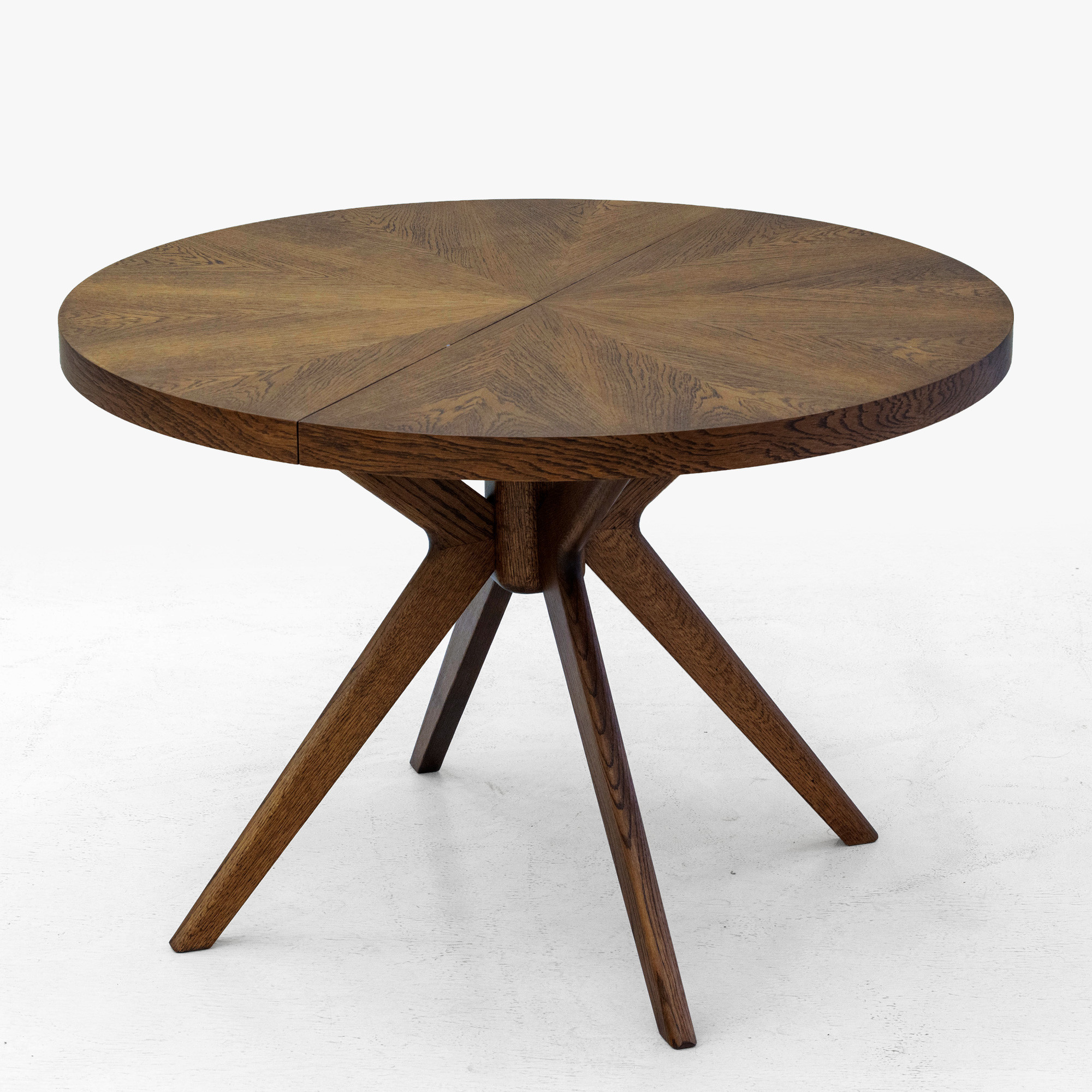 Der Gesamteindruck des Tisches wird durch massive Eichentischbeine mit einem effektvollen, designorientierten Ausfächerungs-Design unterstrichen, die dem Möbelstück einen dynamischen und modernen Charakter verleihen. Die Stabilität wird durch eine Mittelverbindung gewährleistet, von der aus die Beine strahlenförmig nach außen verlaufen. Die Oberfläche des gesamten Tisches ist mit mattem Lack behandelt, der das Holz wirkungsvoll vor täglicher Abnutzung schützt und zugleich die natürliche Struktur sowie den warmen Nussbaumton hervorhebt. Die Tischhöhe beträgt 75 cm, was der standardmäßigen Esstischhöhe entspricht und bequemes Sitzen am Tisch garantiert. Dieses Stück passt hervorragend zu modernen und klassischen Einrichtungen und wird zum Blickfang in Ihrem Esszimmer.