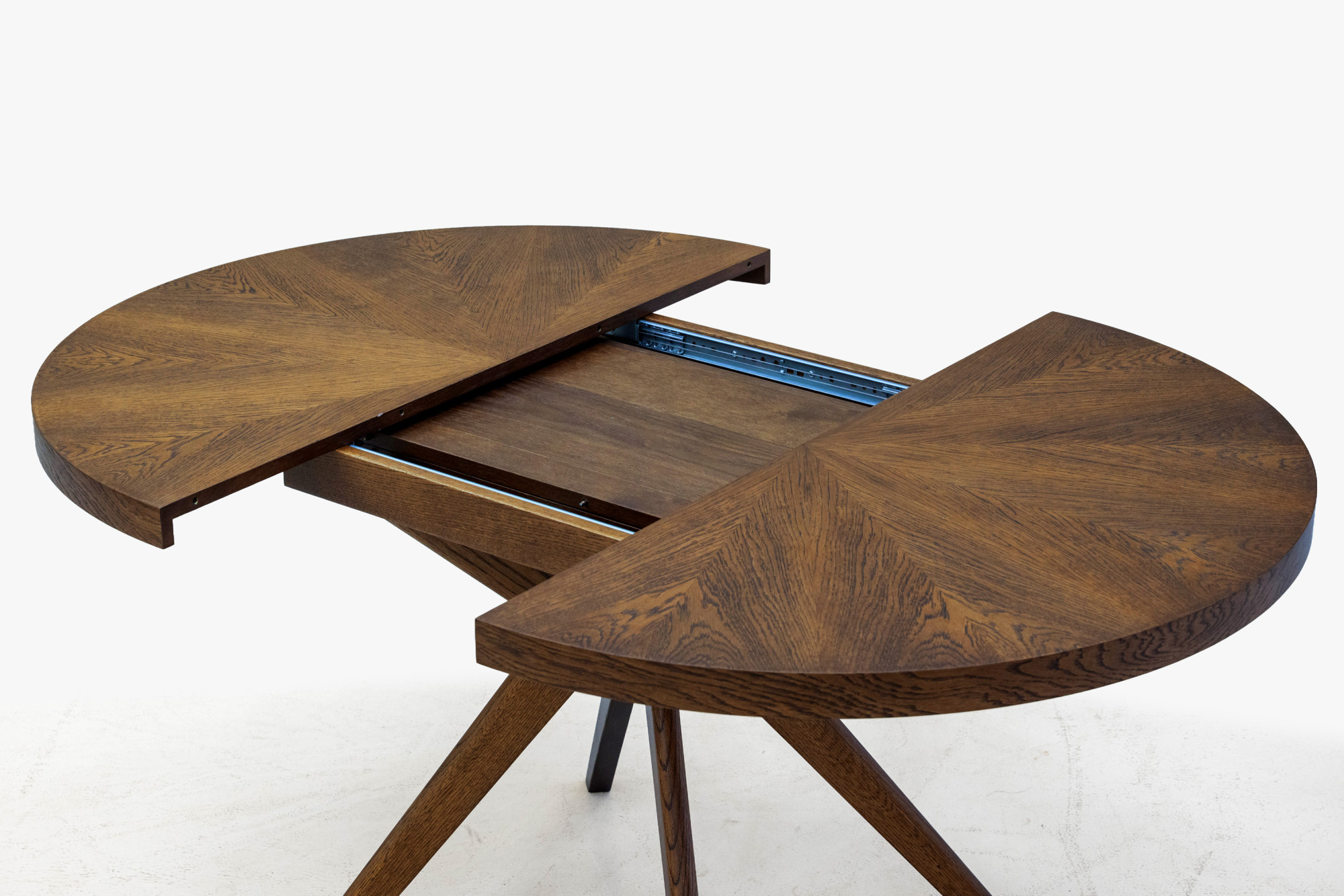 Wir präsentieren Ihnen einen designorientierten runden ausziehbaren Tisch, der mit eleganter Form und durchdachter Funktionalität begeistert. Der Grunddurchmesser der Platte beträgt 100 cm, was die ideale Größe für das tägliche Essen von zwei bis vier Personen ist. Dank des clever versteckten Ausziehmechanismus im Tischinneren kann die Platte leicht ausgezogen und auf eine Länge von 140 cm vergrößert werden, wodurch Platz für bis zu 6 Personen entsteht. Die Tischplatte ist aus Premiumfurnier in Nussbaumfarbe gefertigt, das durch ein dekoratives Muster in sternförmiger Anordnung der Furniersegmente besonders zur Geltung kommt.