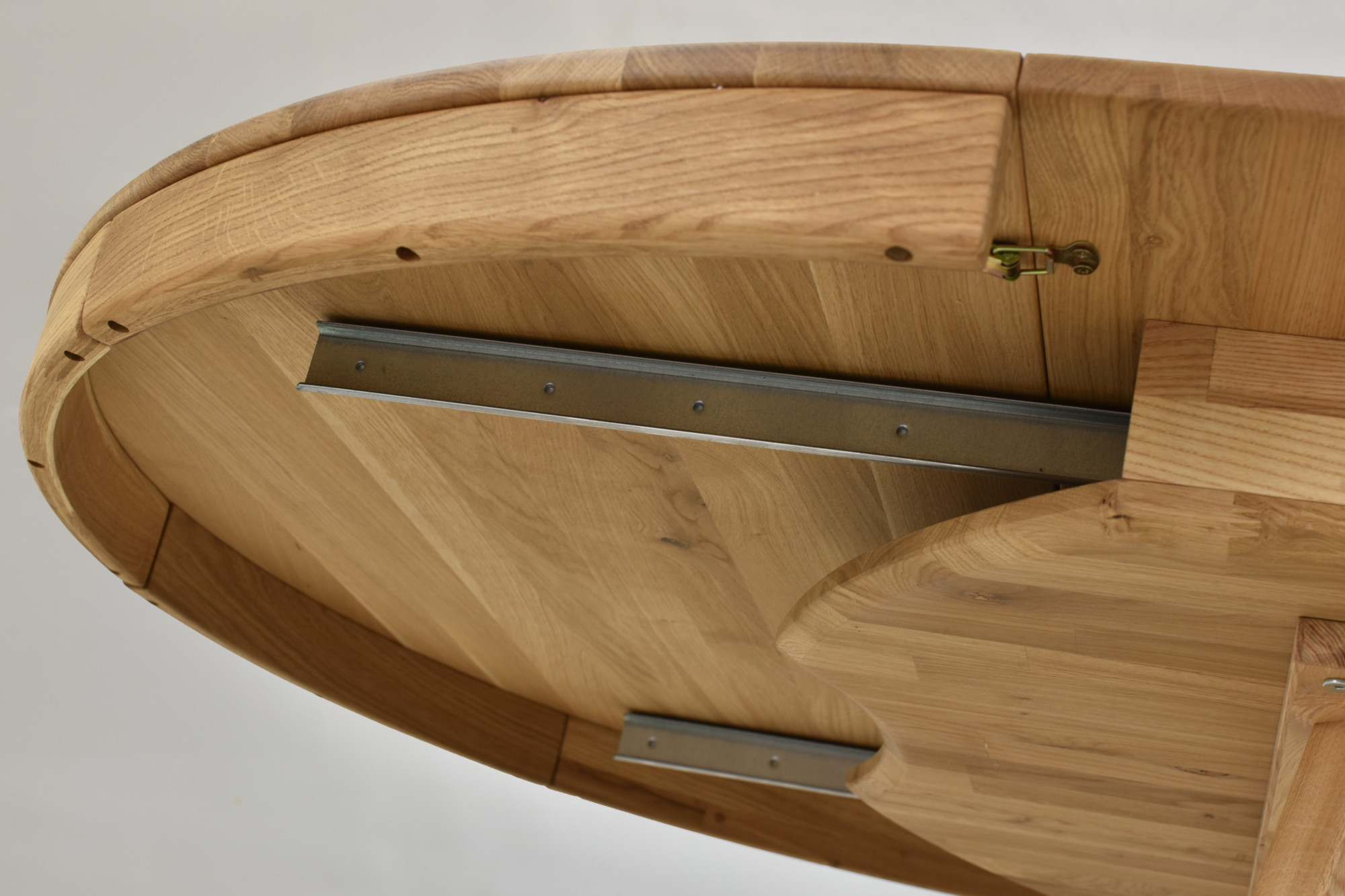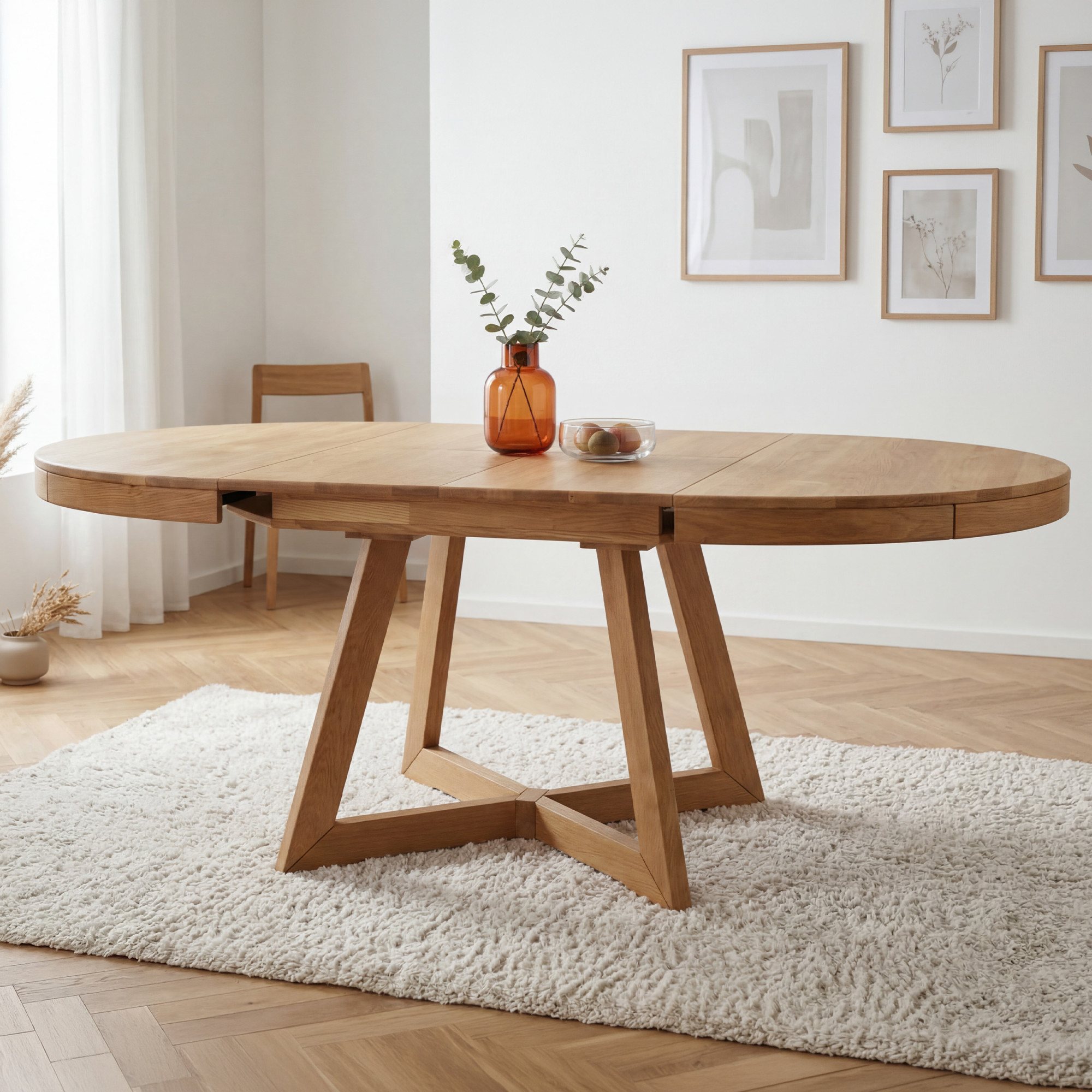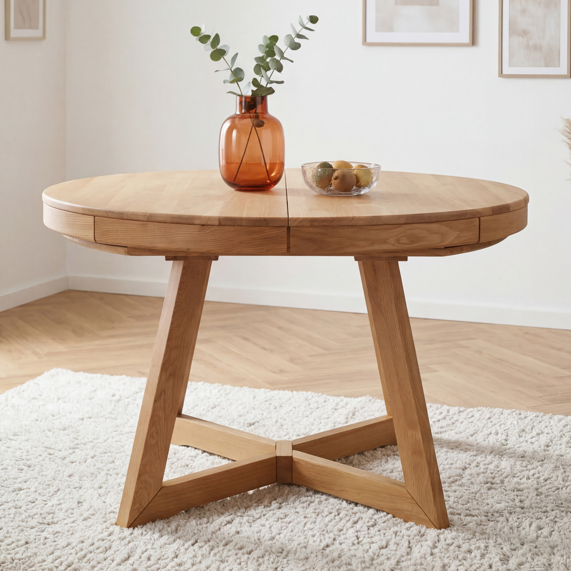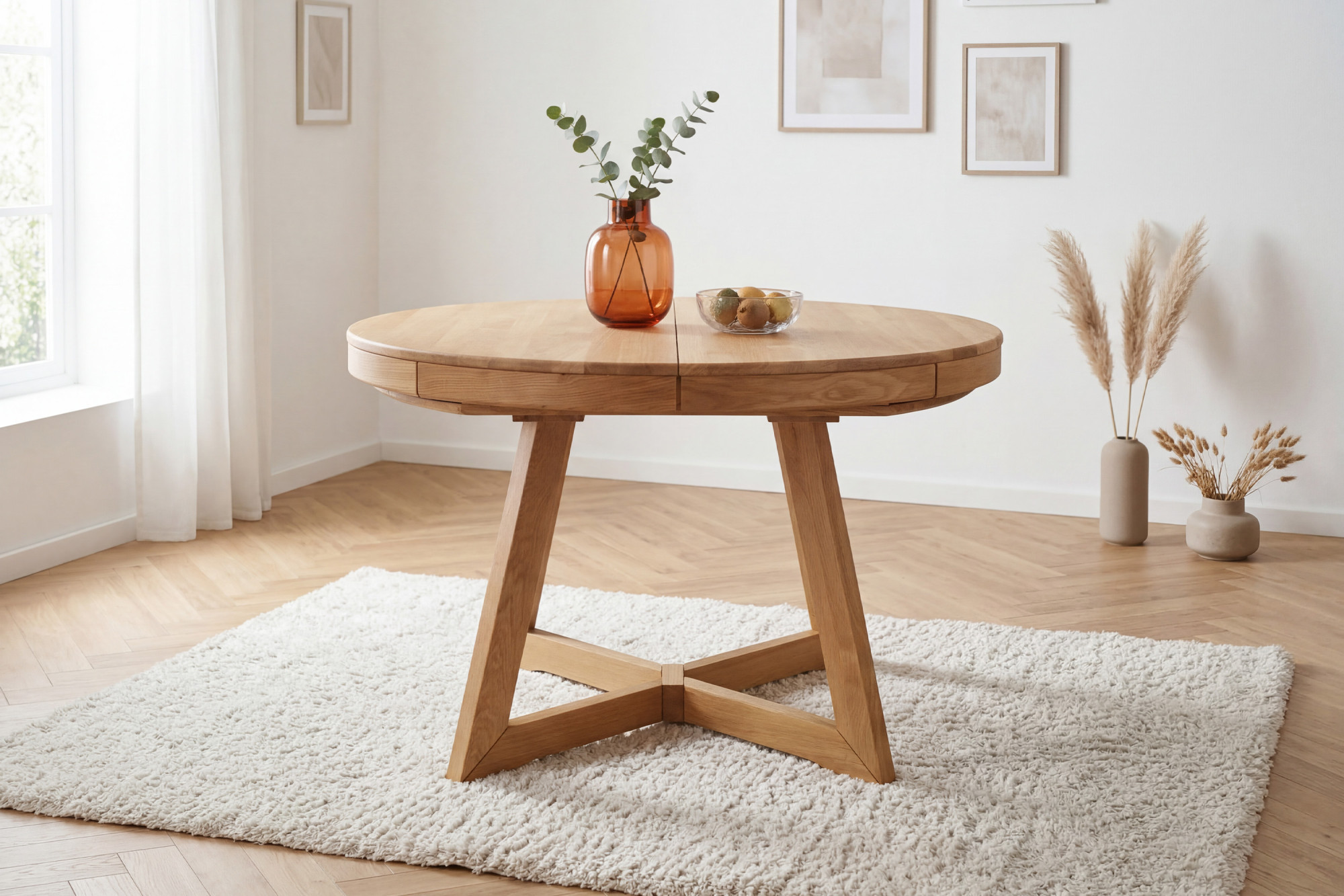 Der runde Eichen-Ausziehtisch Valencia vereint die Schönheit natürlichen Materials, eine stabile Konstruktion und eine praktische Ausziehfunktion. Er ist die ideale Lösung für alle, die einen hochwertigen ausziehbaren Esstisch aus Eiche mit elegantem Design und langer Lebensdauer suchen.