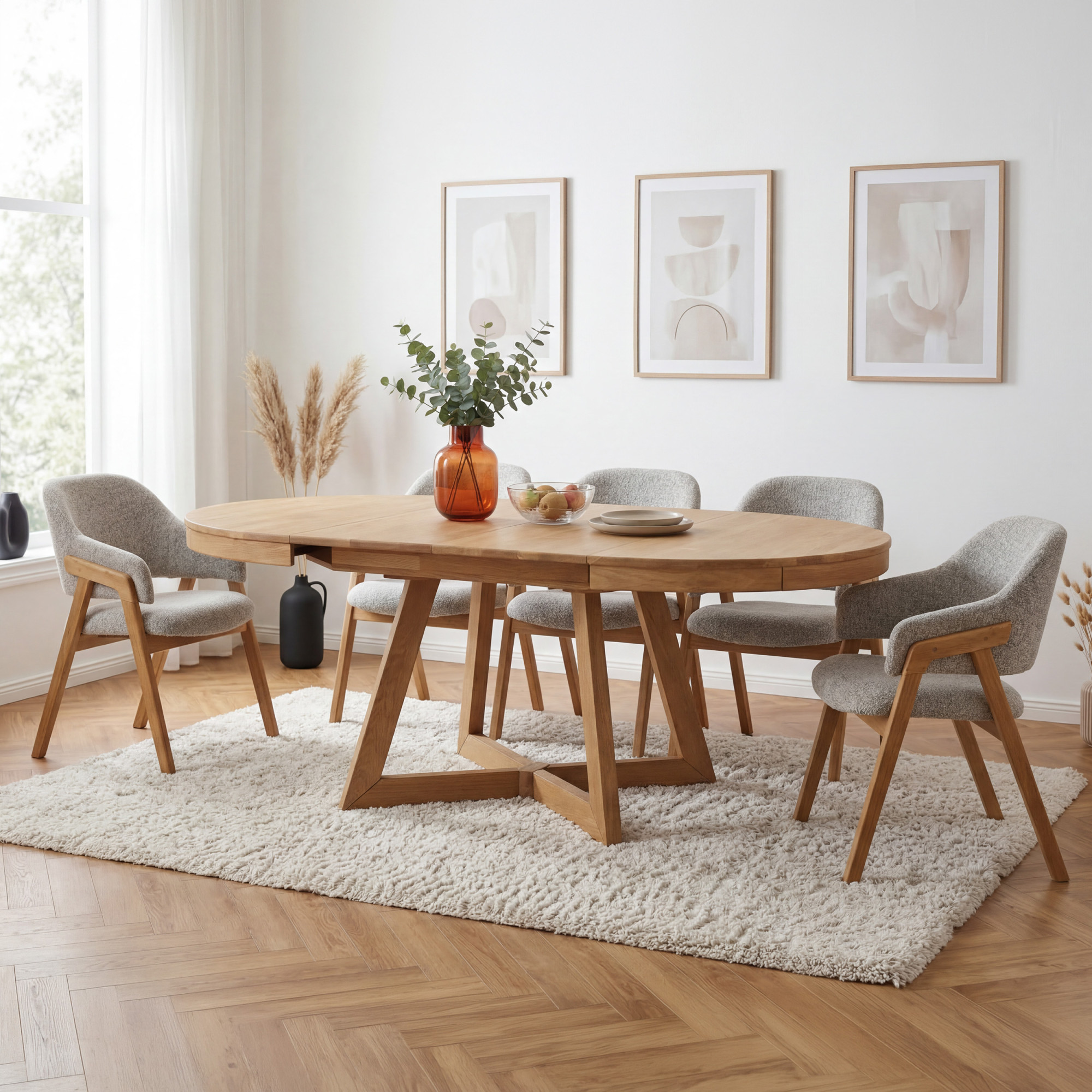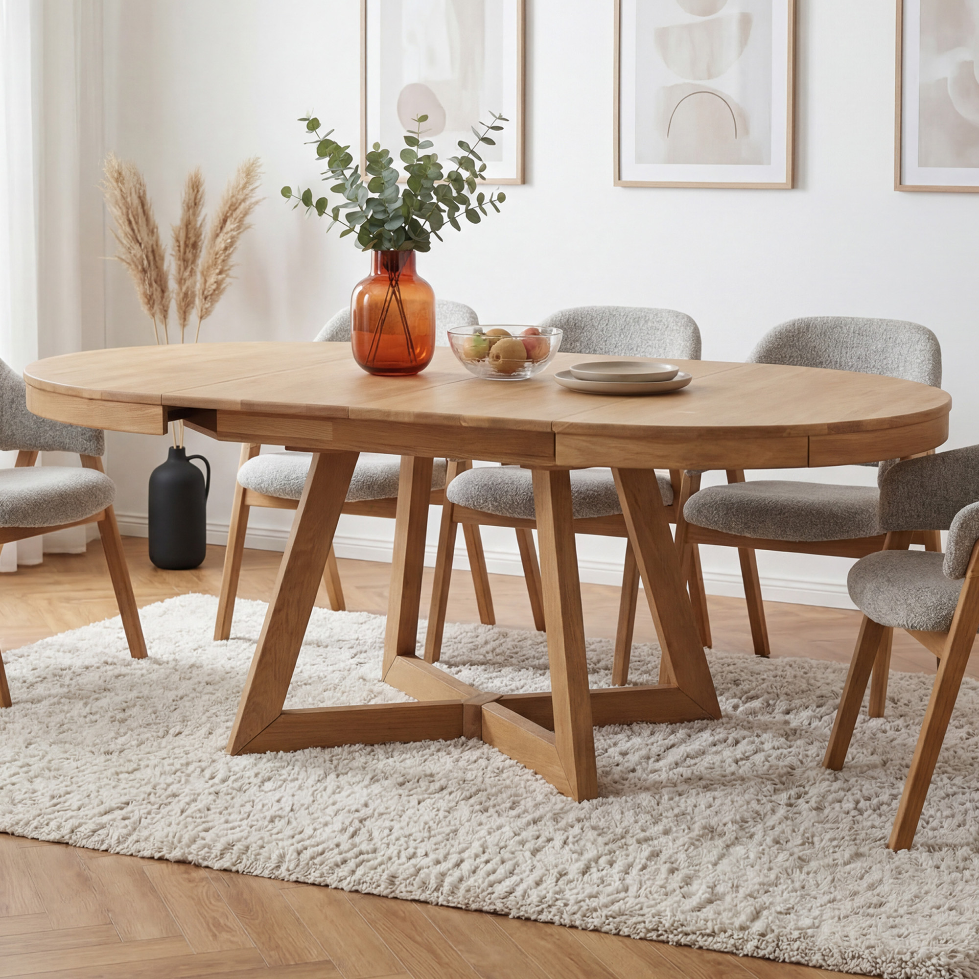 Eichentisch Valencia ist ein eleganter und praktischer Esstisch, der mit zeitlosem Design, hochwertiger Verarbeitung und einer cleveren Ausziehfunktion überzeugt. Dank der runden Form wirkt er im Innenraum luftig und harmonisch, während das massive Eichenholz dem Tisch Stabilität, Festigkeit und natürliche Schönheit verleiht. Dieser runde Ausziehtisch ist die ideale Wahl für moderne, skandinavische und naturverbundene Einrichtungen, in denen sowohl Funktionalität als auch Ästhetik im Vordergrund stehen.