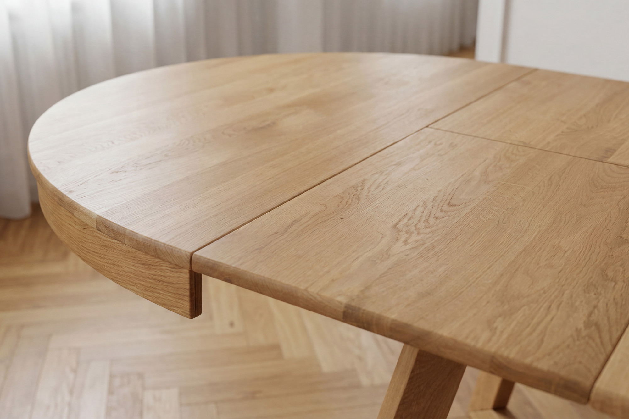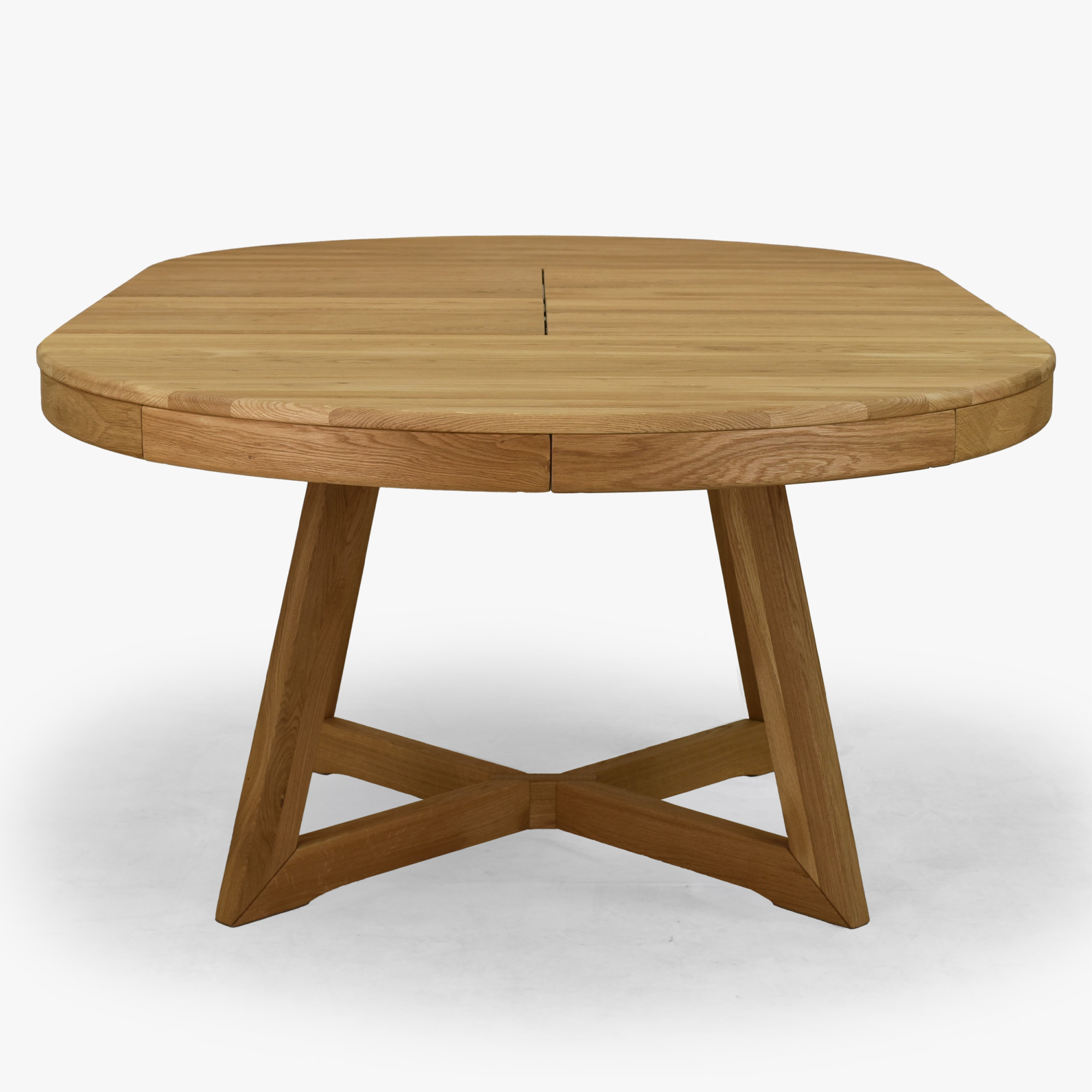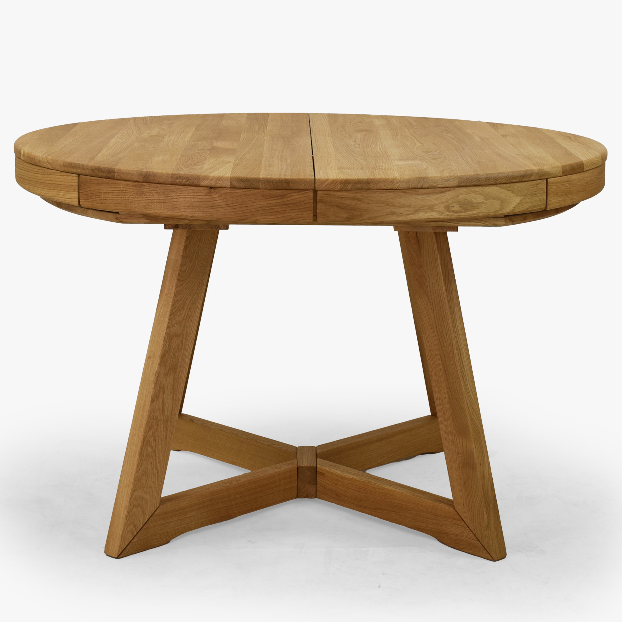 Im Standardausführung hat der Tisch einen Durchmesser von 120 cm, was ihn für bequemes Alltagsessen geeignet macht. Bei Bedarf lässt er sich auf bis zu 200 cm erweitern, und zwar mithilfe von ein oder zwei Einlegeplatten. Der Ausziehteil wird praktisch in der Tischmitte verstaut, was Komfort bei der Nutzung und Platzersparnis bringt. Der Tisch ist aus Eichenholz gefertigt und mit einer geölten Oberflächenbehandlung versehen, die die natürliche Holzmaserung hervorhebt, die Oberfläche schützt und ihr ein natürliches Aussehen bewahrt.