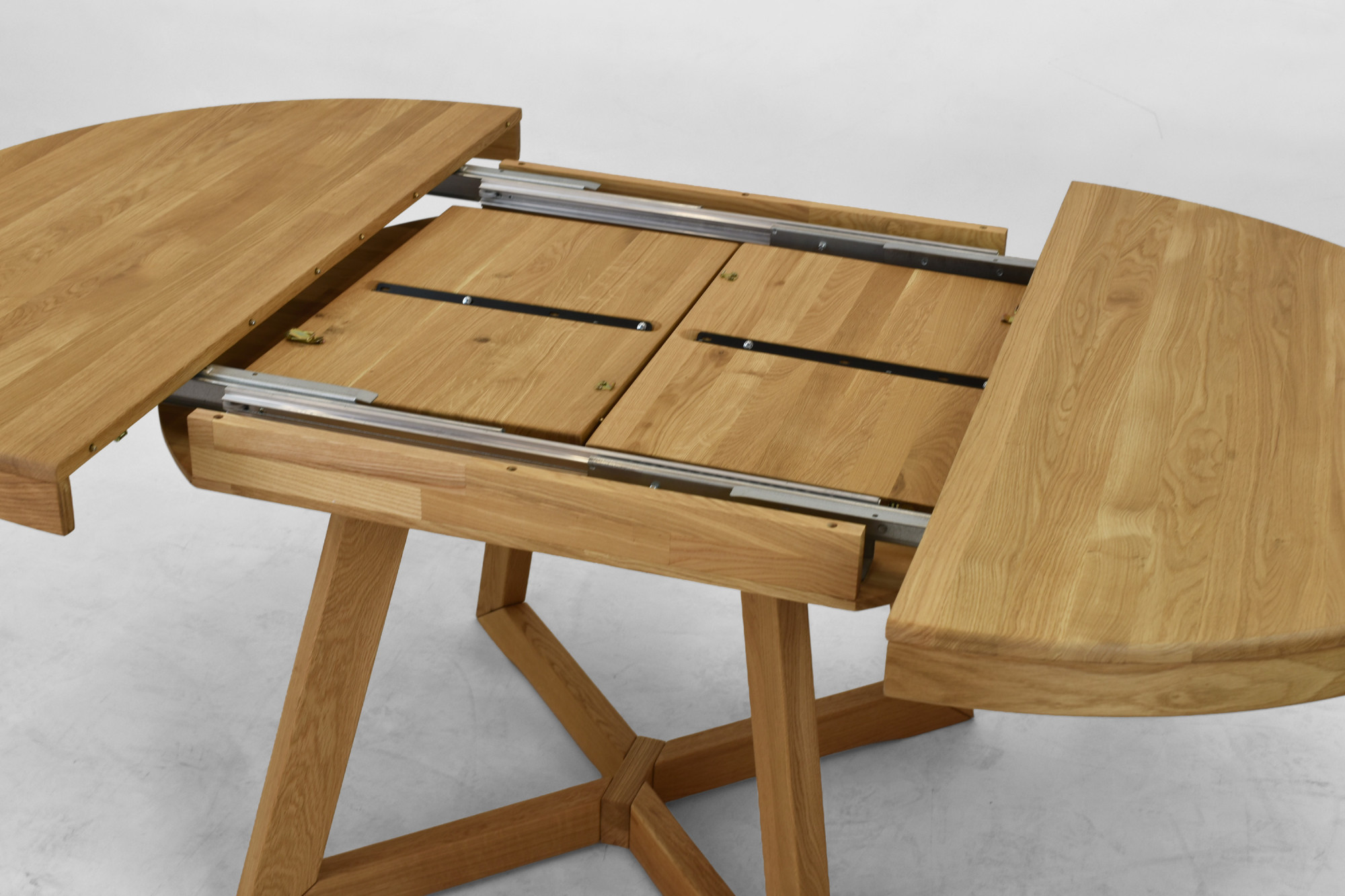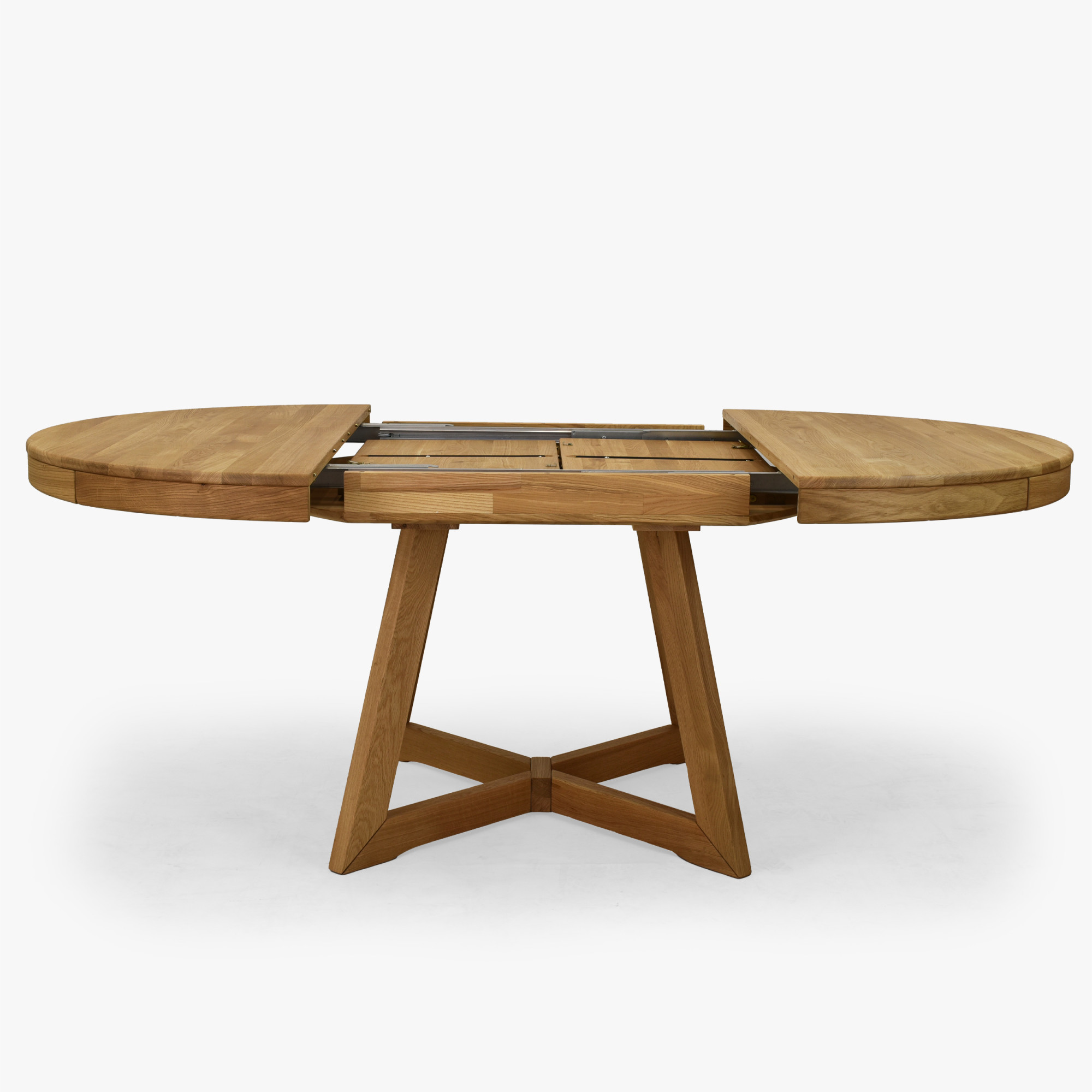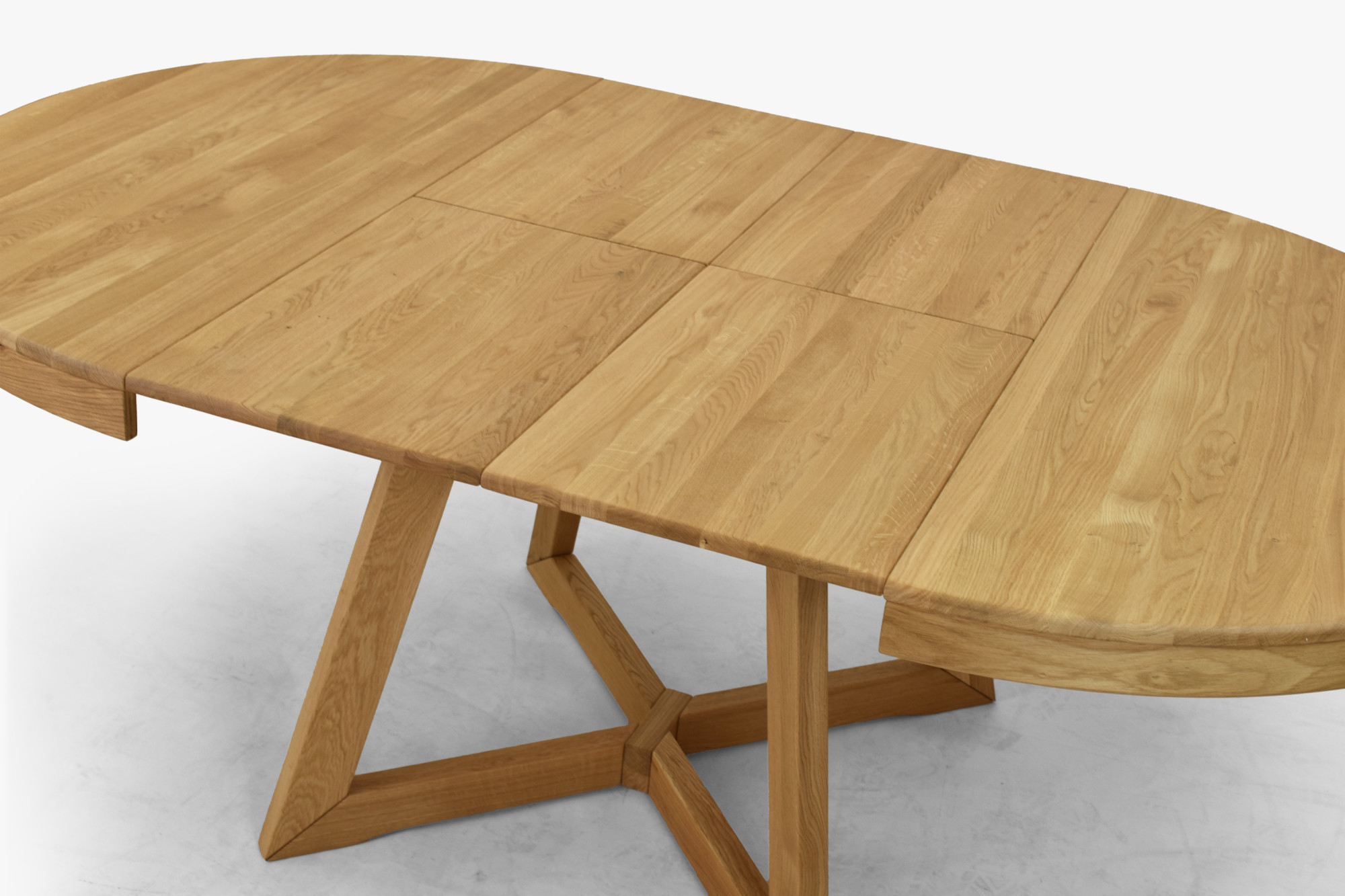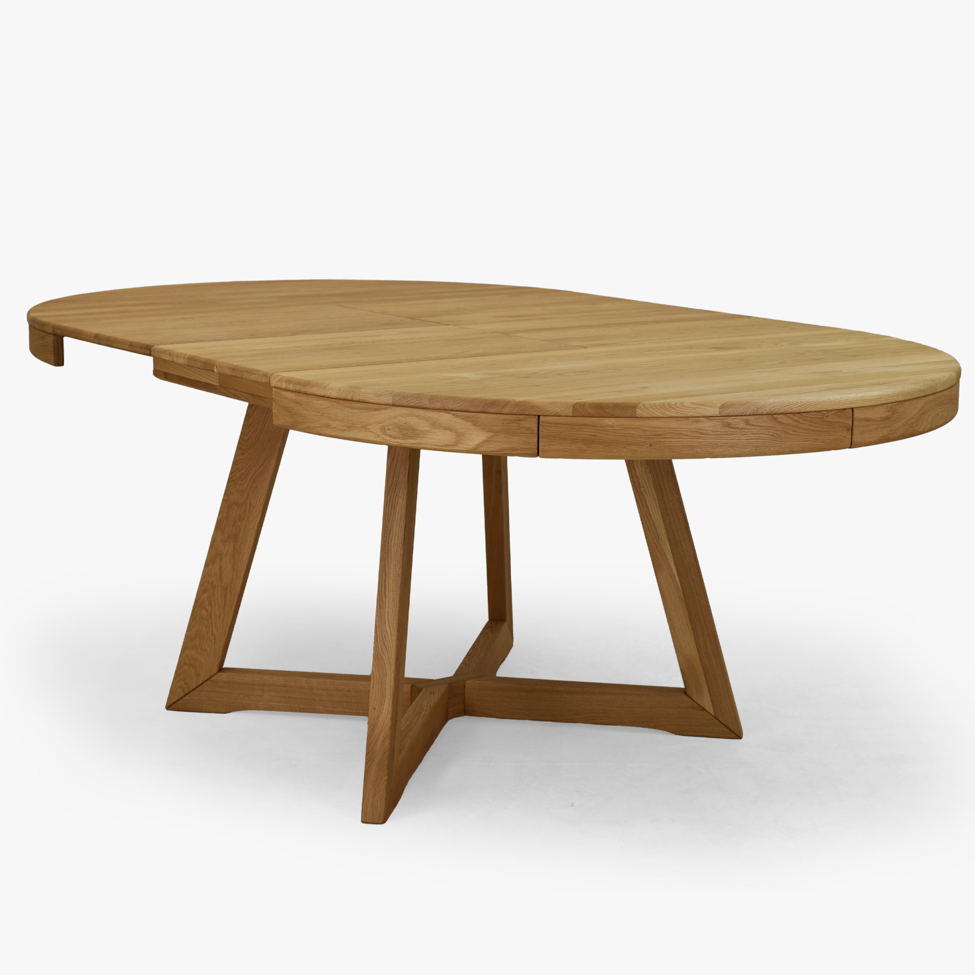 Im Standardausführung hat der Tisch einen Durchmesser von 120 cm, was ihn für bequemes Alltagsessen geeignet macht. Bei Bedarf lässt er sich auf bis zu 200 cm erweitern, und zwar mithilfe von ein oder zwei Einlegeplatten. Der Ausziehteil wird praktisch in der Tischmitte verstaut, was Komfort bei der Nutzung und Platzersparnis bringt. Der Tisch ist aus Eichenholz gefertigt und mit einer geölten Oberflächenbehandlung versehen, die die natürliche Holzmaserung hervorhebt, die Oberfläche schützt und ihr ein natürliches Aussehen bewahrt.