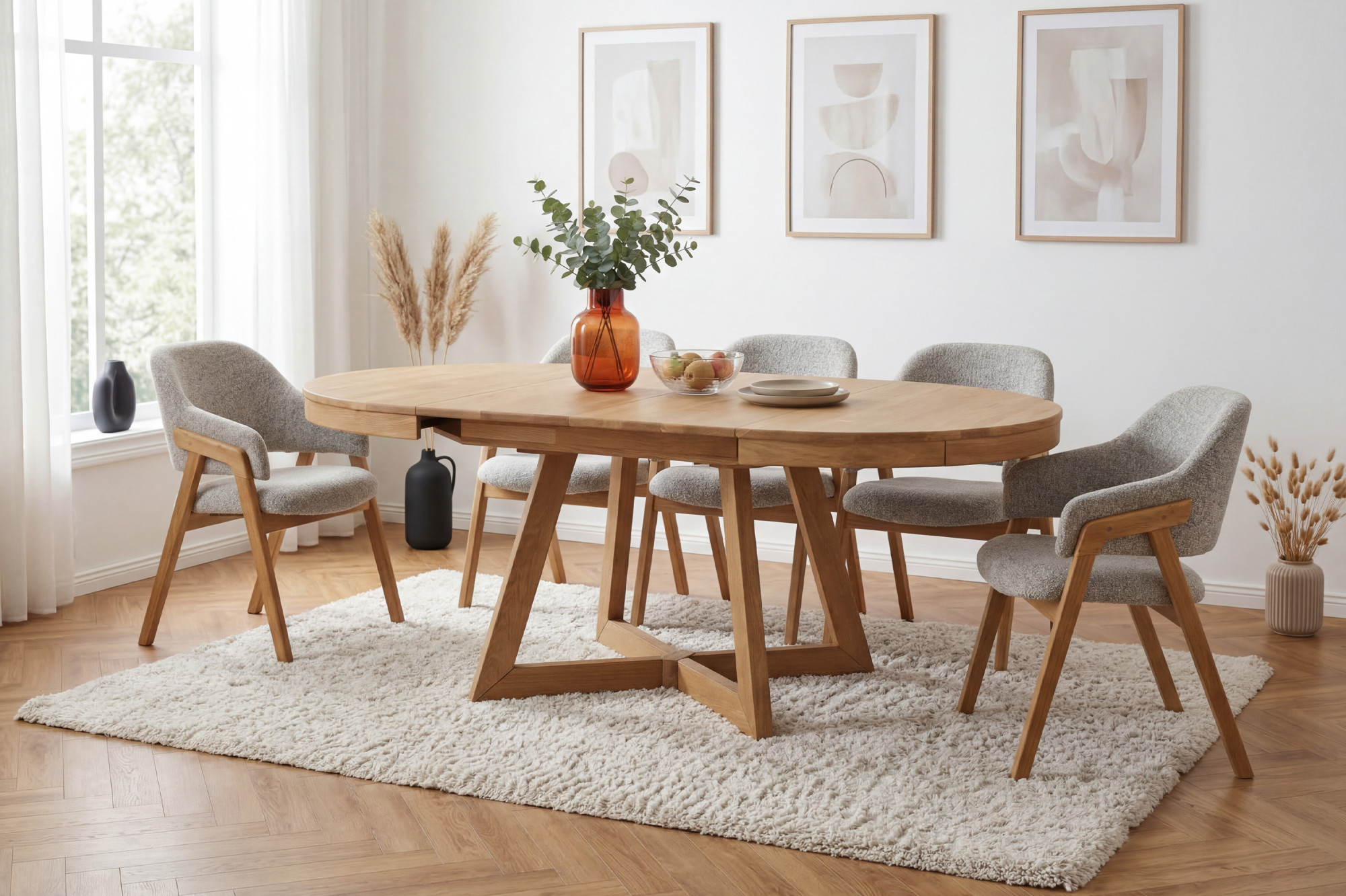Der ausziehbare Eichentisch Valencia ist eine ausgezeichnete Wahl für Haushalte, die eine kompakte Größe für den Alltag mit der Möglichkeit einer schnellen Vergrößerung der Tischfläche bei Besuch von Familie oder Freunden verbinden möchten. Die runde Form fördert eine angenehme Atmosphäre beim Essen und erleichtert die Kommunikation aller Sitzenden. Nach dem Ausziehen entsteht genügend Platz auch für festliche Mittagessen, Familienfeiern oder gemeinsame Treffen.