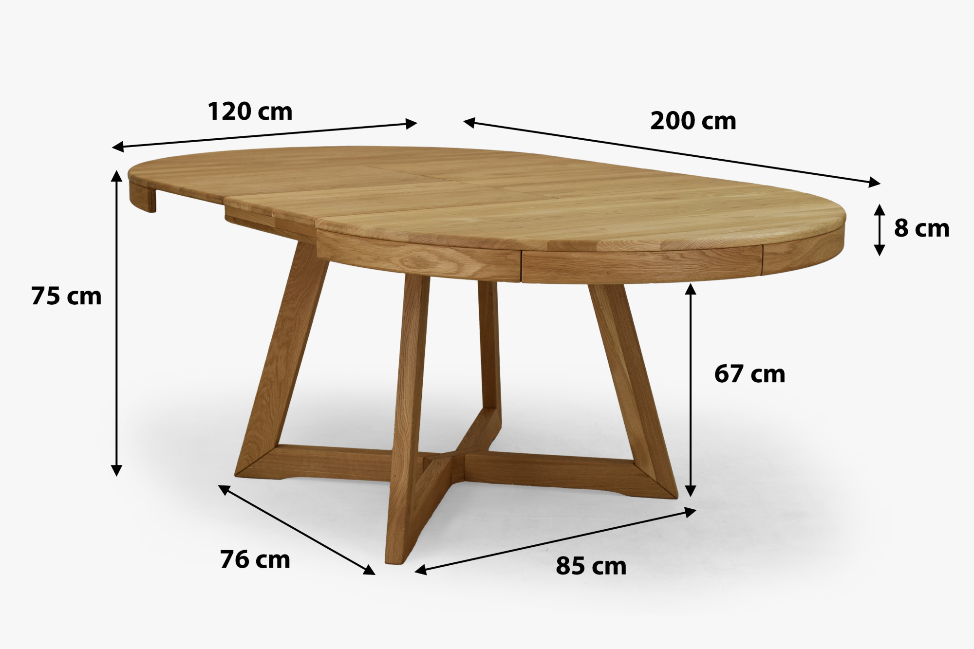 Im Grundzustand hat der Tisch einen Durchmesser von 120 cm, nach dem Ausziehen erreicht er eine Länge von bis zu 200 cm. Die Tischhöhe beträgt 75 cm.