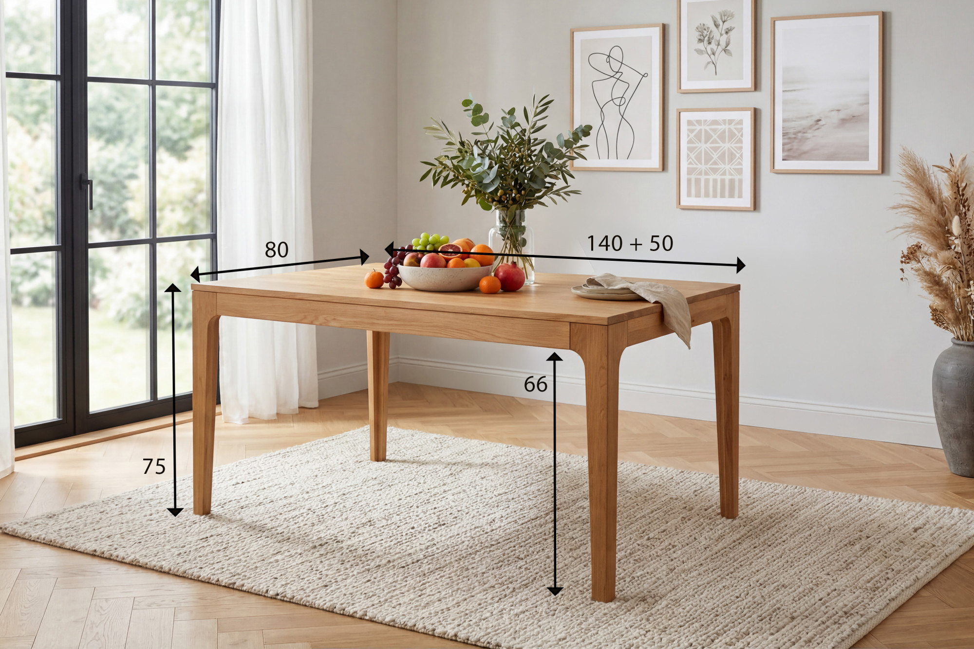 Im Grundmaß 140 × 90 cm bietet er bequem Platz für 4–6 Personen, ausgezogen auf 190 × 90 cm finden bis zu 8 Personen am Tisch Platz.