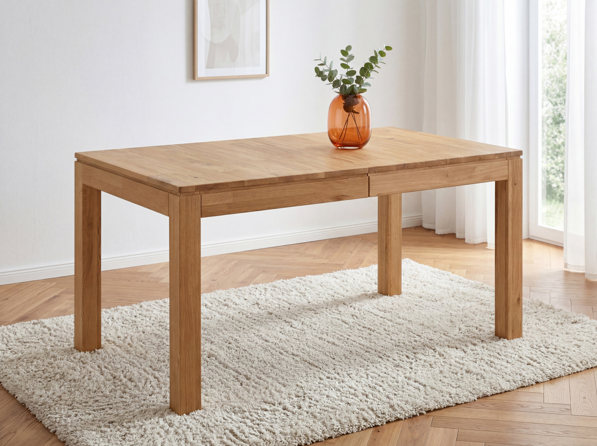Der Esstisch Matuš aus massivem Eichenholz ist die ideale Wahl für alle, die einen praktischen und eleganten Tisch mit Ausziehfunktion suchen. In der Grundgröße 140 x 90 cm eignet er sich bequem für den täglichen Gebrauch, und wenn Gäste kommen, können Sie ihn einfach ausziehen – durch Hinzufügen einer Ausziehplatte auf 180 x 90 cm oder beider Platten auf großzügige 220 x 90 cm. Beide Ausziehplatten mit 40 cm Breite sind clever direkt im Tisch verstaut, sodass Sie sie immer griffbereit haben und nicht separat lagern müssen. Der Tisch ist in vollmassiver Ausführung gefertigt, was eine hohe Widerstandsfähigkeit und lange Lebensdauer über Generationen garantiert.