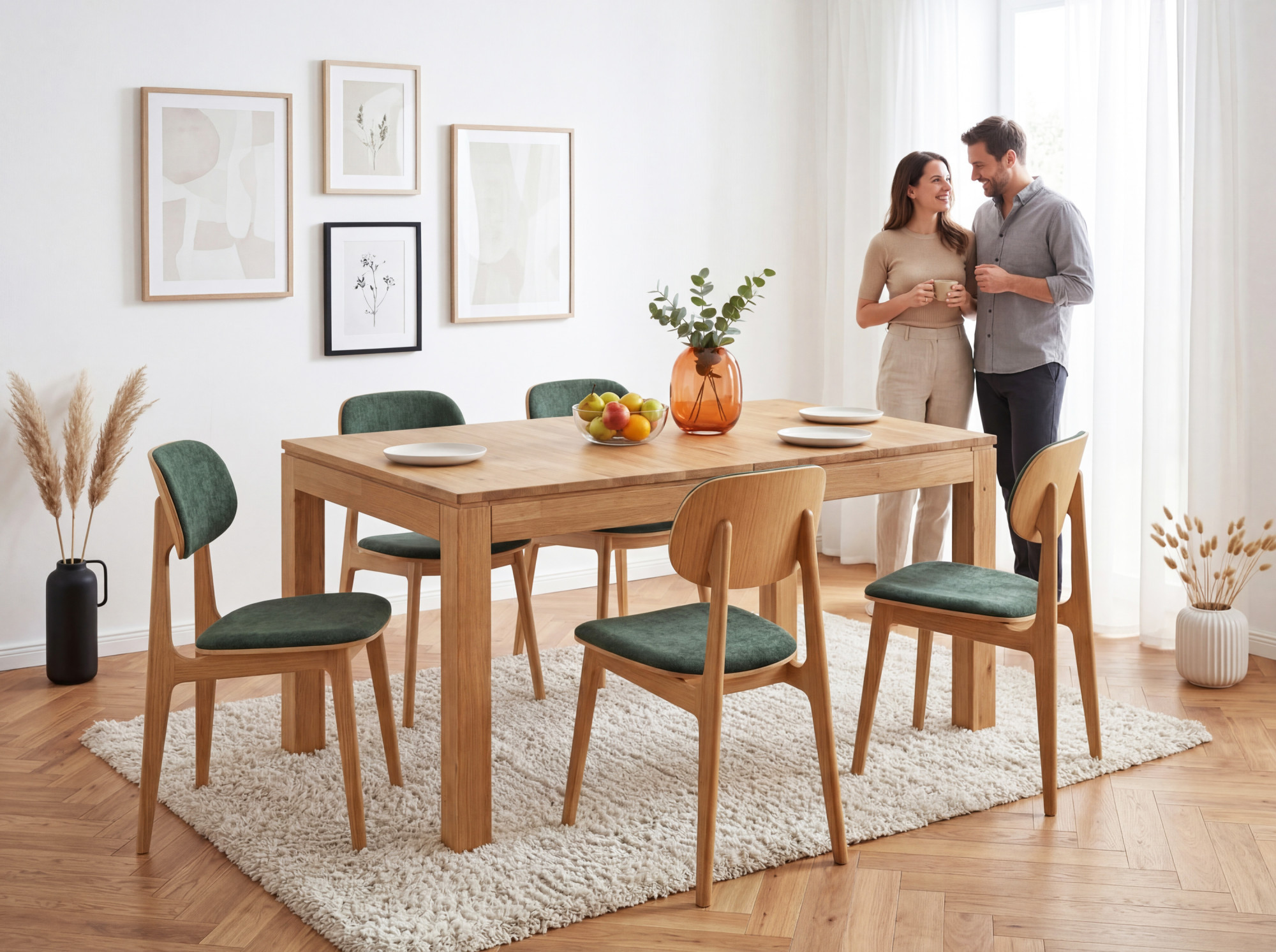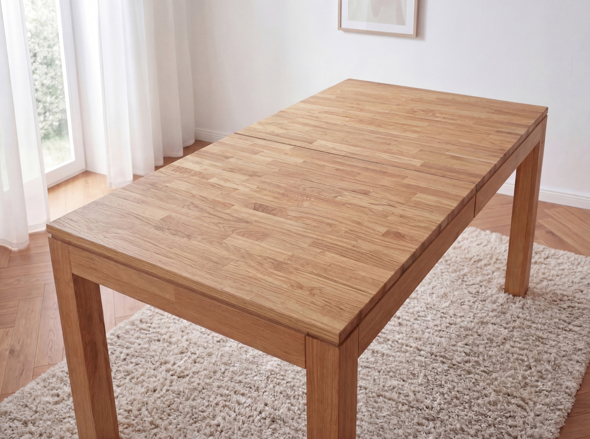 Der Ausziehmechanismus des Tisches Matuš ist durchdacht und einfach zu bedienen – die Tischbeine werden sanft auseinandergezogen, die Tischplatte öffnet sich mittig und die Ausziehteile klappen Sie einfach von innen auf Höhe der Platte heraus. Der gesamte Vorgang gelingt auch einer Person in wenigen Sekunden. Die obere Platte ist aus Eichenholz mit einem Parkettmuster im Finger-Joint-Stil gefertigt, das die natürliche Maserung des Materials schön betont. Beine und Rahmen des Tisches bestehen ebenfalls aus massivem Eichenholz, was maximale Stabilität in jeder ausgezogenen Variante gewährleistet. Die Oberfläche ist mit natürlichem Öl behandelt, das das Holz schützt und ihm ein angenehmes, mattes Aussehen mit natürlichem Gefühl verleiht.
