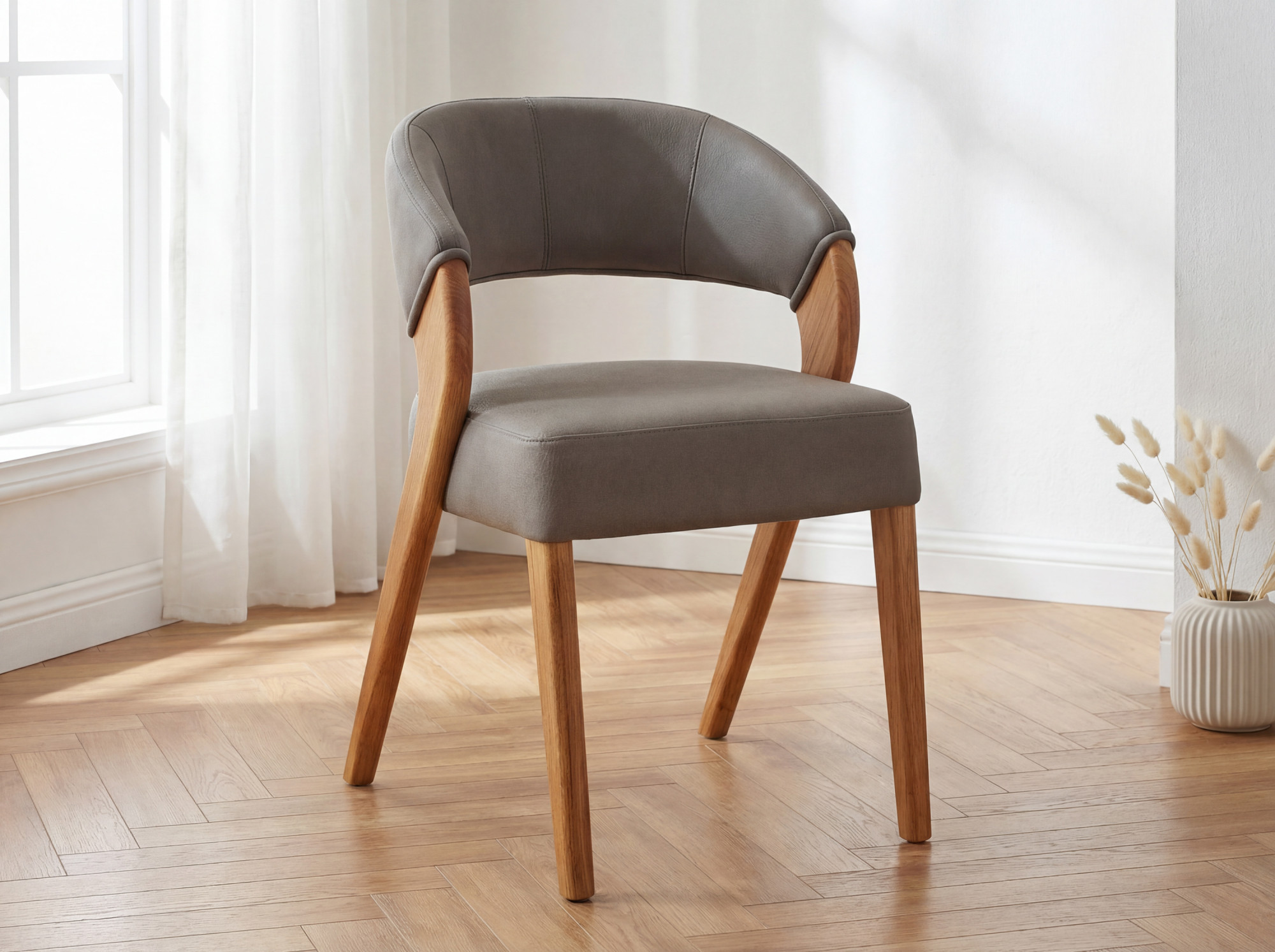 Dieser designt Esszimmerstuhl verbindet moderne Formen mit handwerklicher Qualität massiver Eiche. Die geschwungenen Linien der Rückenlehne und des Sitzes, bezogen mit dem strapazierfähigen Stoff Texas in der Farbe Taupe, verleihen dem Stuhl ein elegantes und zugleich gemütliches Aussehen. Massive Eichenbeine, behandelt mit Naturöl, bilden einen schönen Kontrast zur weichen Polsterung und schaffen ein harmonisches Gesamtbild, das sowohl in moderne als auch klassische Esszimmer passt. Dank der ergonomisch geformten Rückenlehne bietet der Stuhl hervorragenden Komfort bei langem Sitzen am Tisch.