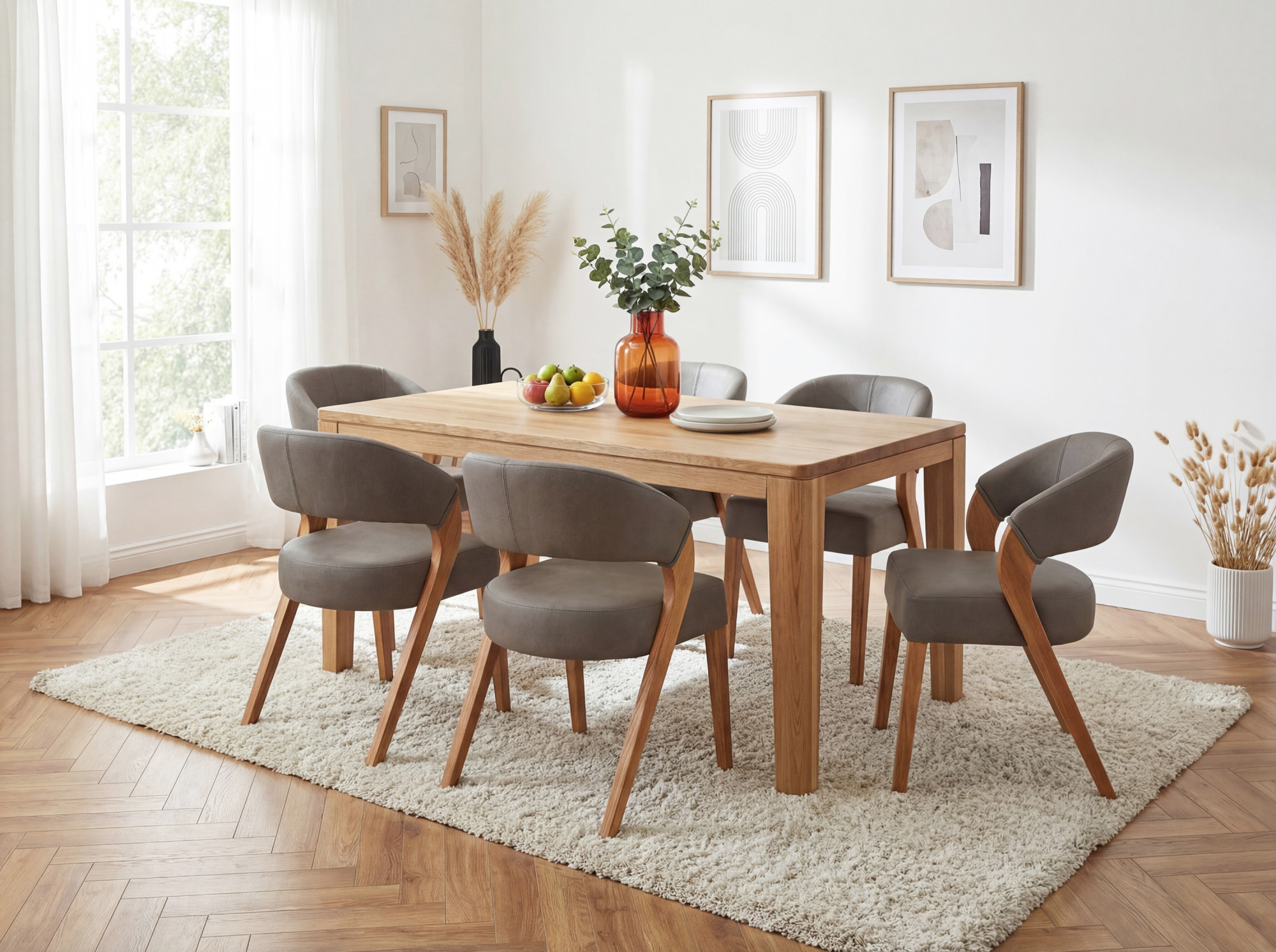 Der Stoff Texas besteht aus 100% Polyester mit einem Flächengewicht von 480 g/m² und erreicht 60.000–70.000 Zyklen im Martindale-Test, was außerordentliche Abriebfestigkeit auch bei täglichem Gebrauch garantiert. Der Pilling-Widerstand liegt bei Stufe 4 und die Trockenreibefestigkeit wurde mit Stufe 5 bewertet. Die tragende Konstruktion aus FSC-zertifiziertem Eichenholz gewährleistet Stabilität und lange Lebensdauer. Der Stuhl wird komplett montiert geliefert, sodass Sie ihn direkt nach der Lieferung verwenden können.