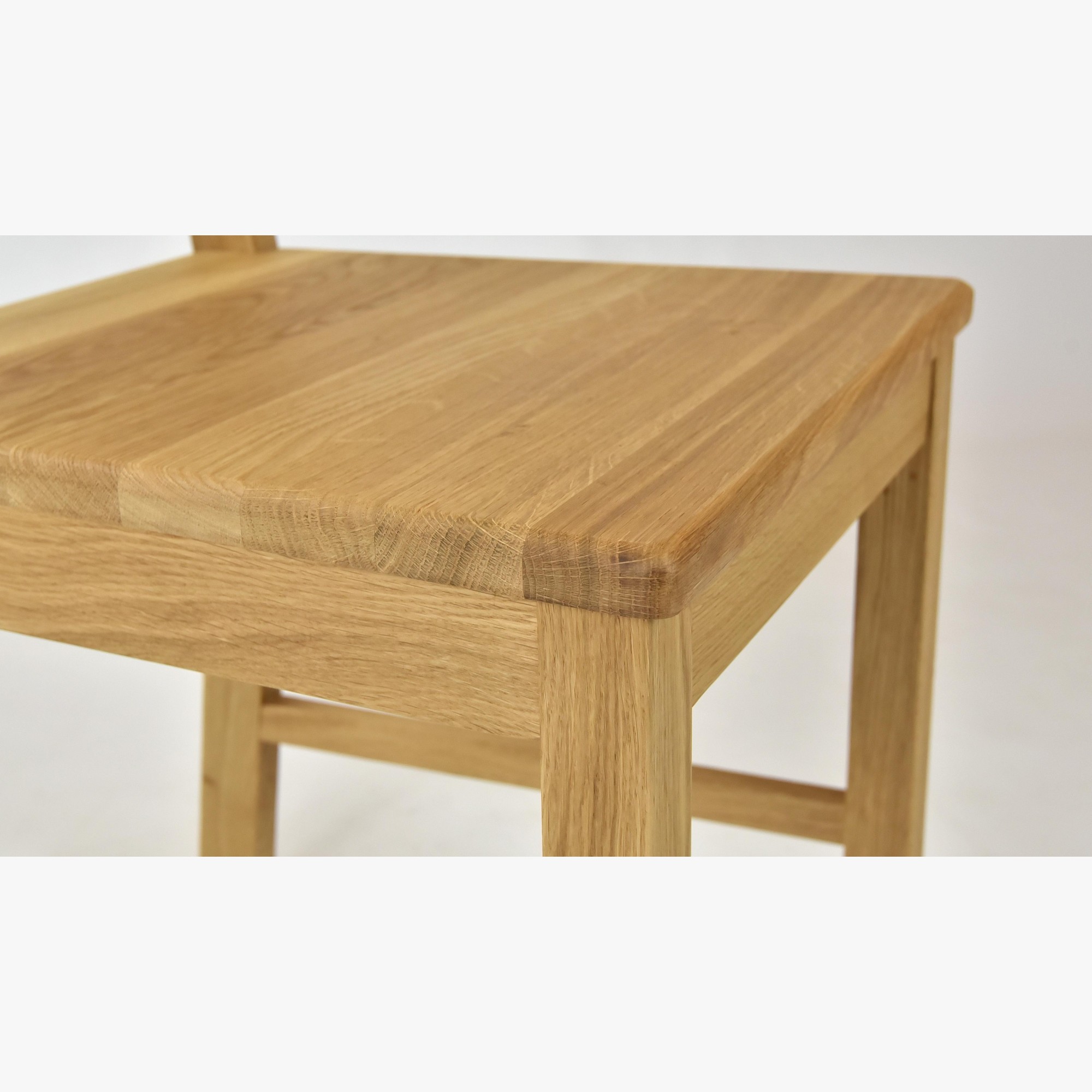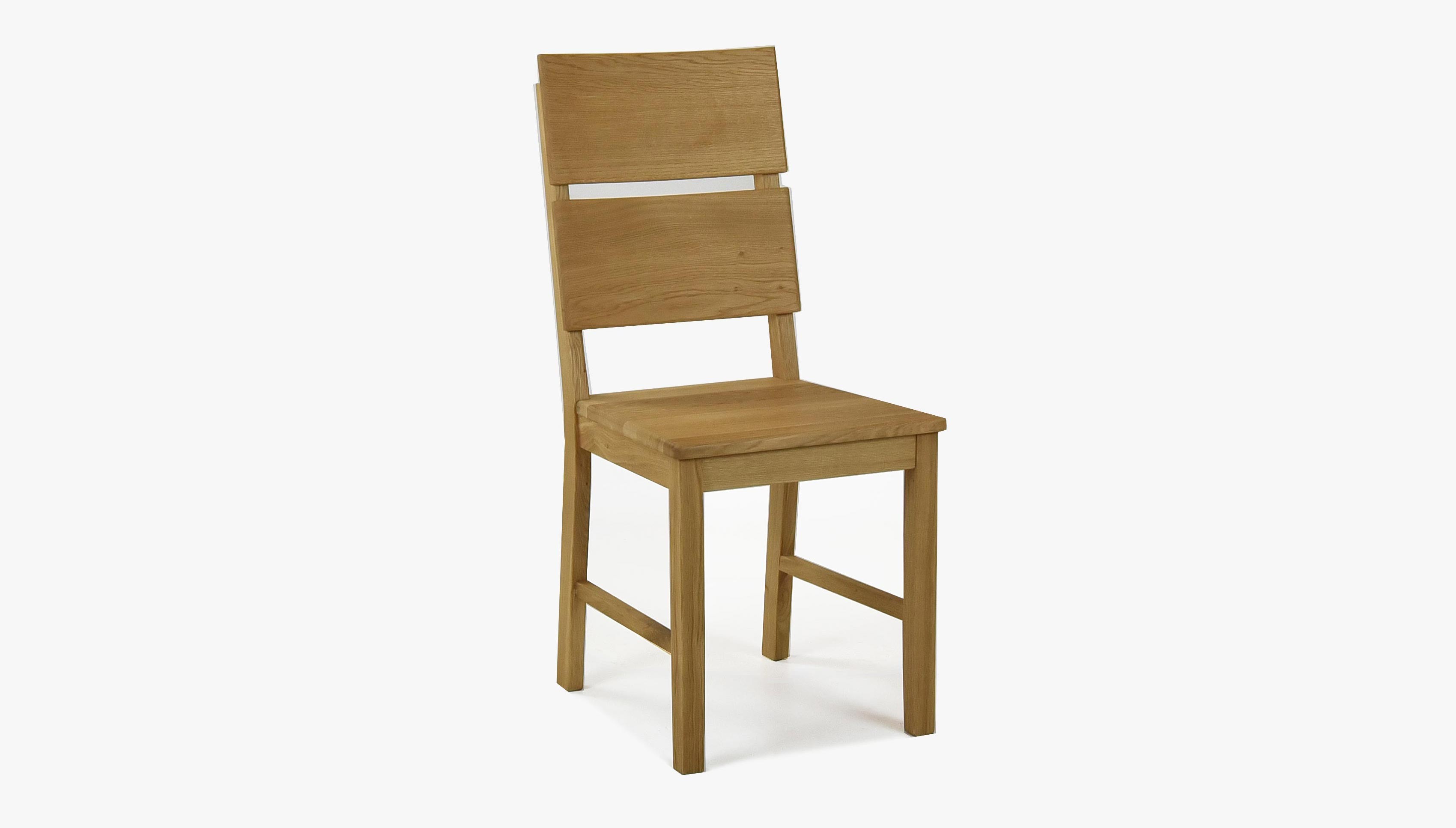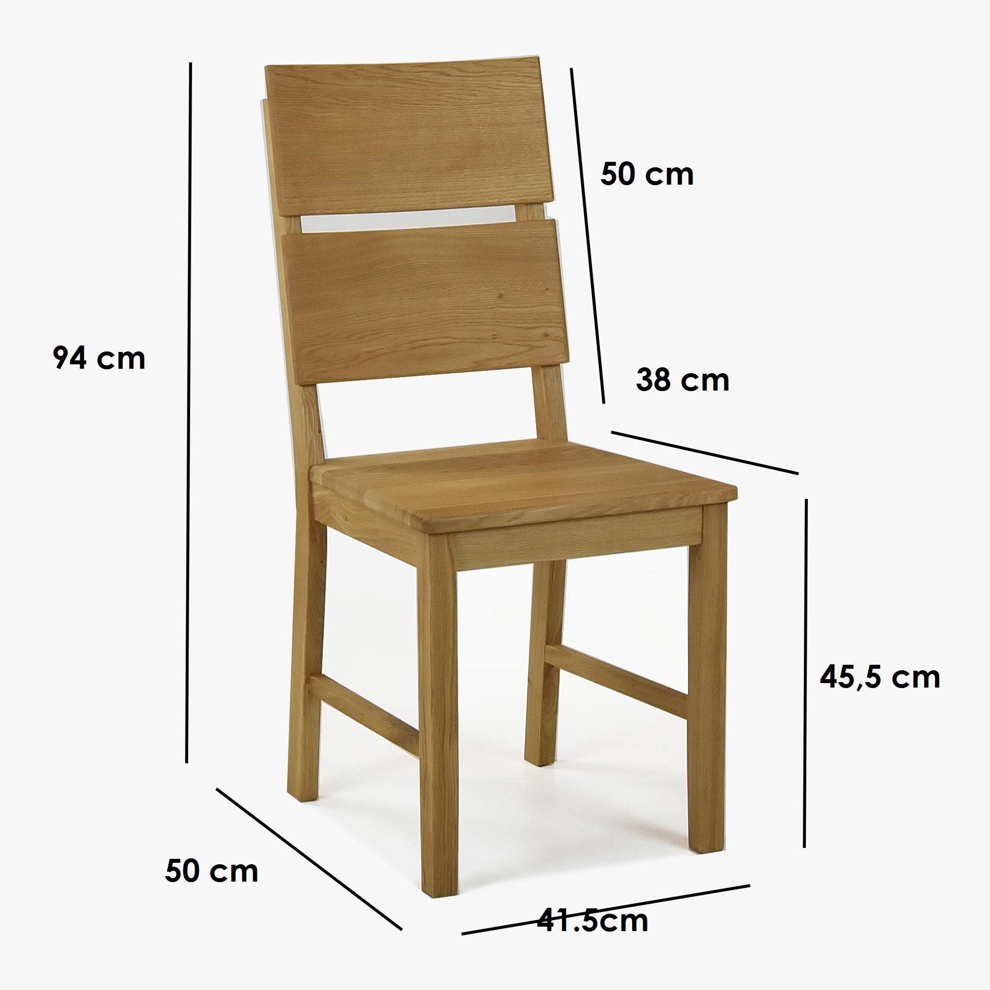 Die massive Eichenkonstruktion des Esszimmerstuhls sorgt für hohe Stabilität, die empfohlene Belastung beträgt bis zu 120 kg. Der Esszimmerstuhl ist komplett aus Holz; Sitzkissen zur Aufwertung können Sie in Fachgeschäften erwerben. Der Stuhl ist mit natürlichem Öl behandelt, daher lässt er sich mit jedem Esstisch aus unserem Angebot kombinieren.