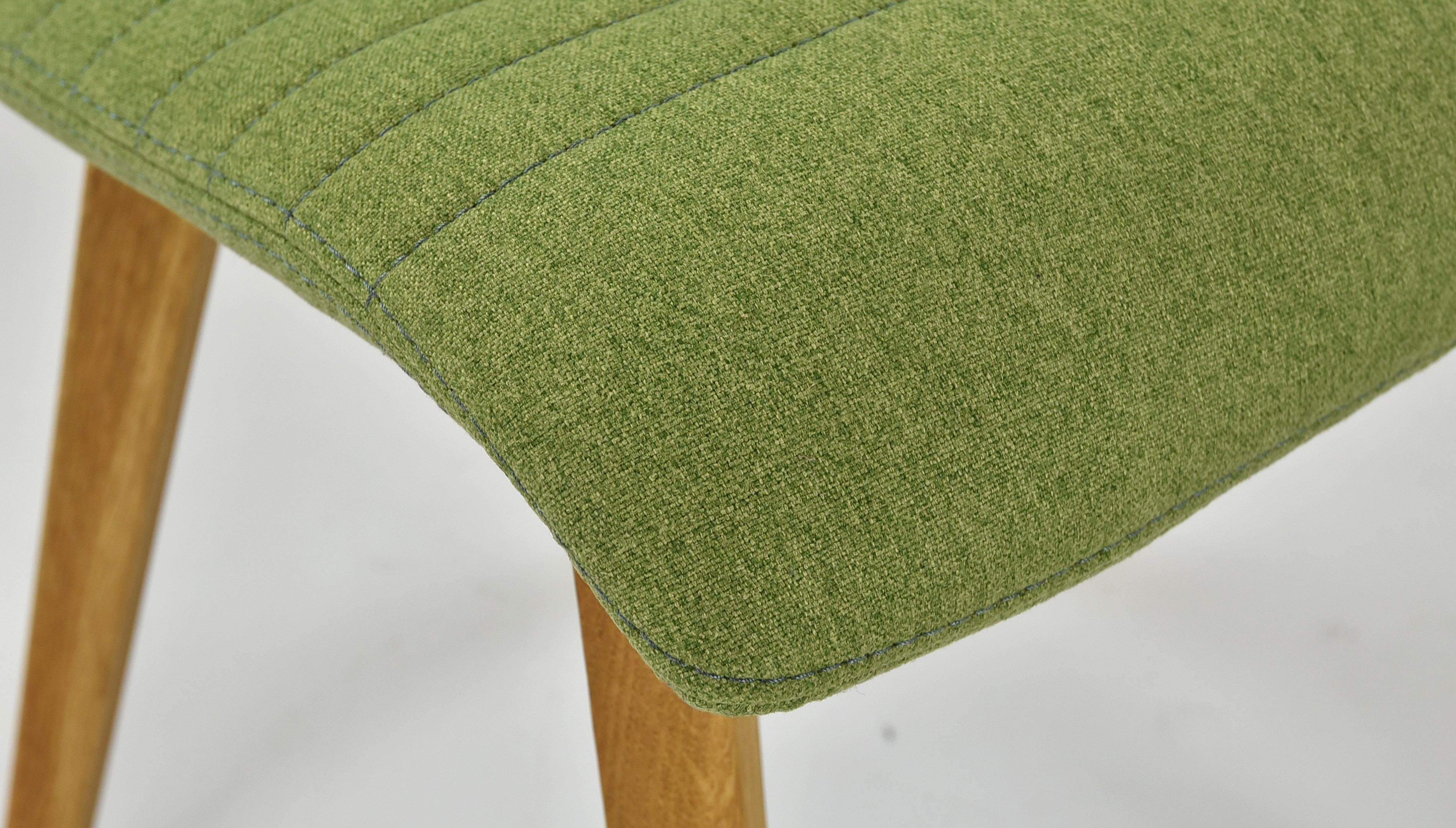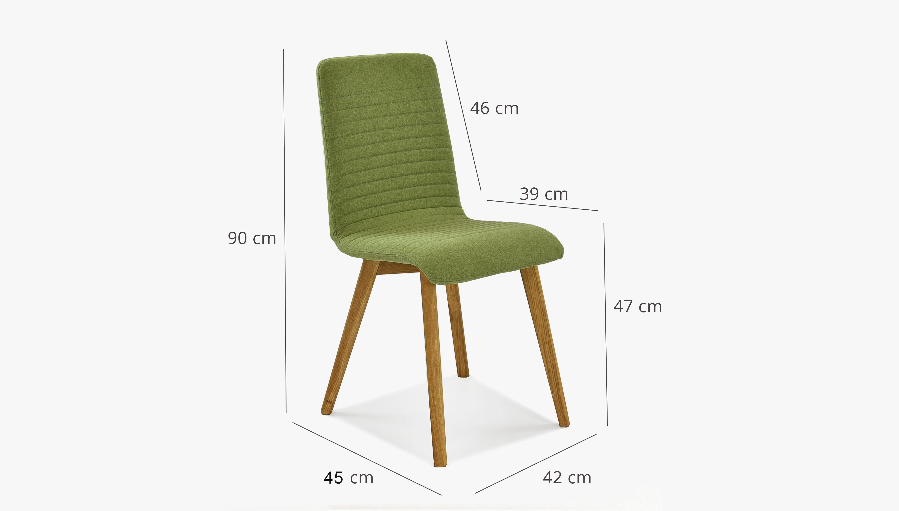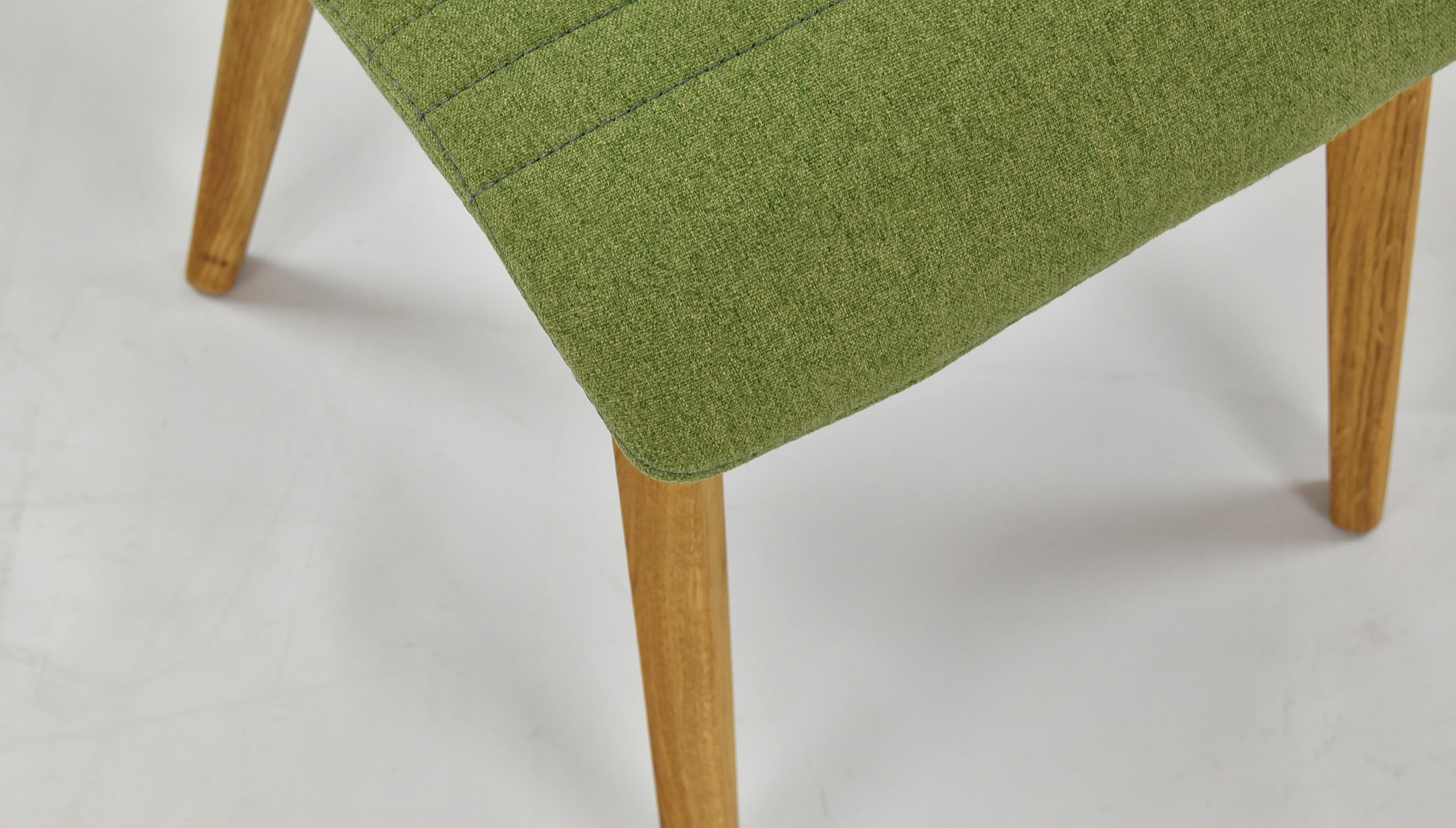 Esszimmerstuhl im modernen Design hergestellt aus hochwertigem Stoff in grüner Farbe. Der Esszimmerstuhl Arosa bzw. Lara ist auch in anderen Farben erhältlich. Es handelt sich um unser populärstes Modell, bei dem sich bereits Hunderte zufriedene Kunden von dem hervorragenden Preis-/Leistungsverhältnis überzeugen konnten. Der Esszimmerstuhl wird bereits montiert geliefert, sein geringes Gewicht von nur 7,5 kg ermöglicht Ihnen eine einfache Handhabung. Der Stoff des Stuhls ist in Grün sehr angenehmer, weicher Stoff auf der Haut. Reinigung mit Wasser oder PH0-Seife. Die Stuhlbeine sind aus Eichenholz gefertigt, ausschließlich aus nachhaltigen Wäldern mit FSC-Zertifikat. Das Holz wurde mit dem Marken-dänischen Öl WOCA behandelt, das ökologisch und umweltfreundlich ist. Belastbarkeit des Stuhls bis zu 110 kg. Die Rückenlehne des Stuhls ist aus Holzschichtholz gefertigt. Zu den Eigenschaften dieses Materials gehört eine feine Elastizität. Da es sich um ein Naturmaterial handelt, kann die Steifigkeit der Rückenlehne bei jedem Stück leicht variieren.