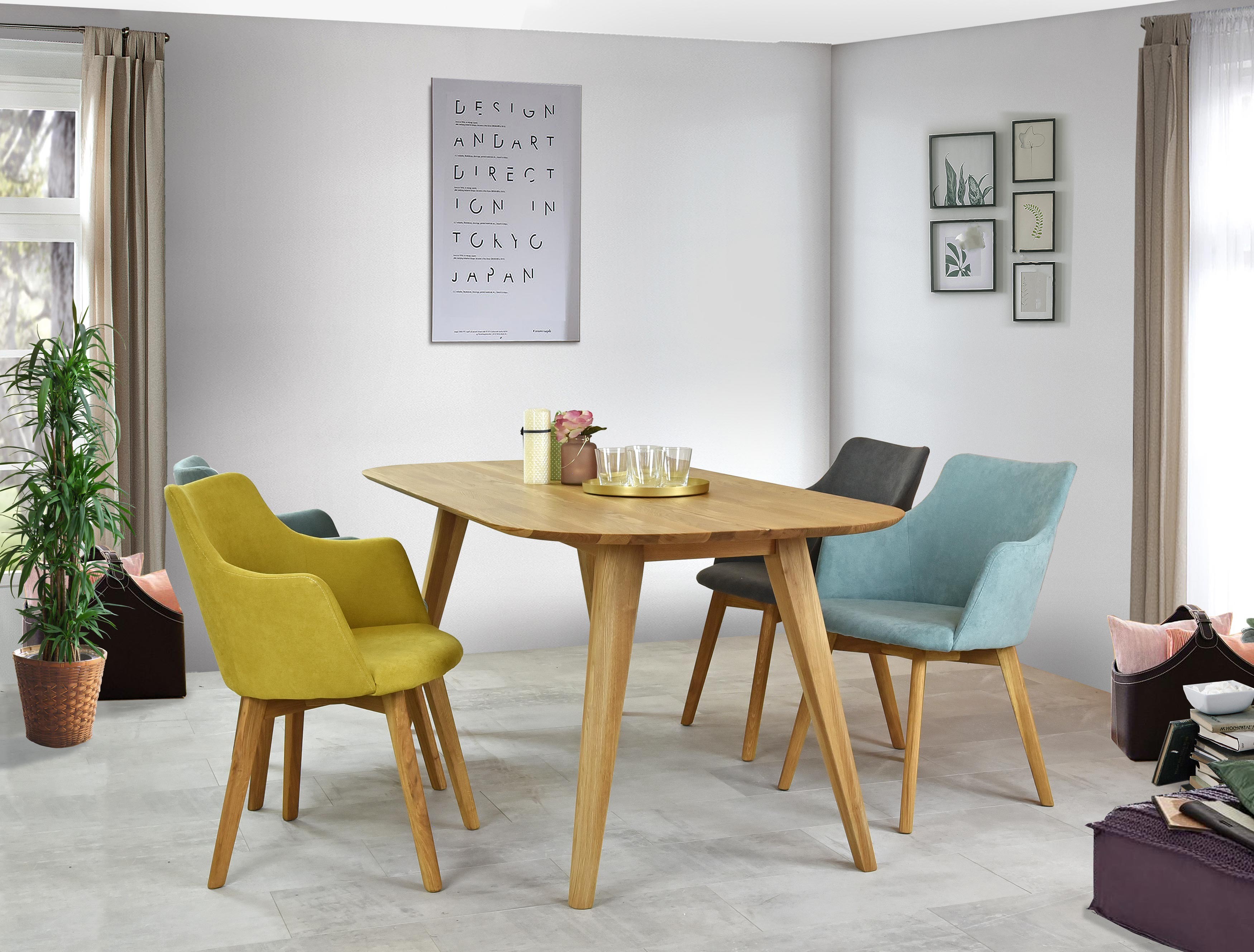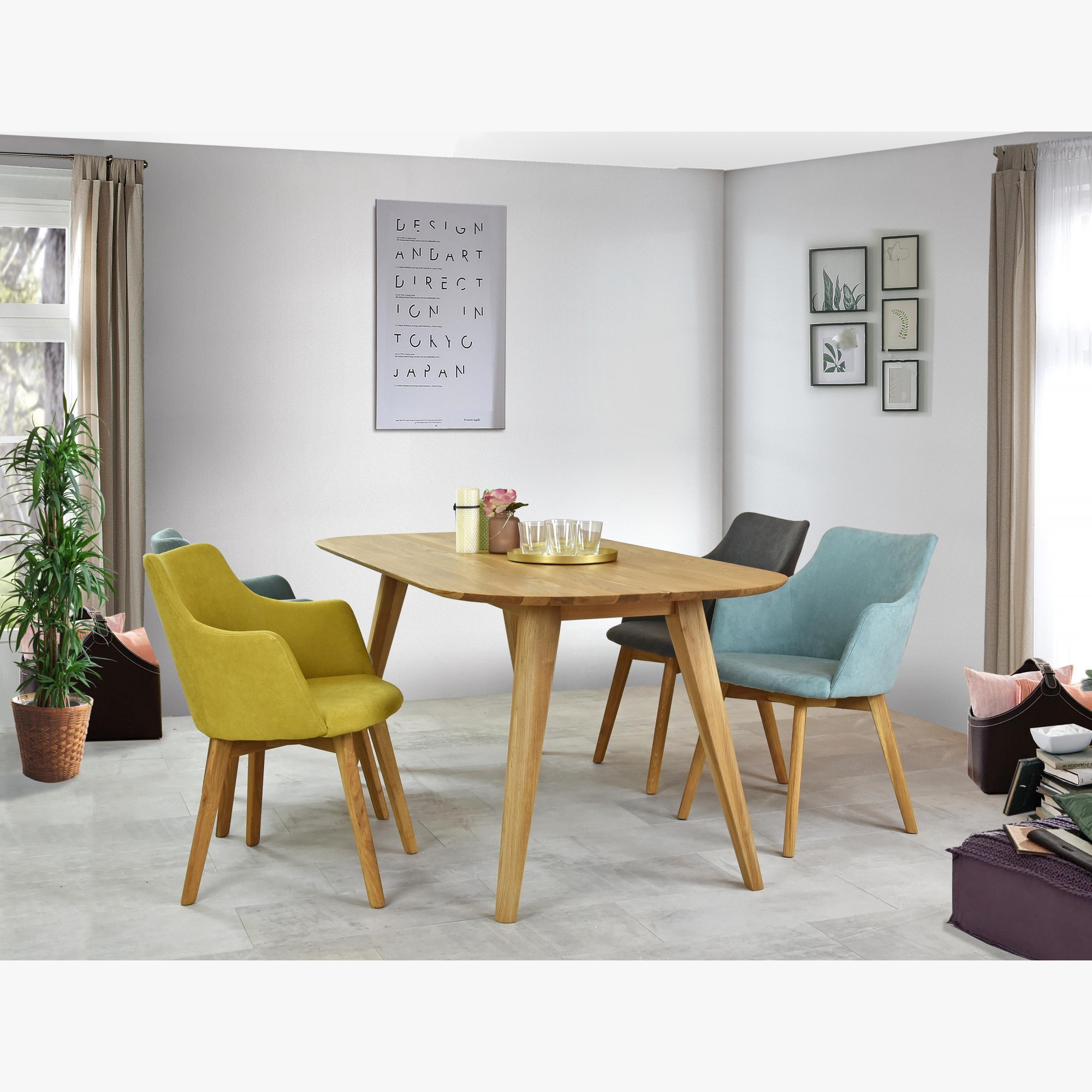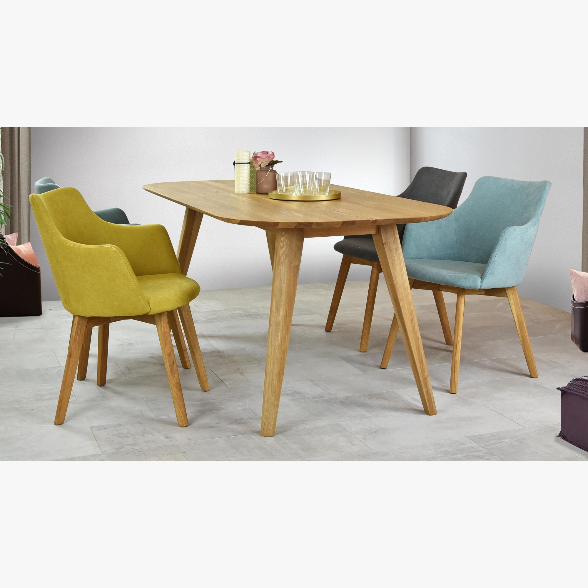 Wunderschöner Sessel mit Armlehne und sehr bequemem Sitz auf massiven Eichenholzbeinen. Das moderne und elegante Design des Sessels passt ideal in ein modernes Interieur. Der Sessel wird zerlegt geliefert und ist einfach zu montieren. Sie haben die Auswahl zwischen verschiedenen Farbtönen. Der Vorteil des Sessels ist seine Verwendung am Esstisch, aber auch als zusätzliche Sitzgelegenheit im Wohnzimmer oder Arbeitszimmer. Die feste hohe Rückenlehne ist dank ihrer Proportionen auch bei längerem abendlichem Sitzen außergewöhnlich bequem. Ein schöner Sessel, den jeder Gast zu schätzen wissen wird. Der Stoff besitzt eine außergewöhnlich hohe Beständigkeit von bis zu 100.000 Zyklen.