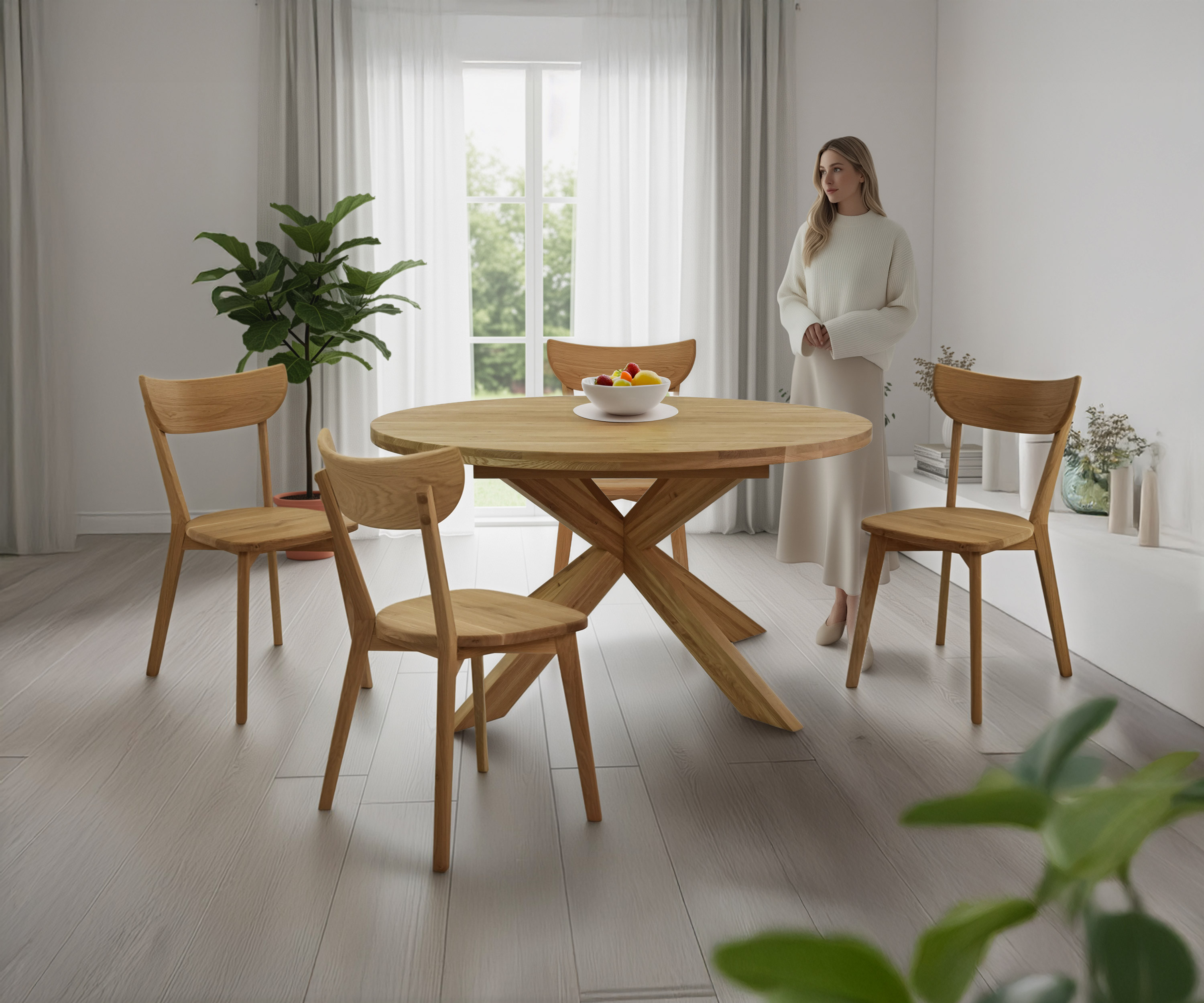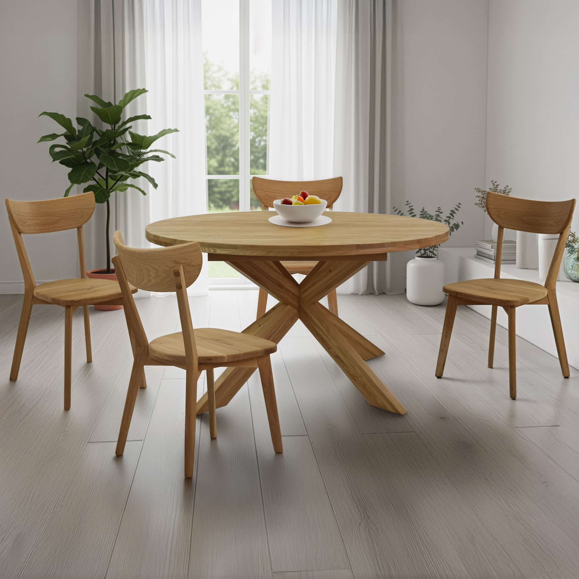 * auf dem Foto der Stuhl Eva aus massivem Eichenholz und der ausziehbare runde Tisch Holger aus massivem Eichenholz 120 cm
