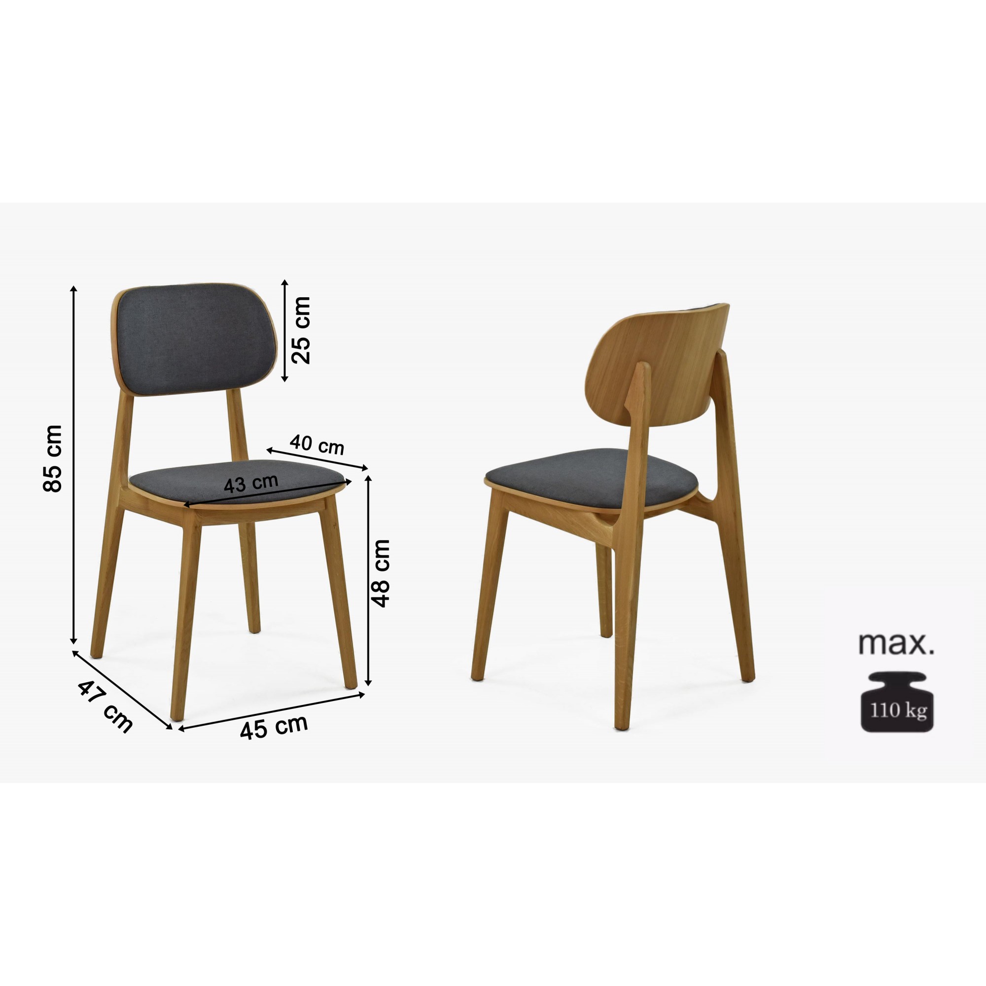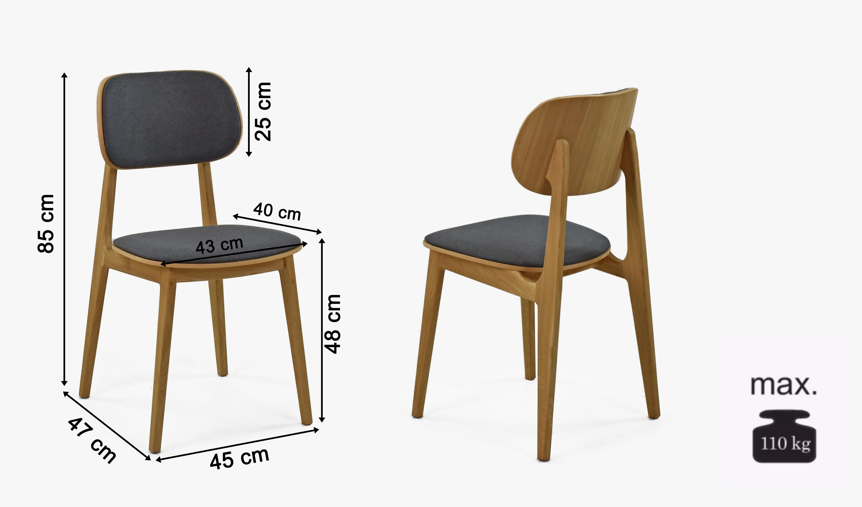 Echter Esszimmerstuhl im minimalistischen skandinavischen Design. Der Sitz ist aus Eichenholz gefertigt. Der Stuhl wird bereits montiert geliefert und die robuste Massivkonstruktion wird Ihnen über viele Jahre ohne Verlust an Schönheit und Qualität dienen. Für die Herstellung wird natürliches Eichenholz verwendet, das nur mit klarem, ökologischem italienischem Öl der Marke Bormo Wachs behandelt wurde. Die empfohlene Belastung beträgt bis zu 110 kg. Bei längerem Sitzen schätzt man den wirklich angenehmen Sitzkomfort dank der abgerundeten Formen von Rückenlehne und Sitzfläche.