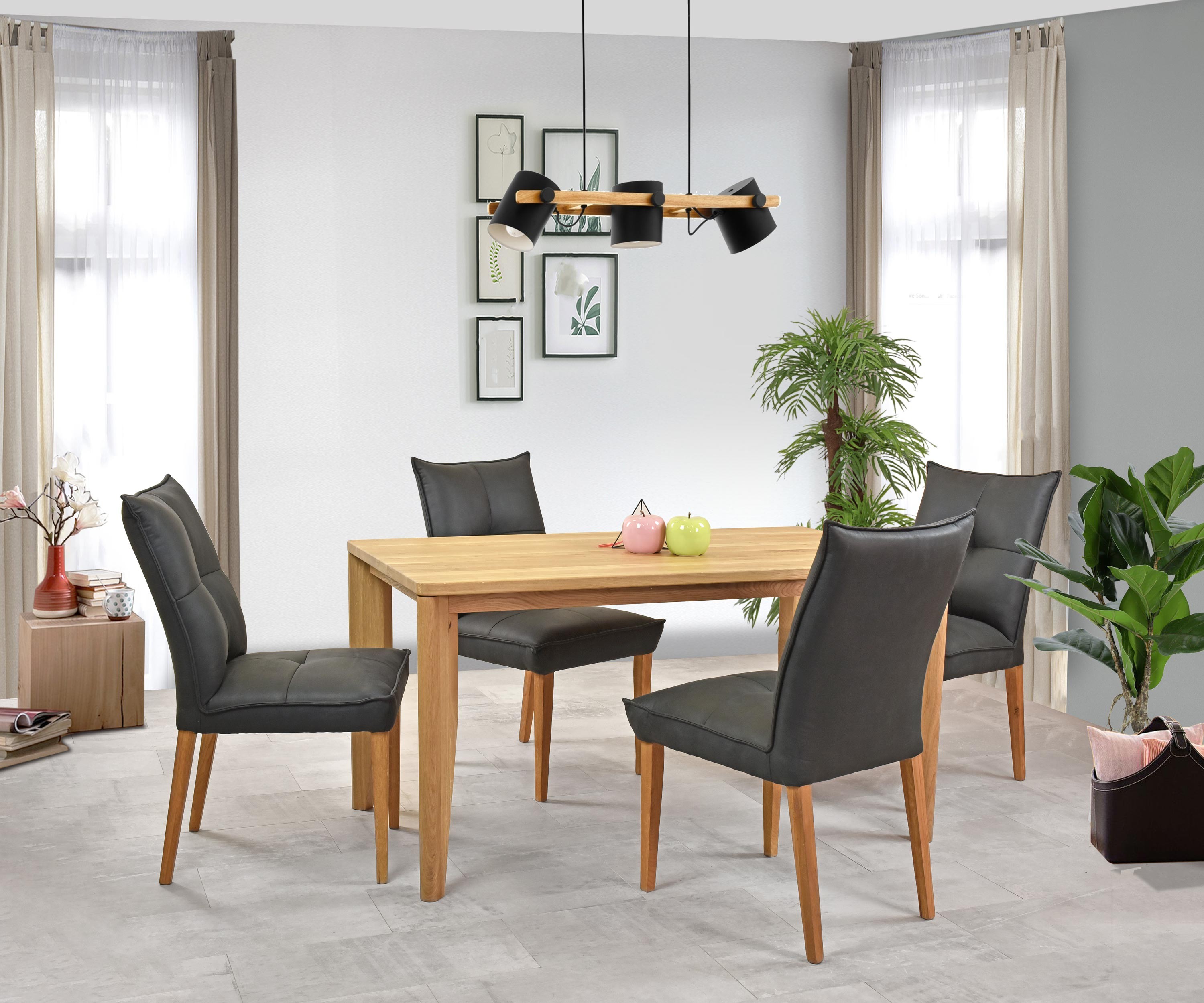 Unser komfortabler Esszimmerstuhl Riga wurde so entworfen, dass er perfekt zu jedem Einrichtungsstil passt. Seine schwarze Polsterung imitiert luxuriöses geschliffenes Leder und verleiht Ihrem Zuhause einen Hauch von Noblesse. Die Stuhlbeine aus Eiche sorgen zudem für Stabilität und Robustheit, was eine lange Lebensdauer garantiert.