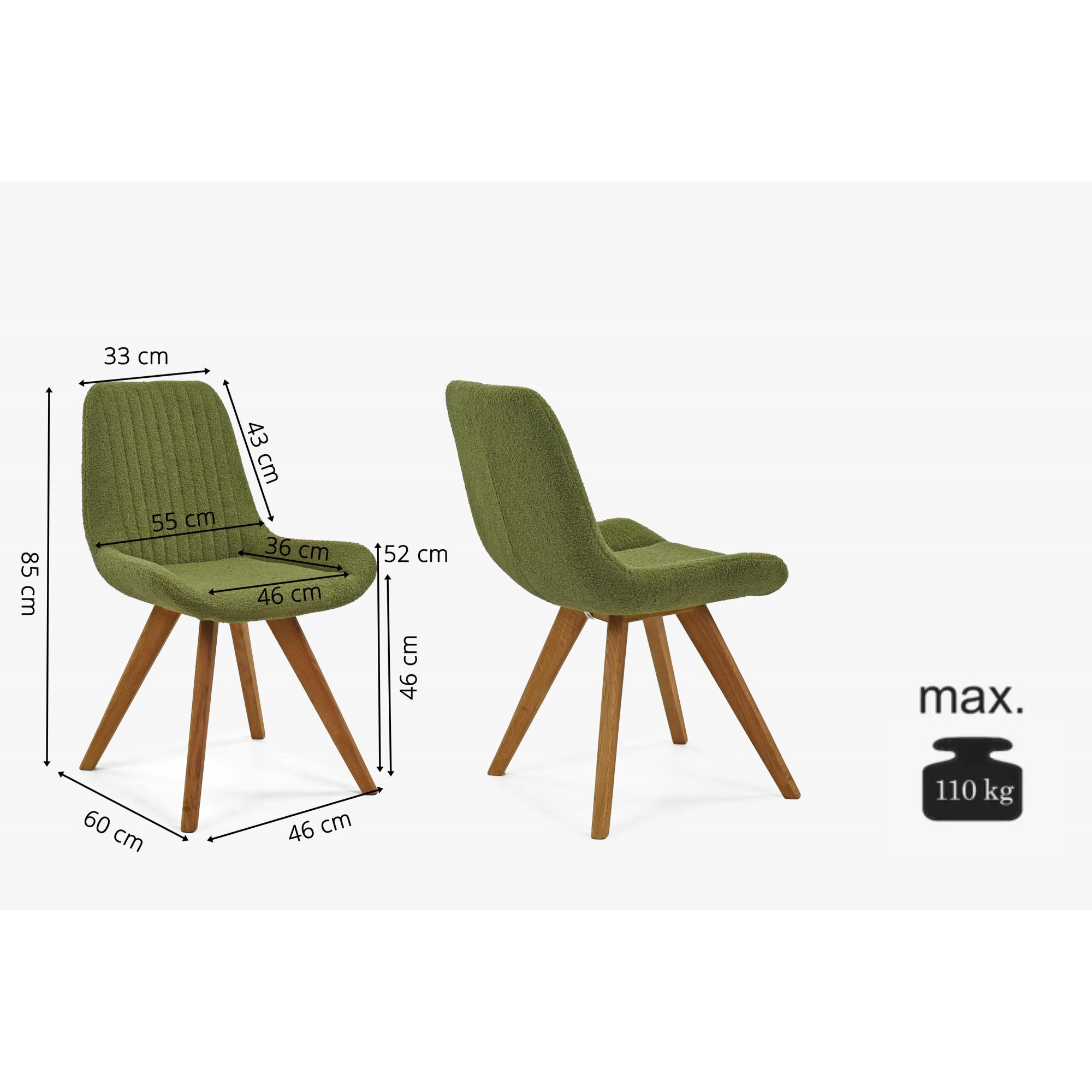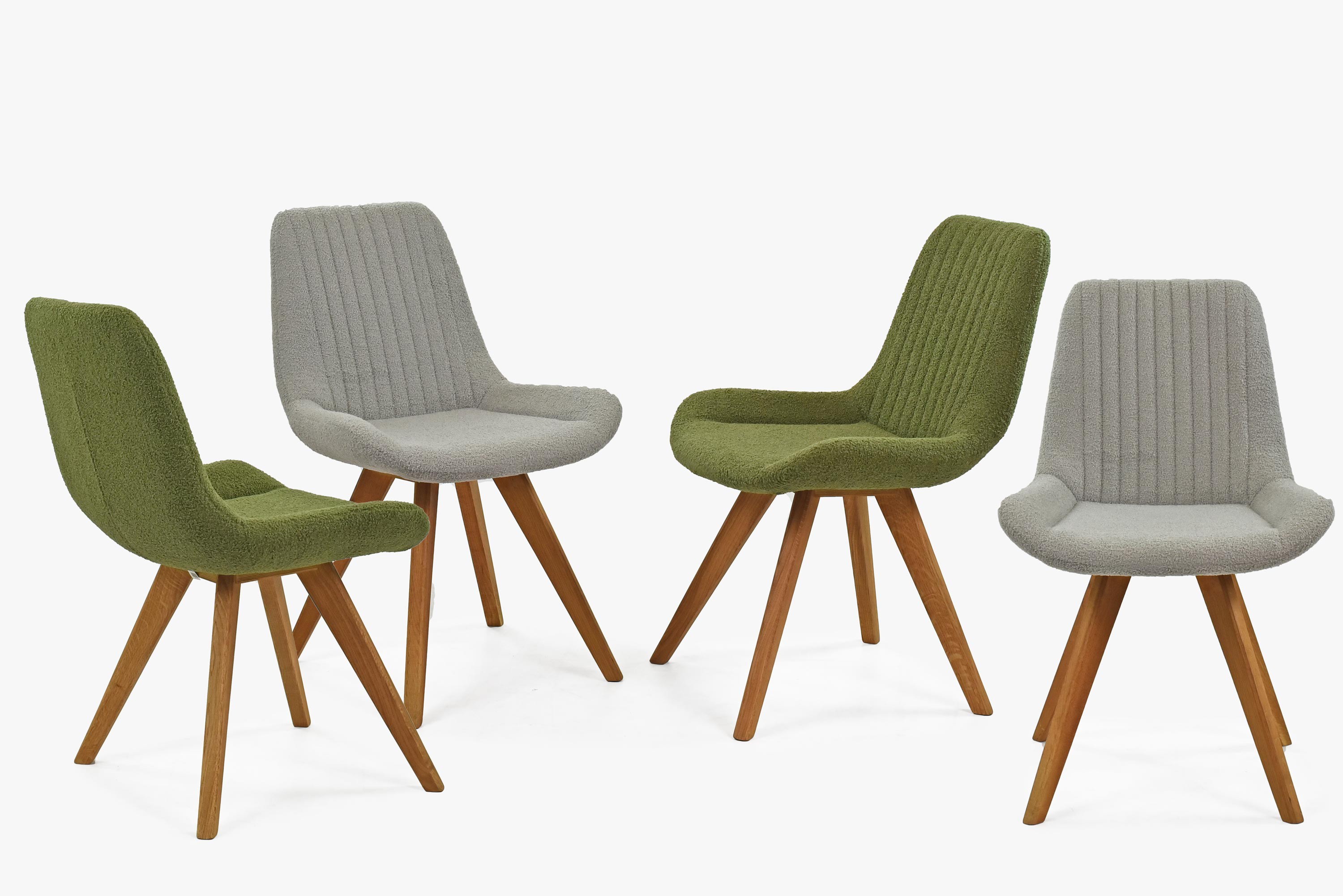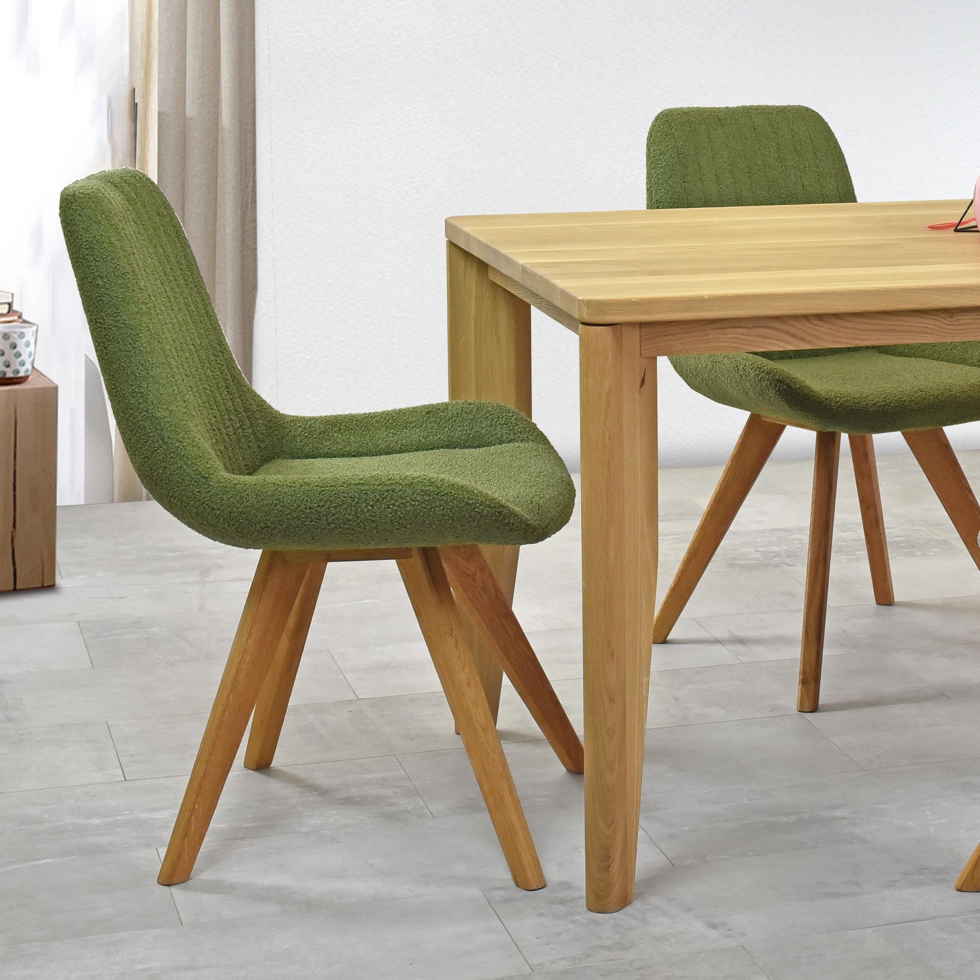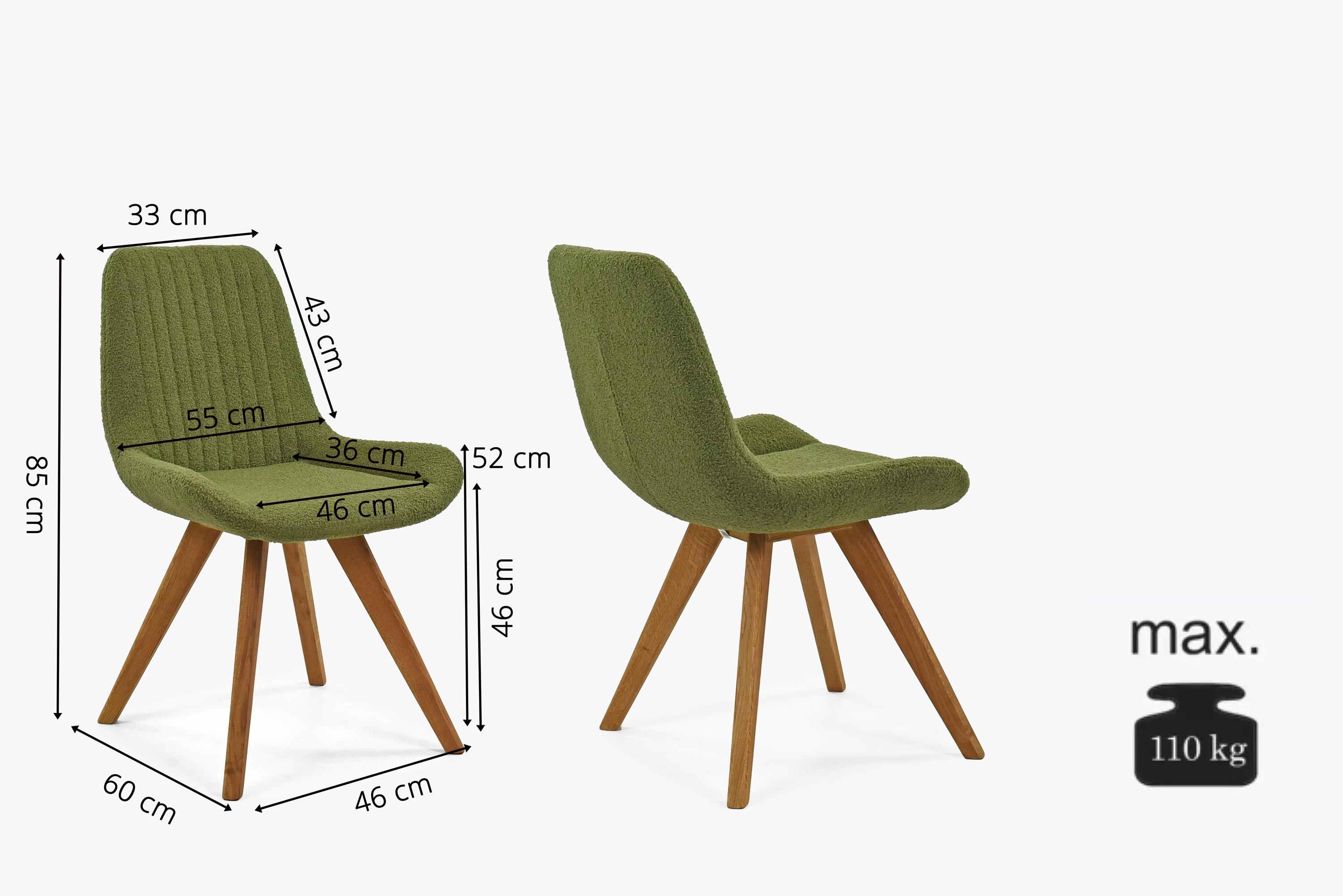 Die moderne Form des Stuhls mit Eichenbeinen in natürlicher Farbe verleiht Ihrem Esszimmer ein elegantes und zeitgemäßes Aussehen. Der Stoff des Stuhls besteht aus recycelbarem Material, das nicht nur ökologisch, sondern auch sehr widerstandsfähig und pflegeleicht ist. Sie brauchen sich keine Sorgen um die Strapazierfähigkeit des Stoffes oder Abnutzung machen. Die grüne Polsterung fühlt sich sehr angenehm an und erinnert an Samt, was maximalen Sitzkomfort garantiert. Die Eichenbeine sind geölt, um ihre lange Lebensdauer und Festigkeit zu gewährleisten. Der Stuhl trägt somit auch höhere Belastungen problemlos. Dank der hochwertigen Polsterung und der gepflegten Holzbeine reicht regelmäßiges Abwischen mit einem Tuch, damit der Stuhl wie neu aussieht.