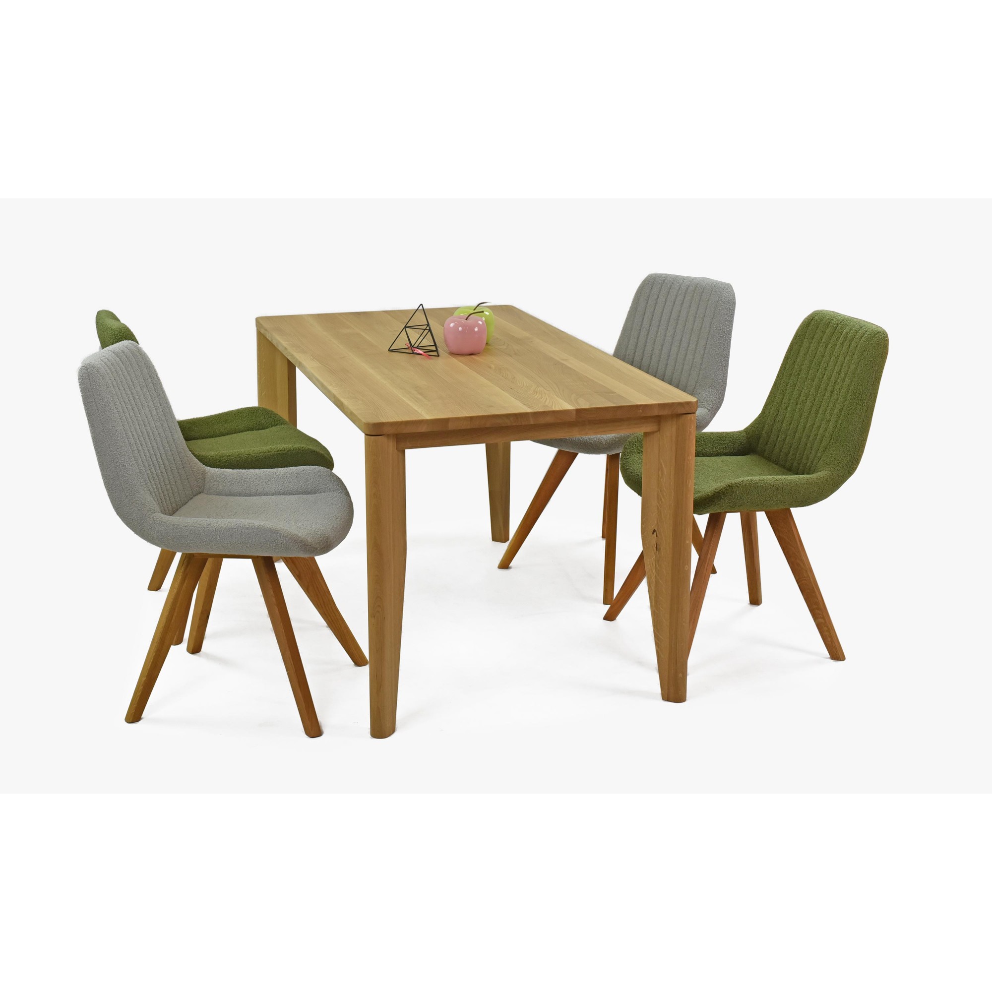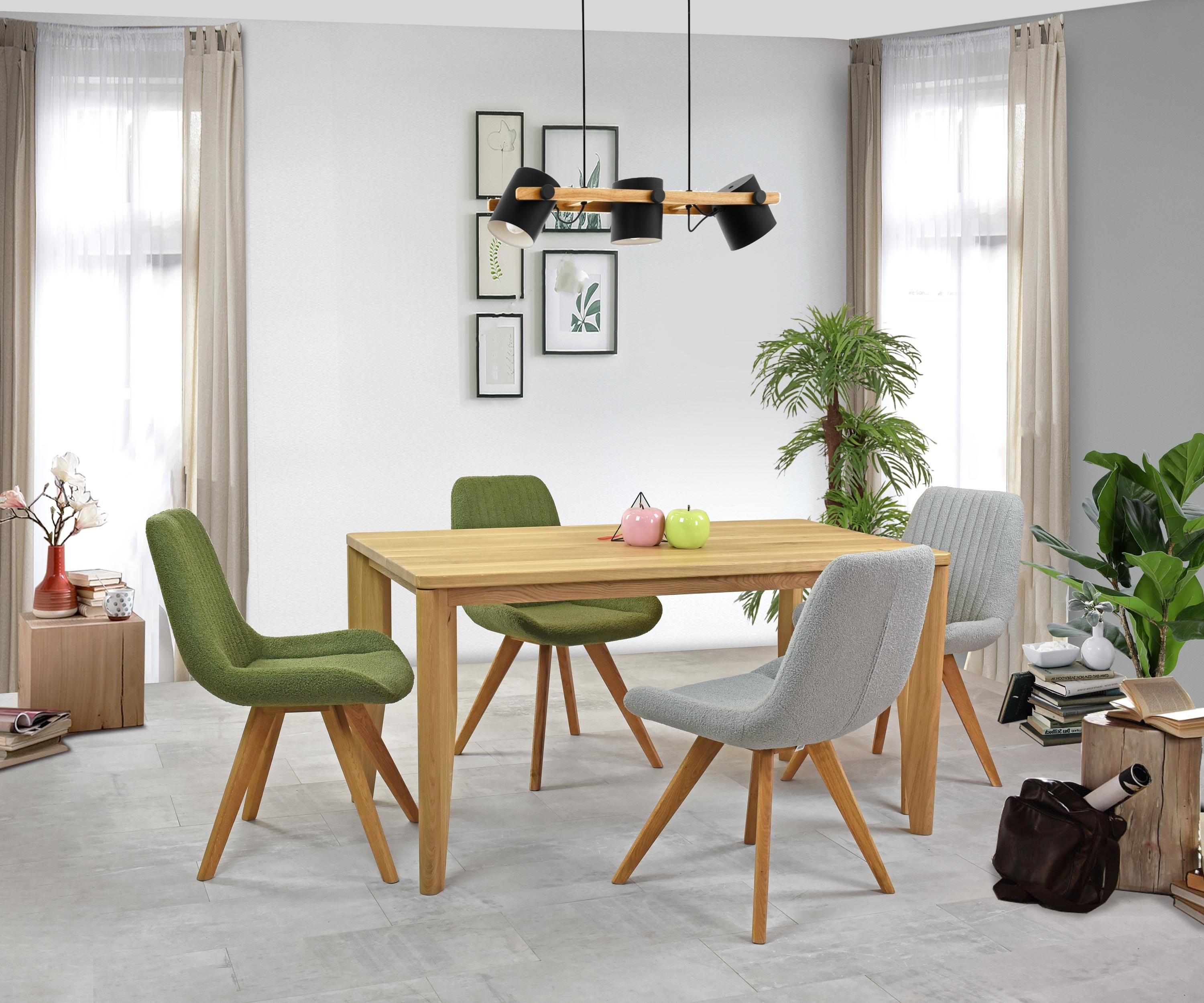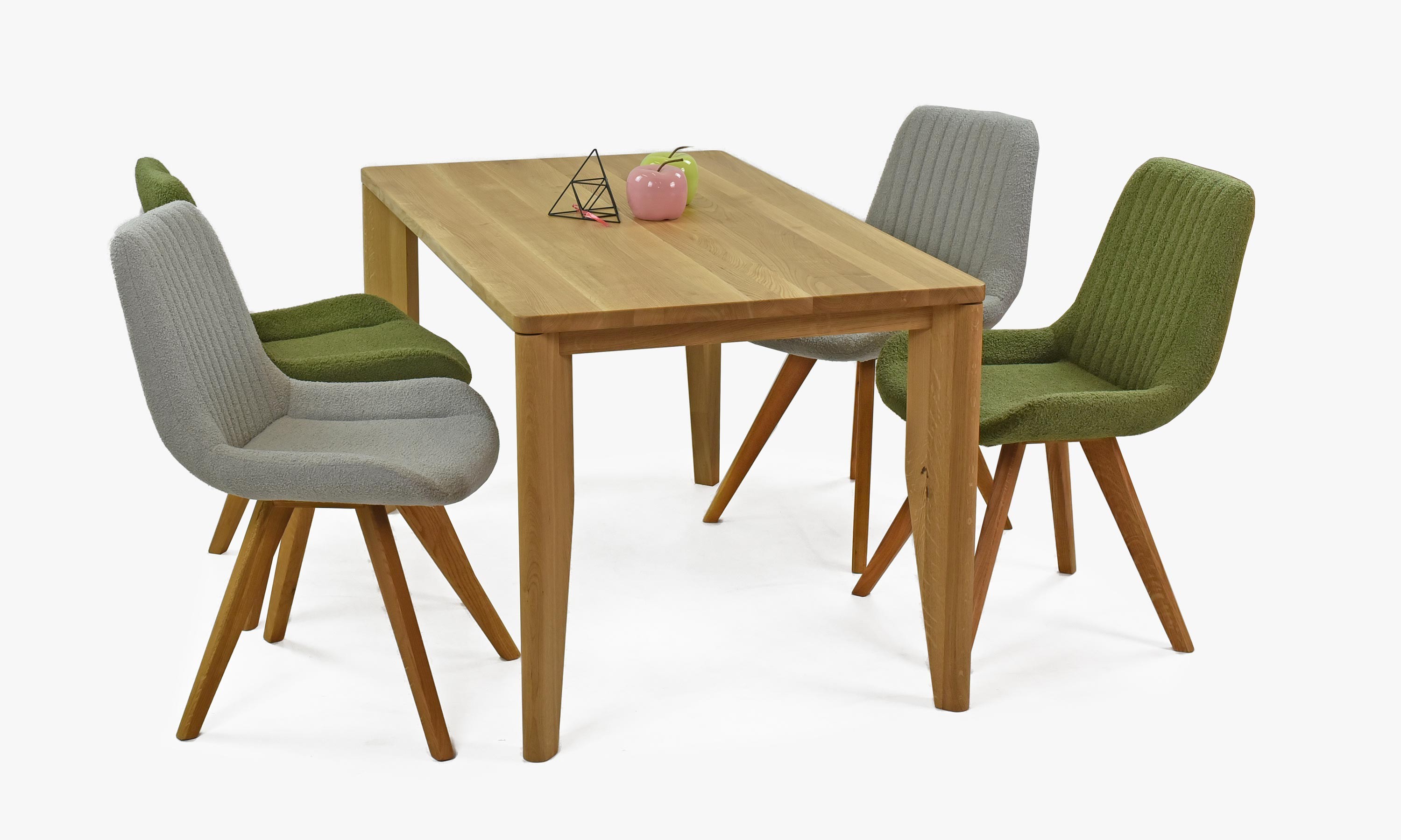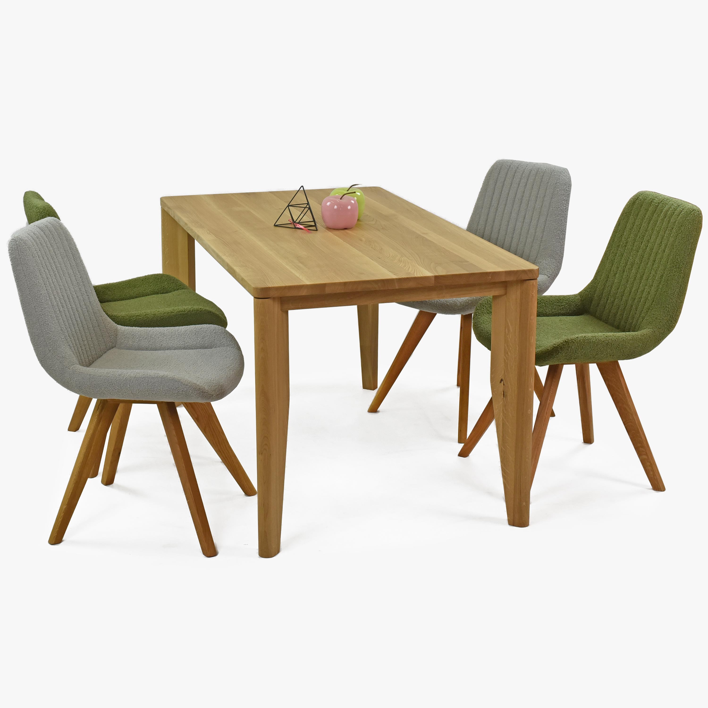 Die moderne Form des Stuhls mit Eichenbeinen in natürlicher Farbe verleiht Ihrem Esszimmer ein elegantes und zeitgemäßes Aussehen. Der Stoff des Stuhls besteht aus recycelbarem Material, das nicht nur ökologisch, sondern auch sehr widerstandsfähig und pflegeleicht ist. Sie brauchen sich keine Sorgen um die Strapazierfähigkeit des Stoffes oder Abnutzung machen. Die grüne Polsterung fühlt sich sehr angenehm an und erinnert an Samt, was maximalen Sitzkomfort garantiert. Die Eichenbeine sind geölt, um ihre lange Lebensdauer und Festigkeit zu gewährleisten. Der Stuhl trägt somit auch höhere Belastungen problemlos. Dank der hochwertigen Polsterung und der gepflegten Holzbeine reicht regelmäßiges Abwischen mit einem Tuch, damit der Stuhl wie neu aussieht.