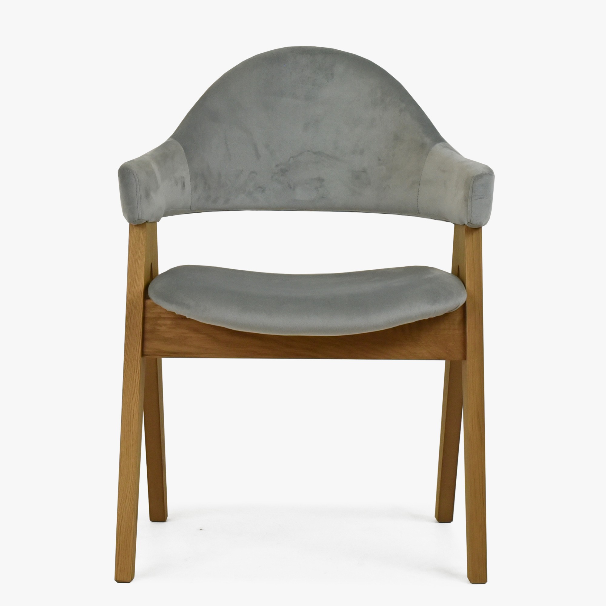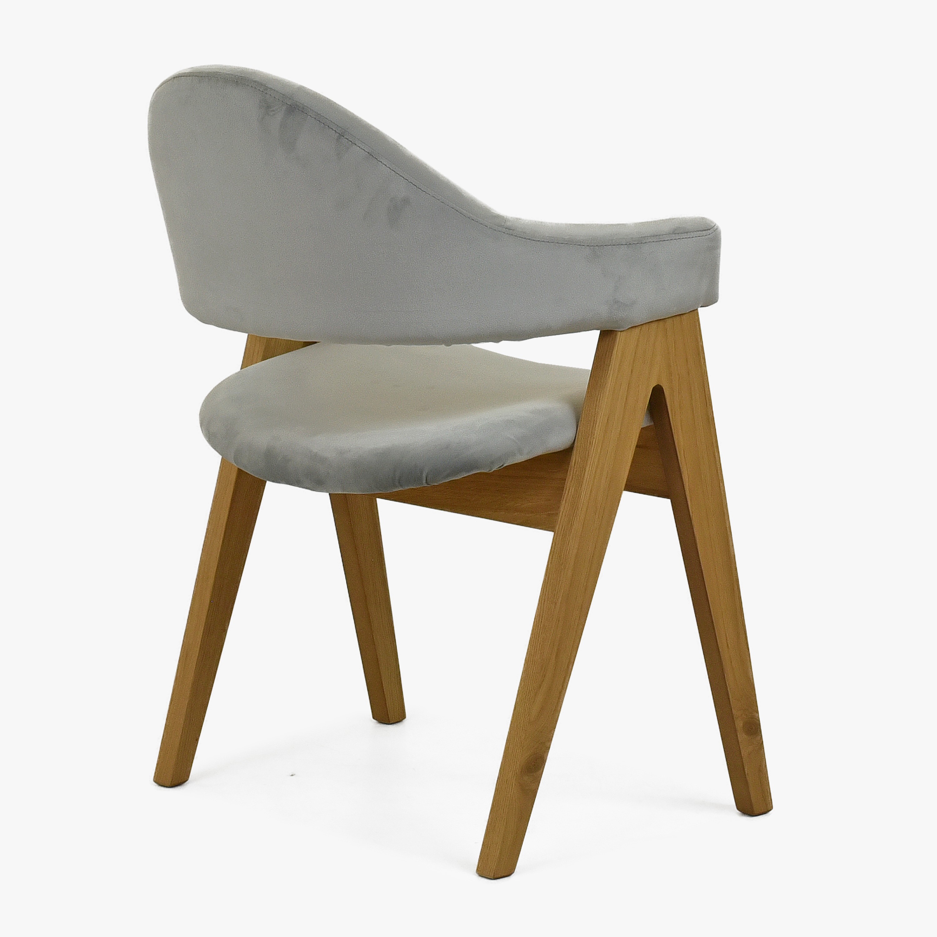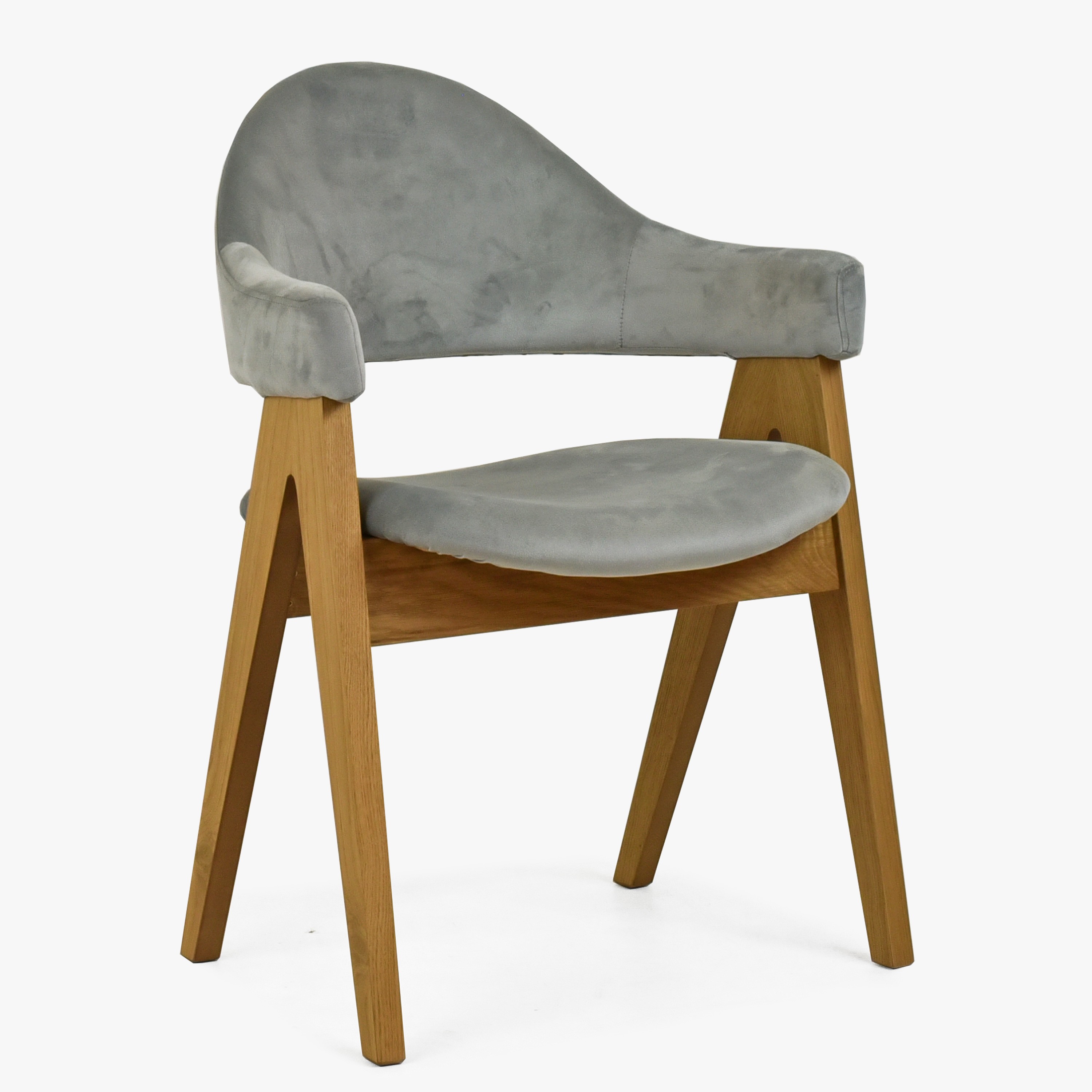 Wir bieten Ihnen einen modernen Esszimmerstuhl an, der aus hochwertigem Stoff mit feiner Samtoberfläche in hellem Farbton gefertigt ist. Dieses Designstück verbindet Schönheit und Komfort in einem. Seine abgerundete Form bietet unvergleichlich bequemes Sitzen. Der Stuhl ist fest mit eleganten Beinen aus widerstandsfähigem Eichenholz verbunden. Diese Kombination aus natürlichem Material und modernem Stoff verleiht dem Produkt einen luxuriösen Touch. Ihr Esszimmer erhält ein stilvolles und geschmackvolles Accessoire, das sofort Aufmerksamkeit erregt. Es spielt keine Rolle, ob Sie ihn am Esstisch platzieren oder als einzelnes Einrichtungsstück im Wohnzimmer oder Büro verwenden – dieser Stuhl bringt Eleganz und Komfort in einem großartigen Design in Ihren Raum.