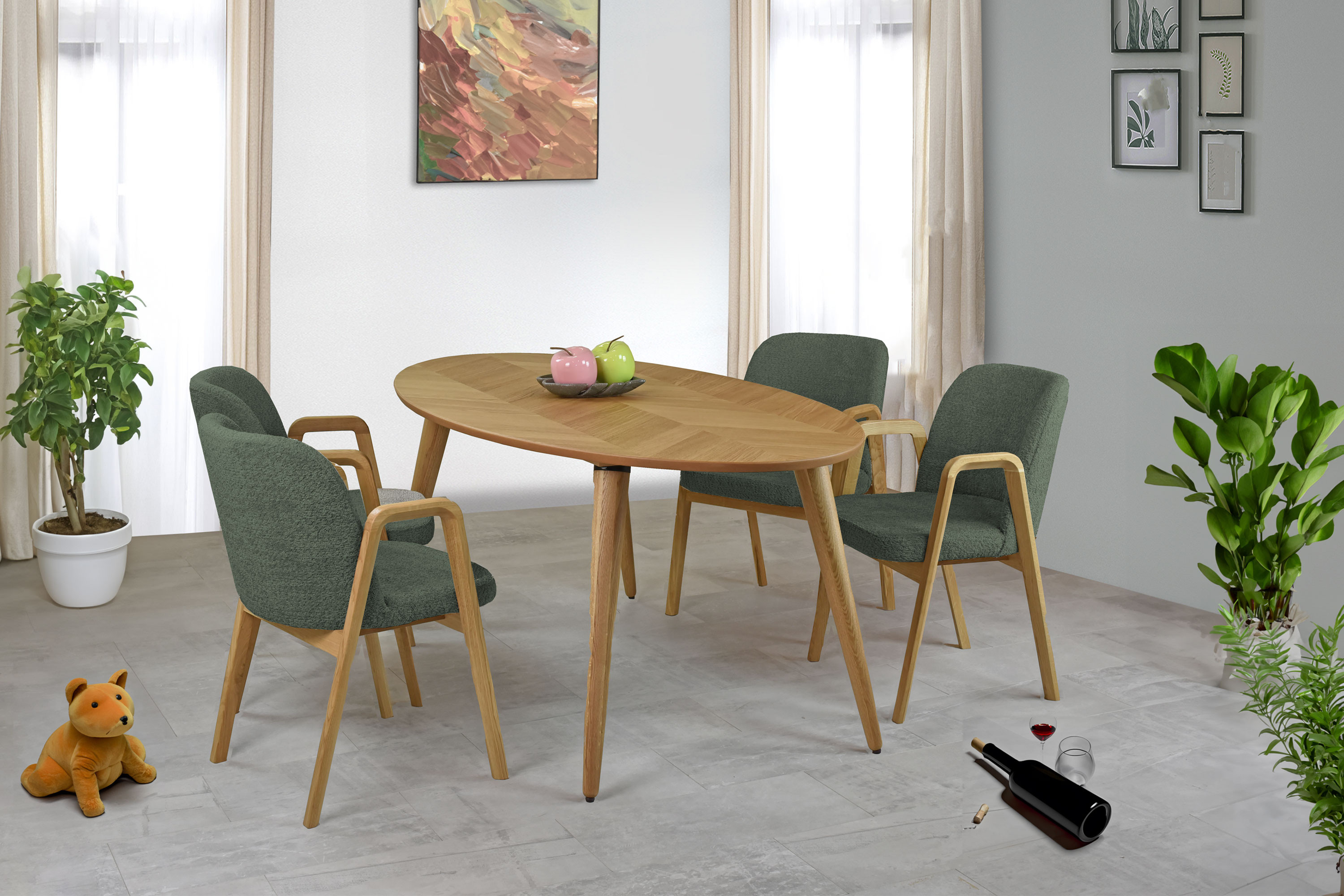 Moderner Esszimmerstuhl in einem außergewöhnlich attraktiven Stoff. Der Stoff ist in der Farbe Grün gehalten. Origineller und außerordentlich weicher Stoff mit spezifischer Bouclé-Struktur und einem verborgenen, feinen Fischgräten-Design. Der Stuhl hat eine abgerundete Form. Schon auf den ersten Blick begeistert er mit seinem Design und einem außergewöhnlich hohen Sitzkomfort. Verwendet wird Holz aus Eiche, behandelt mit natürlichem Öl, das das Möbel schützt und gleichzeitig die Holzstruktur hervorhebt. Der Stuhl wird bereits montiert geliefert.