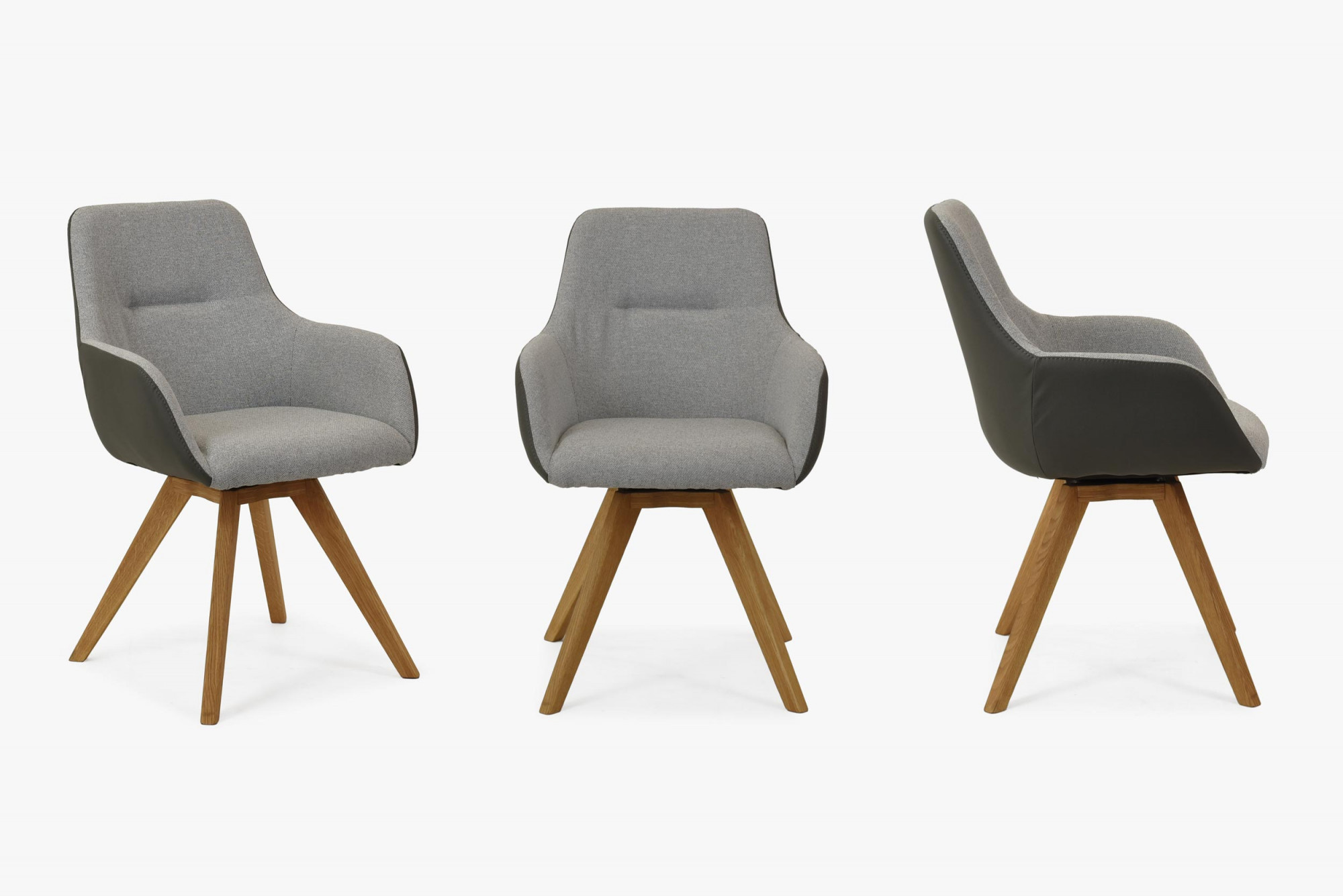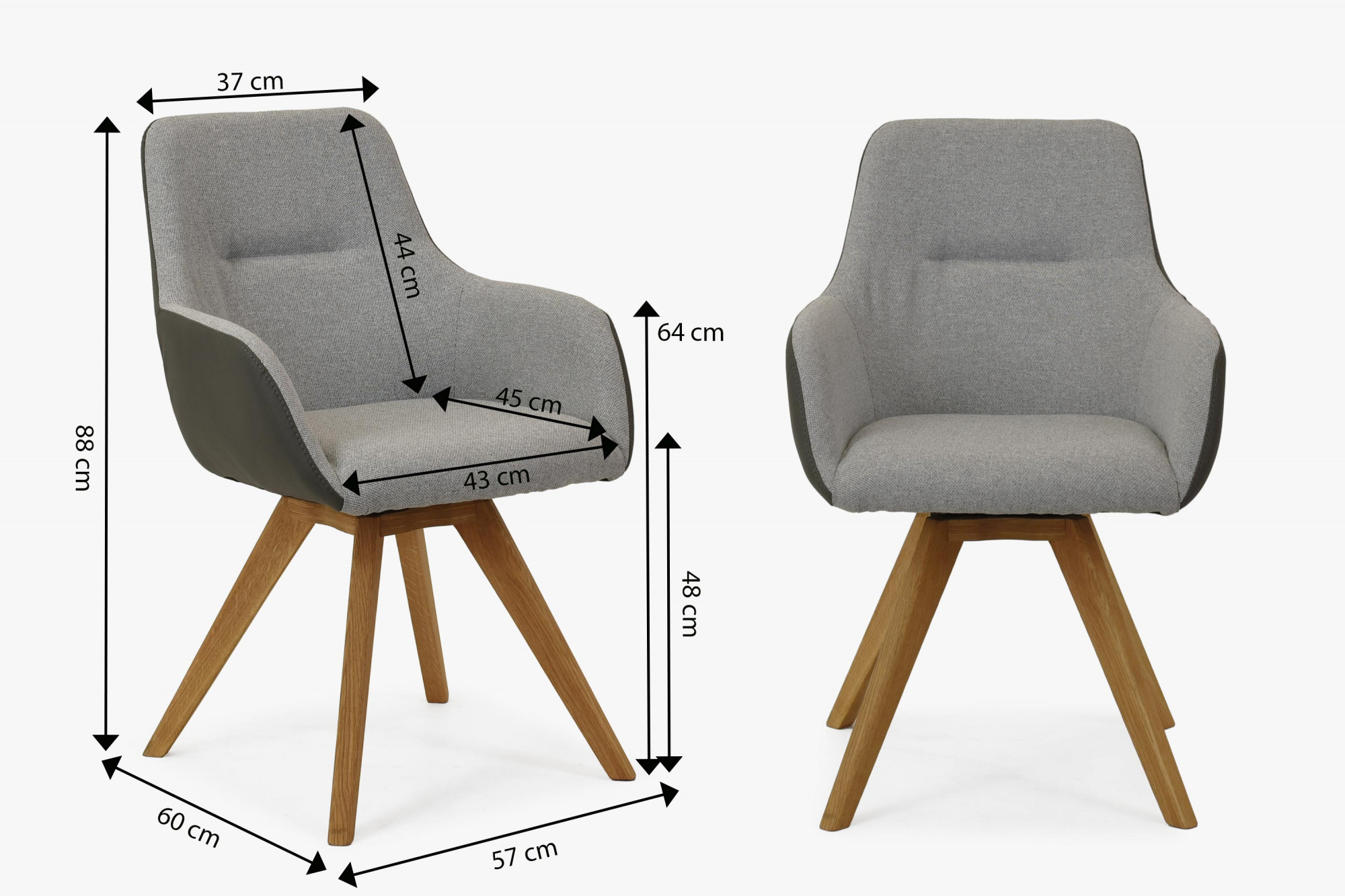 Moderner Esszimmerstuhl mit drehbarer Sitzfläche ist die ideale Ergänzung für Ihr Zuhause. Die Beine des Sessels sind aus Eichenholz gefertigt, das mit natürlichem Öl in Eichen-Naturell behandelt wurde, was nicht nur ein schönes Aussehen, sondern auch eine lange Lebensdauer gewährleistet. Dieser Stuhl eignet sich für verschiedene Einrichtungsstile und lässt sich leicht mit anderem Möbel aus Eichenholz kombinieren. Dank des FSC-Zertifikats für Holz können Sie sicher sein, dass Ihr Stuhl aus nachhaltigen Quellen stammt. Die Sitzfläche ist drehbar, was die Funktionalität erhöht und eine bequeme Nutzung am Esstisch oder sogar am Schreibtisch ermöglicht. Der dunkelgraue Stoff auf der Rückseite des Stuhls wirkt elegant und ahmt angenehm natürliches Leder nach, während der graue Stoff auf der Vorderseite das moderne Erscheinungsbild ergänzt und ein komfortables Sitzgefühl bietet. Der Stuhl Colmar ist eine hervorragende Wahl für alle, die stilvolle, bequeme und funktionale Möbel für ihr Zuhause suchen.