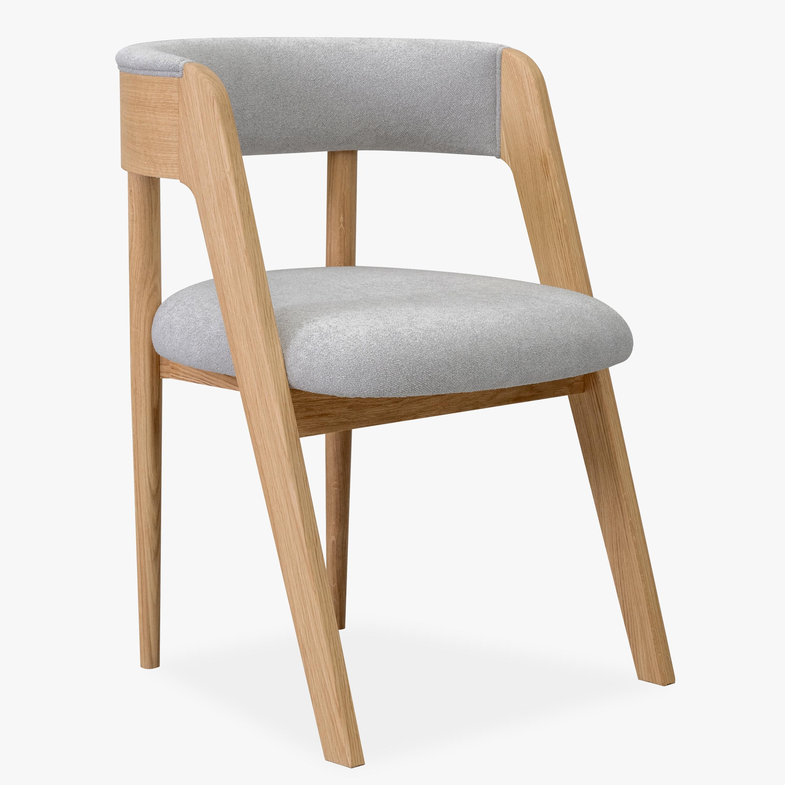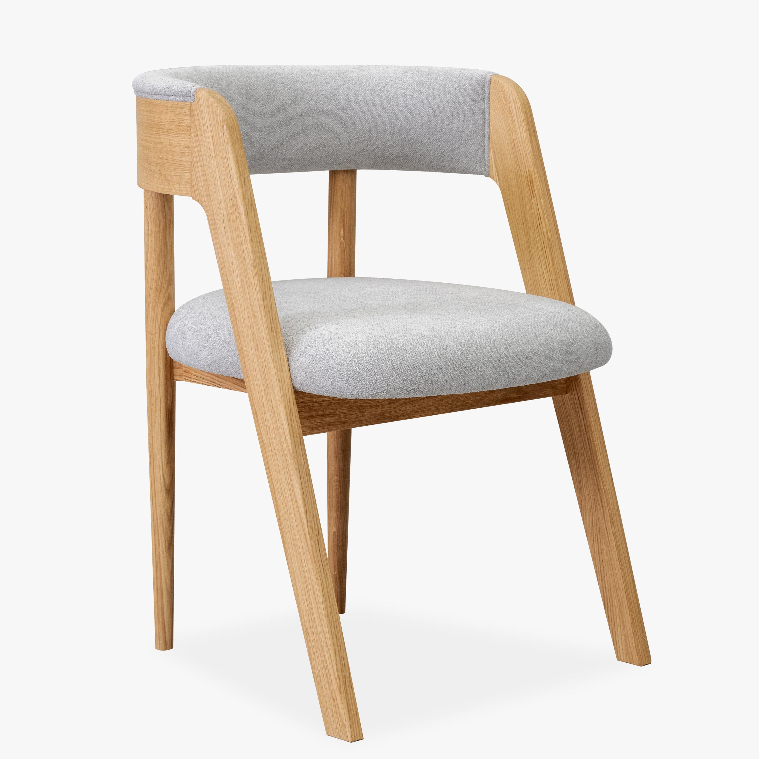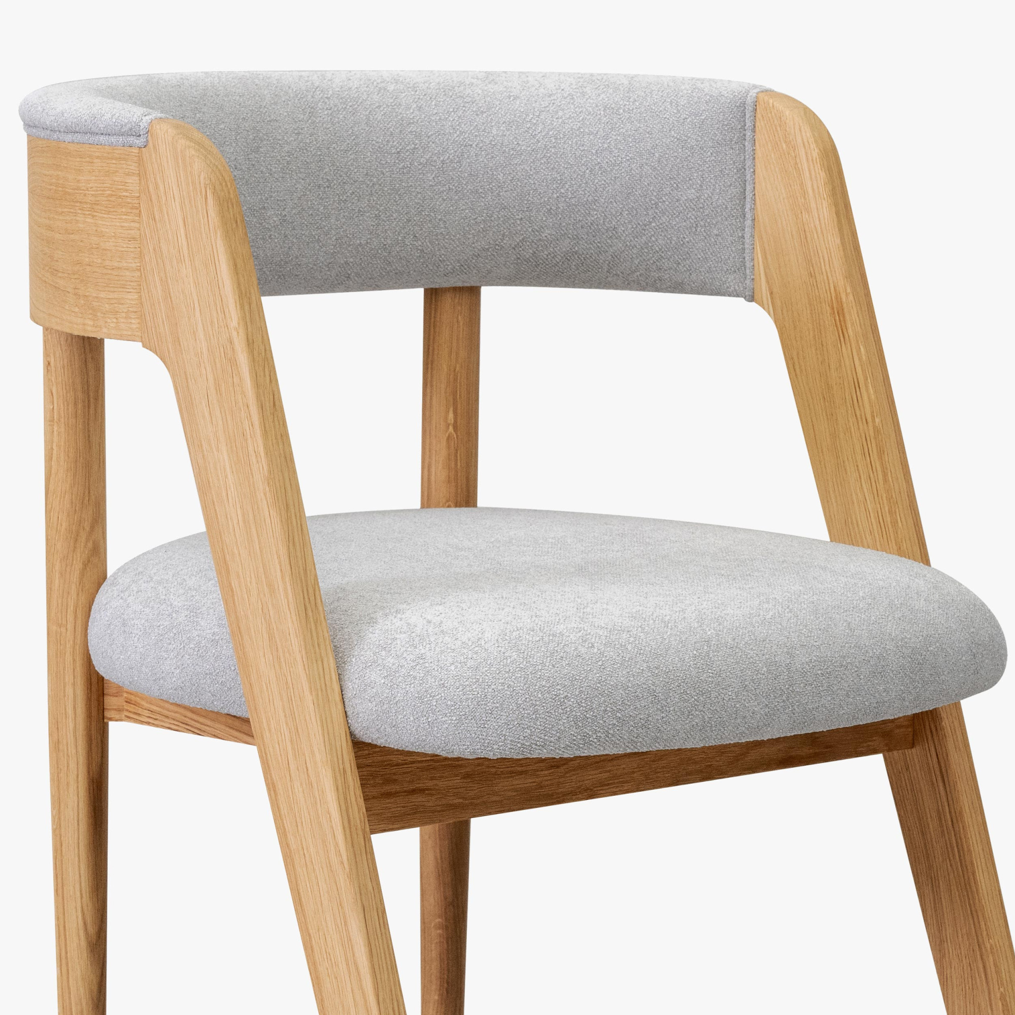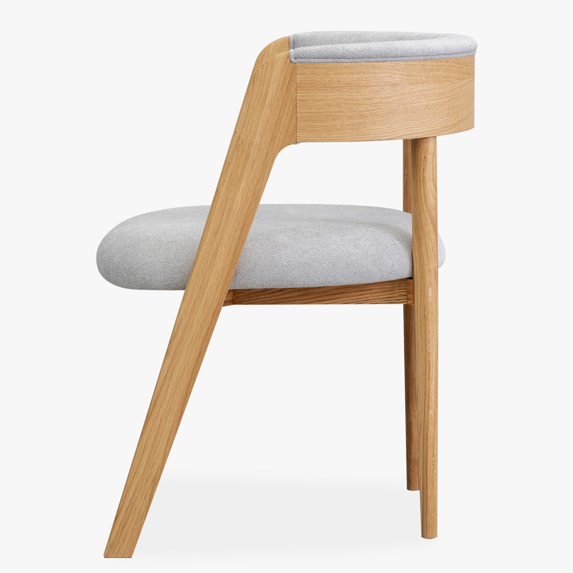 Dieser elegante Stuhl betont modernes, minimalistisches Design, während seine organischen Linien und natürlichen Materialien ein Gefühl von Wärme und Komfort in jeden Innenraum bringen. Der hochwertige Eichenrahmen ist mit mattem Lack behandelt, der die natürliche Struktur und Farbe des Holzes hervorhebt und gleichzeitig Beständigkeit und Langlebigkeit bietet. Sitzfläche und Rückenlehne sind mit Bouclé-Stoff in Grauton bezogen, der außergewöhnlichen Komfort bietet und sich angenehm anfühlt, dabei aber auch Abriebfestigkeit garantiert.