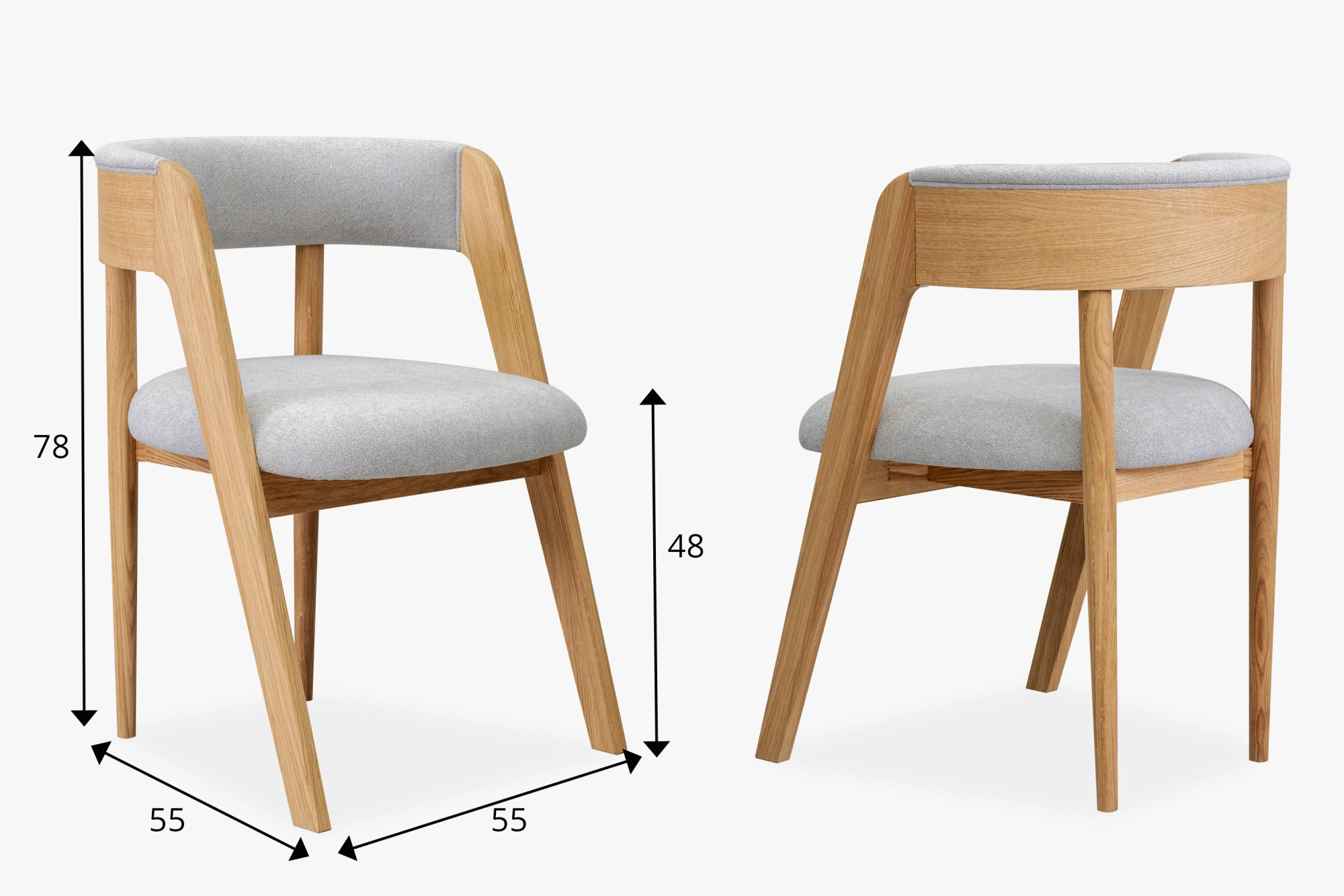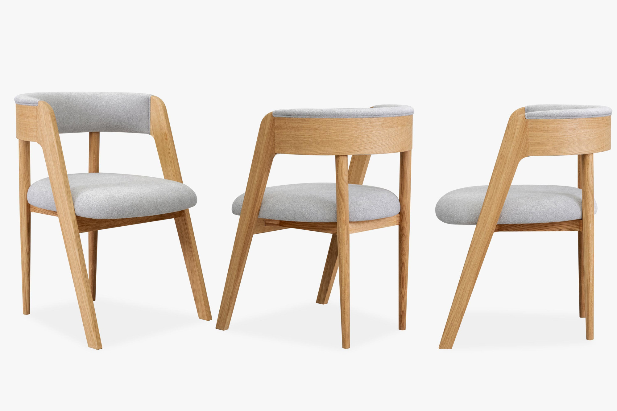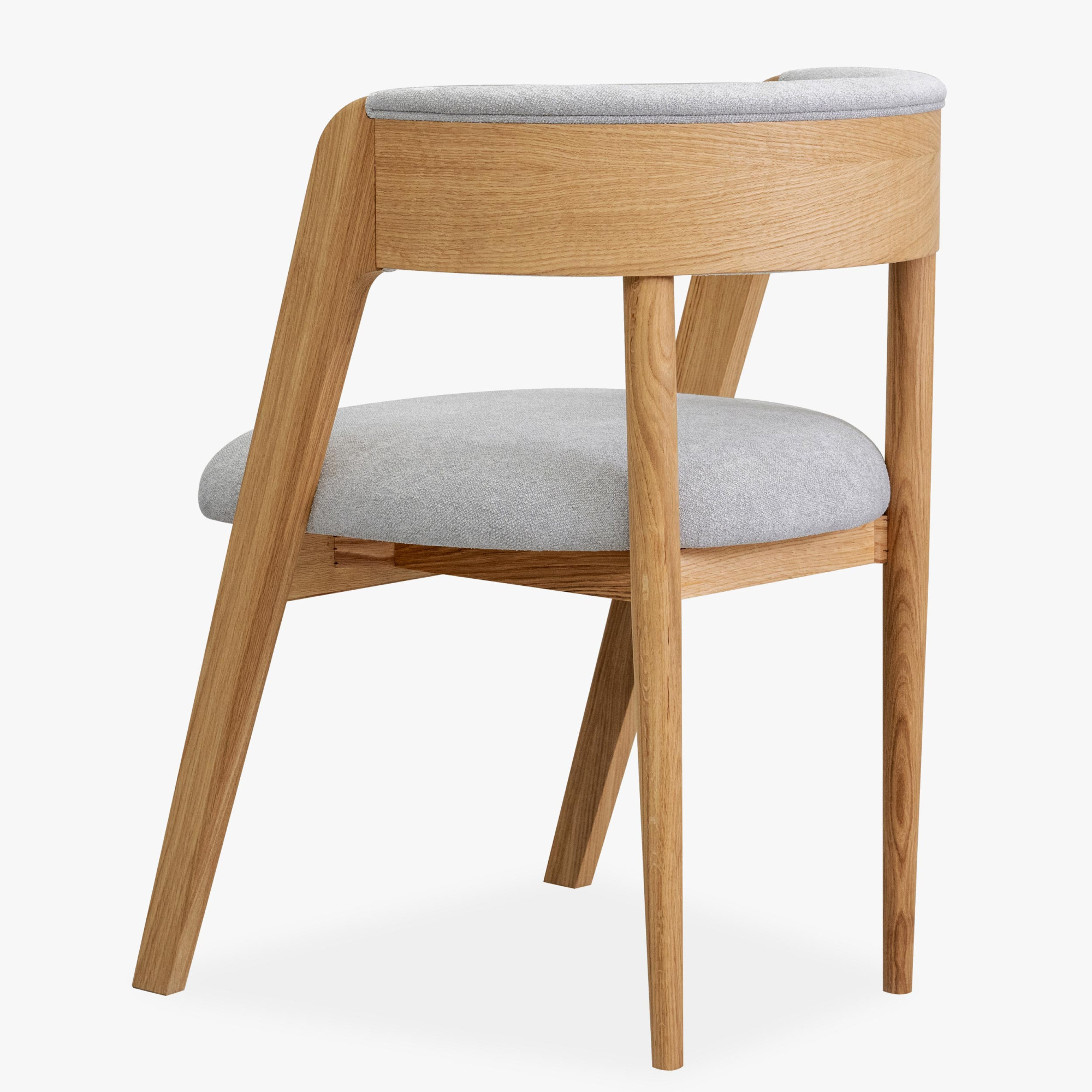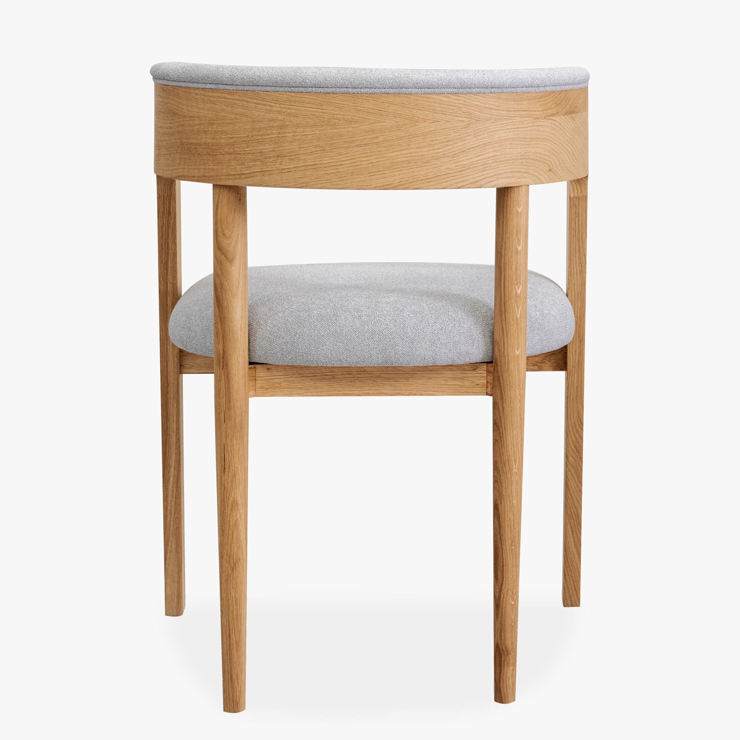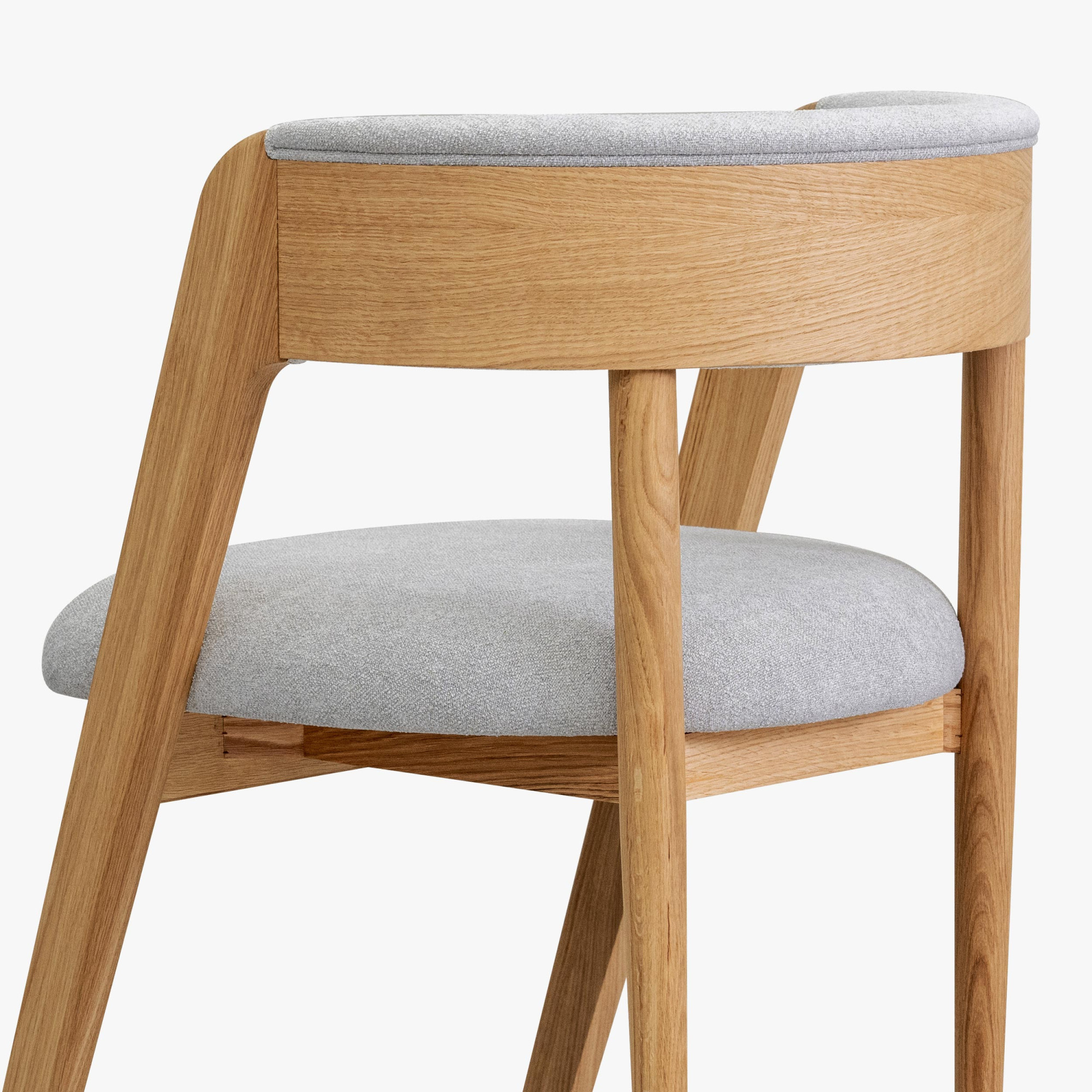 Dieser elegante Stuhl betont modernes, minimalistisches Design, während seine organischen Linien und natürlichen Materialien ein Gefühl von Wärme und Komfort in jeden Innenraum bringen. Der hochwertige Eichenrahmen ist mit mattem Lack behandelt, der die natürliche Struktur und Farbe des Holzes hervorhebt und gleichzeitig Beständigkeit und Langlebigkeit bietet. Sitzfläche und Rückenlehne sind mit Bouclé-Stoff in Grauton bezogen, der außergewöhnlichen Komfort bietet und sich angenehm anfühlt, dabei aber auch Abriebfestigkeit garantiert.