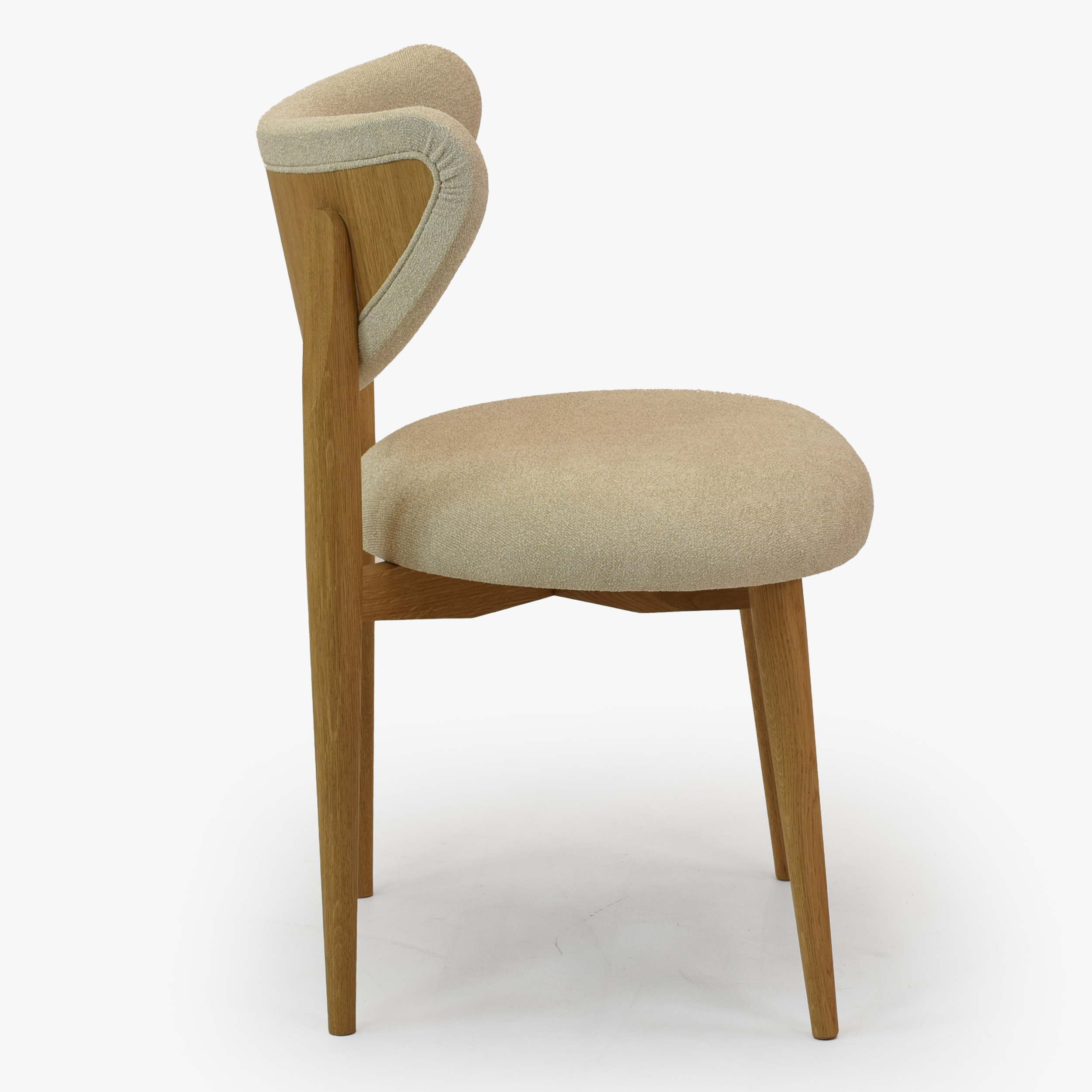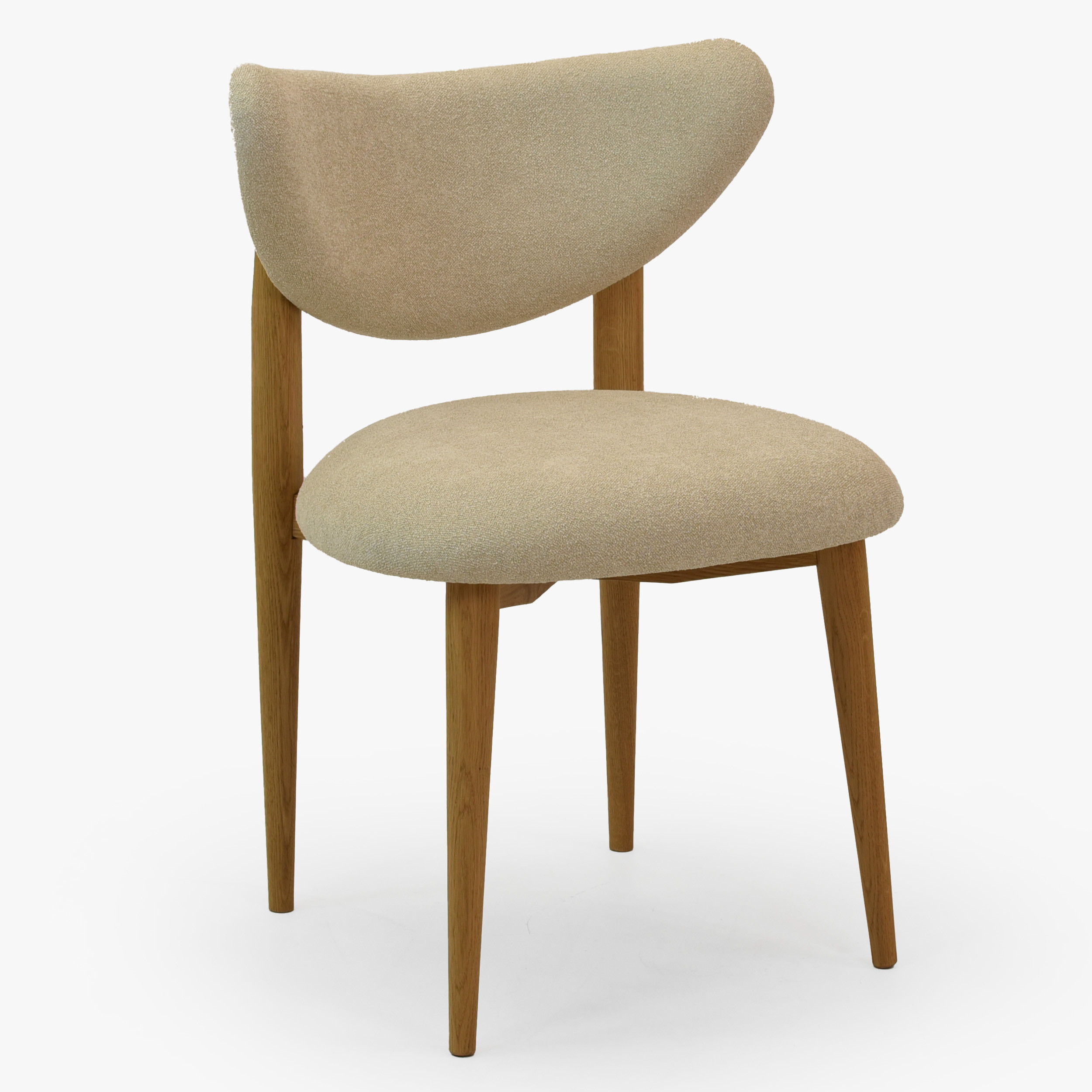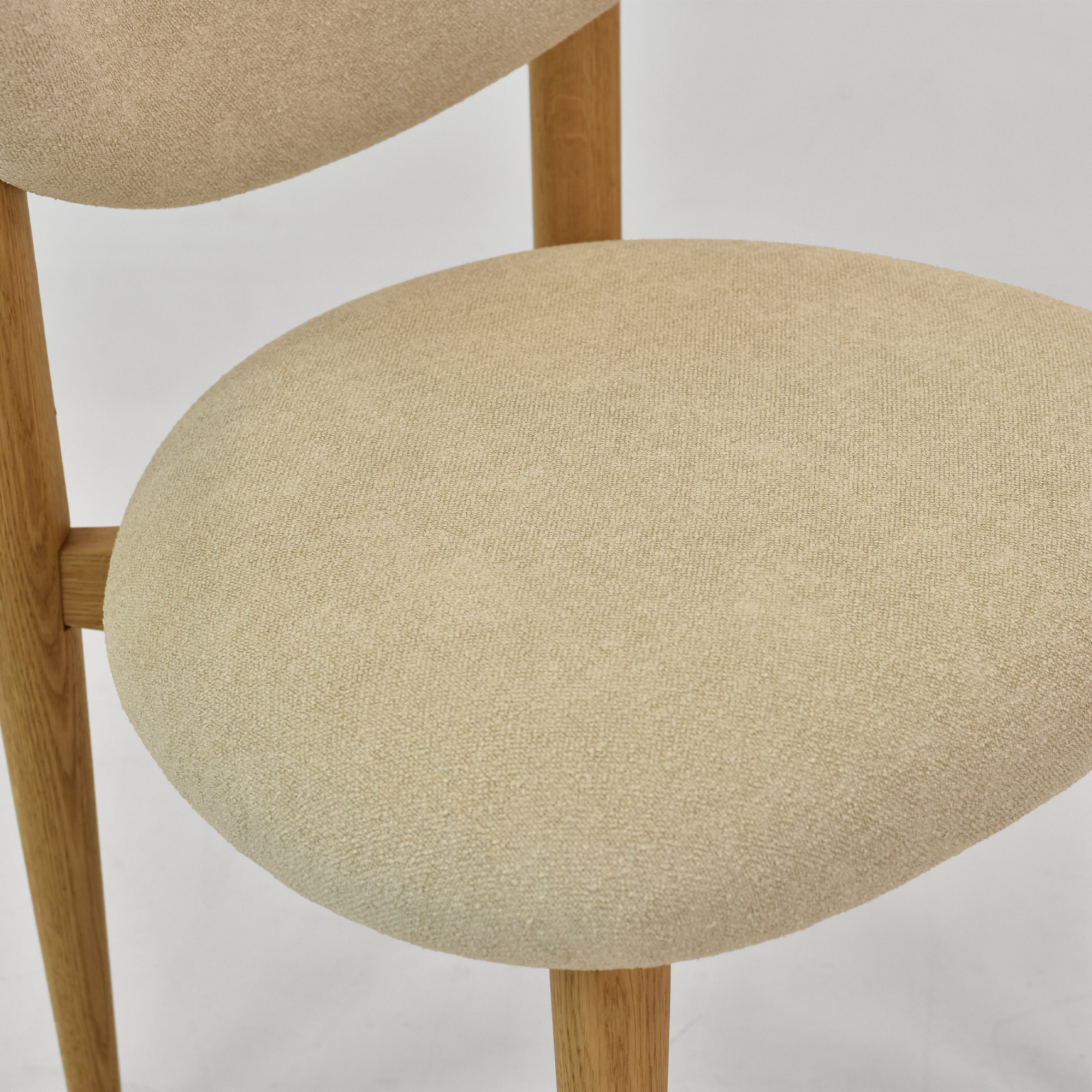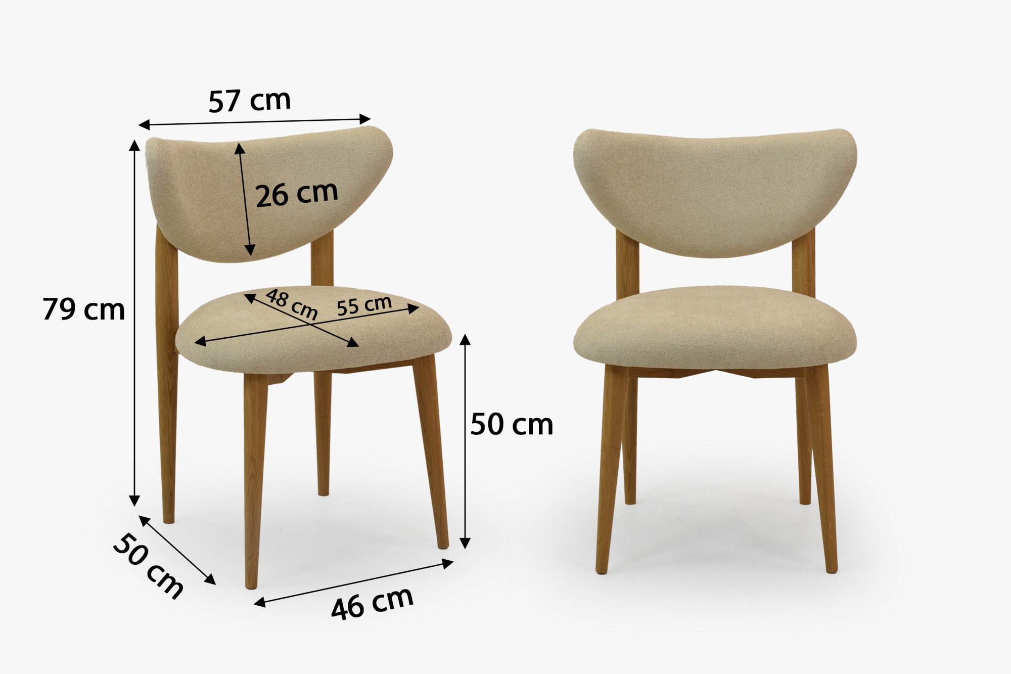 Die ergonomisch geformte Lehne garantiert Komfort auch bei langen Abendessen, während die Belastbarkeit von 120 kg die Robustheit des Eichenrahmens bestätigt. Der Stoff lässt sich leicht mit destilliertem Wasser und neutraler Seife reinigen, sodass sein Aussehen ohne aufwändige Pflege erhalten bleibt. Der Stuhl wird vollständig montiert geliefert, einfach auspacken und Platz nehmen. Dank neutraler Töne und natürlicher Eiche lässt er sich perfekt mit weiteren Eichenmöbeln – von Esstischen bis zu Kommoden – kombinieren und schafft ein stimmiges, zeitloses Interieur.
