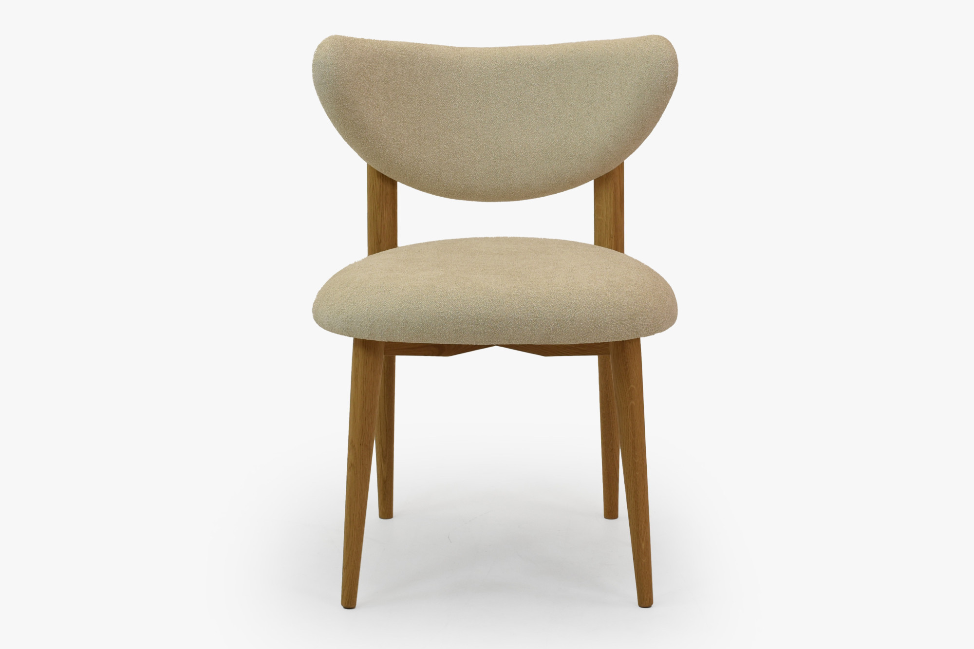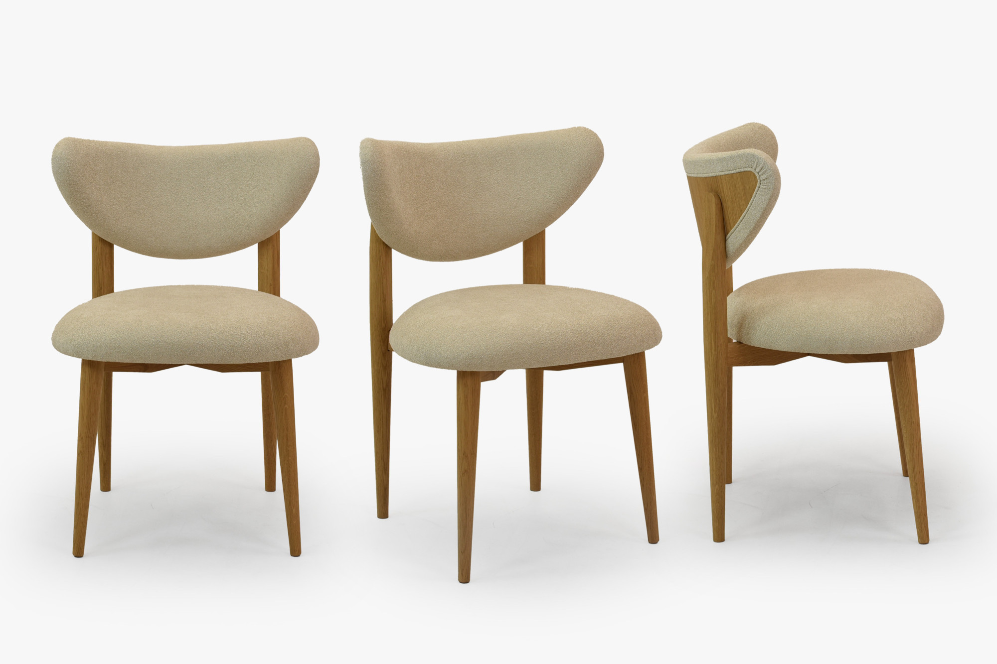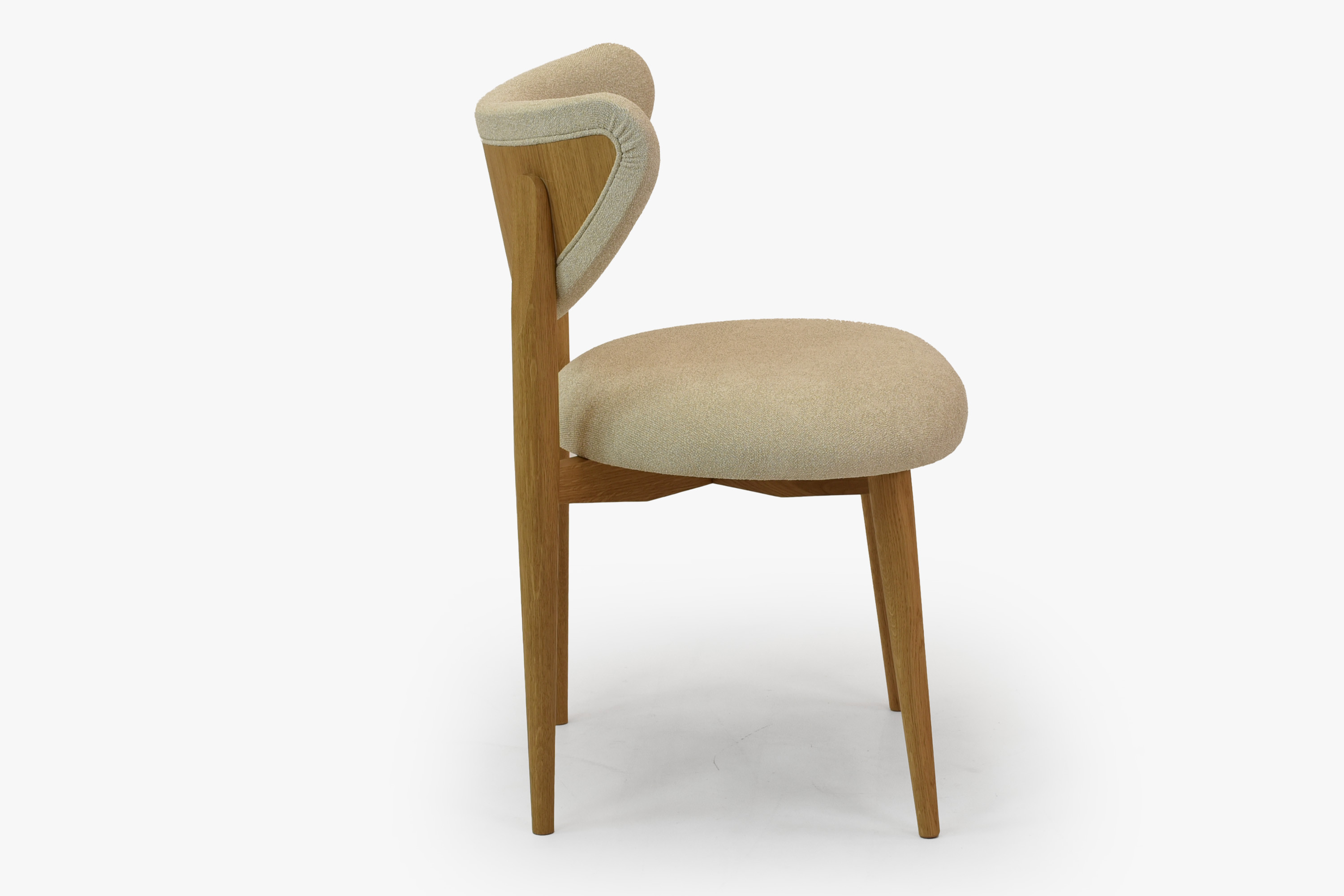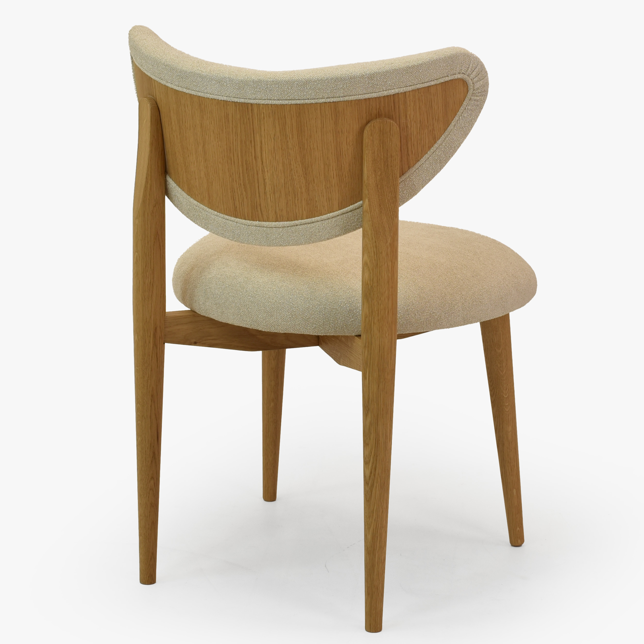 Die ergonomisch geformte Lehne garantiert Komfort auch bei langen Abendessen, während die Belastbarkeit von 120 kg die Robustheit des Eichenrahmens bestätigt. Der Stoff lässt sich leicht mit destilliertem Wasser und neutraler Seife reinigen, sodass sein Aussehen ohne aufwändige Pflege erhalten bleibt. Der Stuhl wird vollständig montiert geliefert, einfach auspacken und Platz nehmen. Dank neutraler Töne und natürlicher Eiche lässt er sich perfekt mit weiteren Eichenmöbeln – von Esstischen bis zu Kommoden – kombinieren und schafft ein stimmiges, zeitloses Interieur.